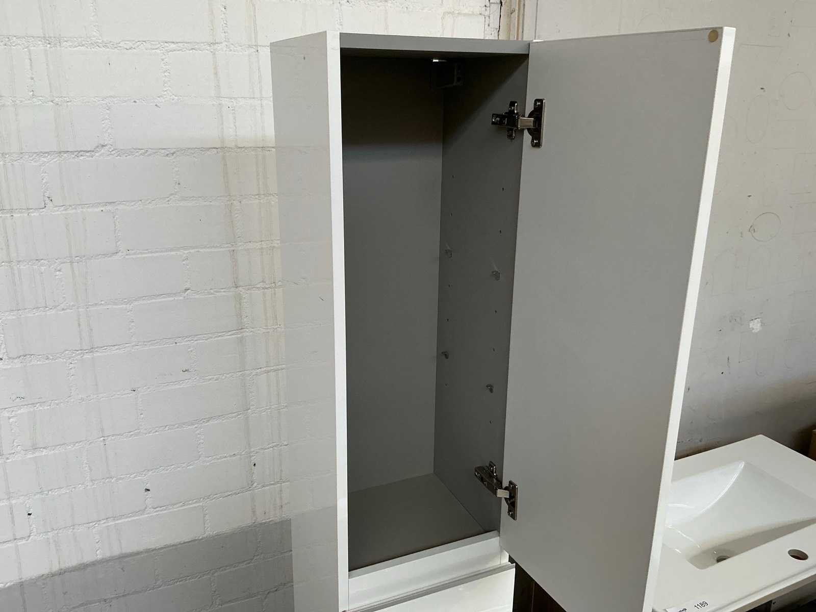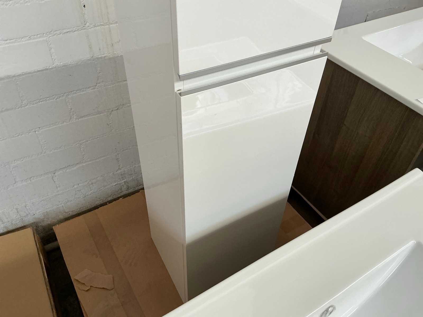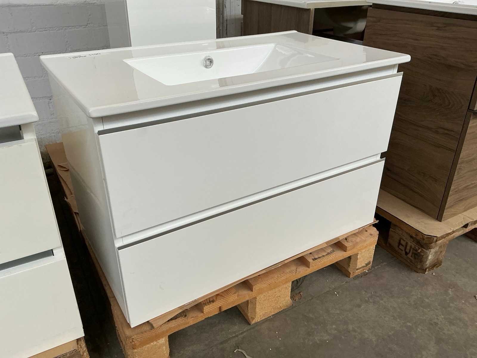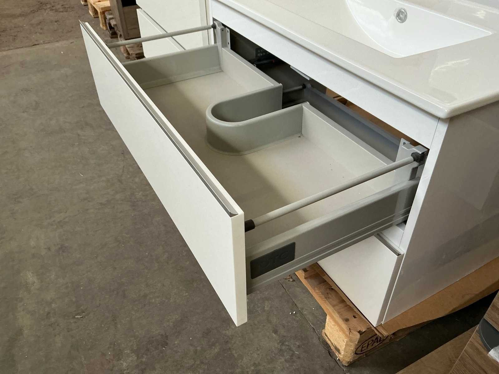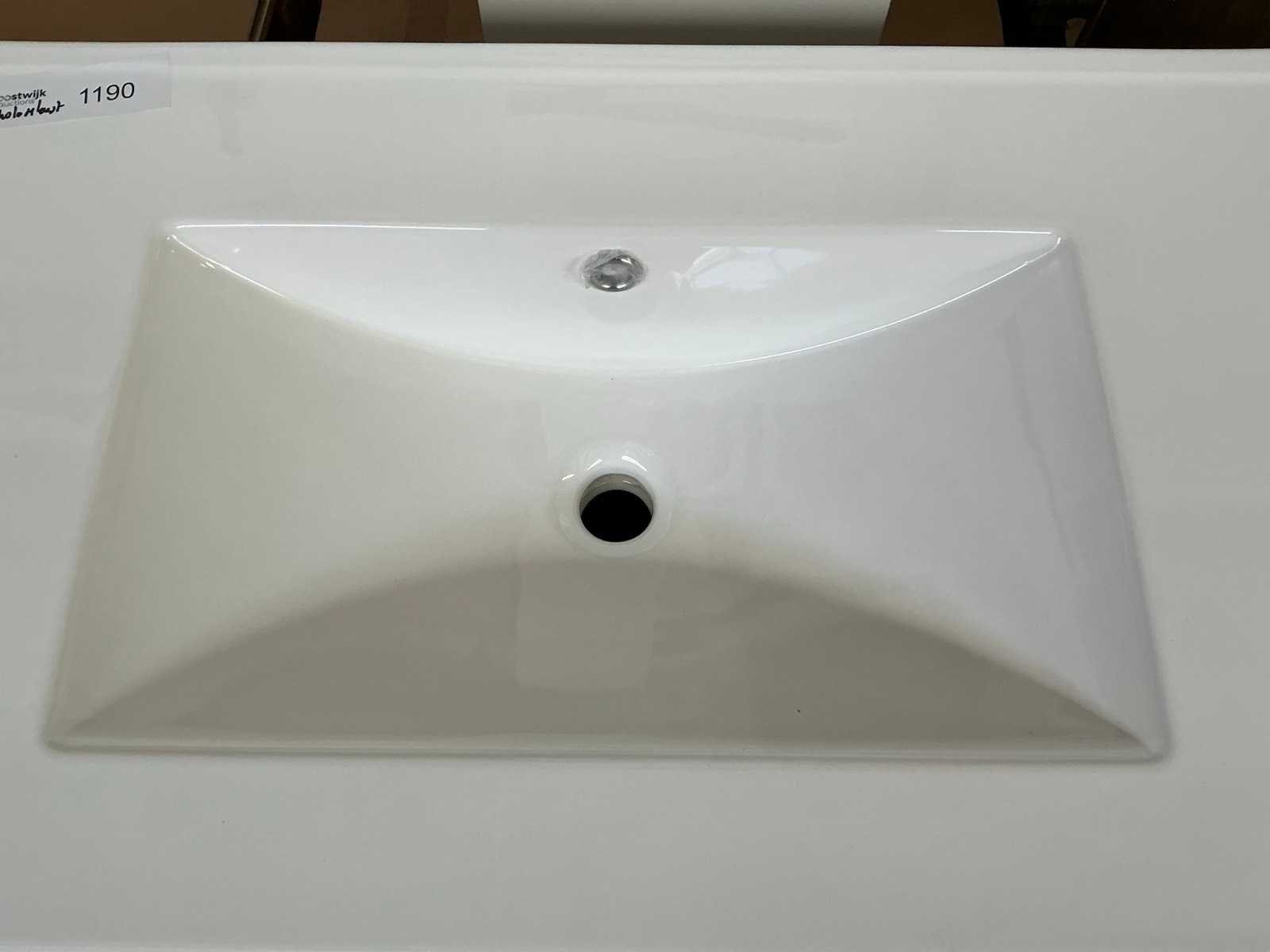 Hoogte: 52cm Lengte: 82cm Breedte: 42cm Materiaal: Hout/keramiek Kleur: Wit Wastafel: Ja, met waste. Geen kraangat Lades: 2 Softclose: true Afmeting hangkast: 30x30x160cm