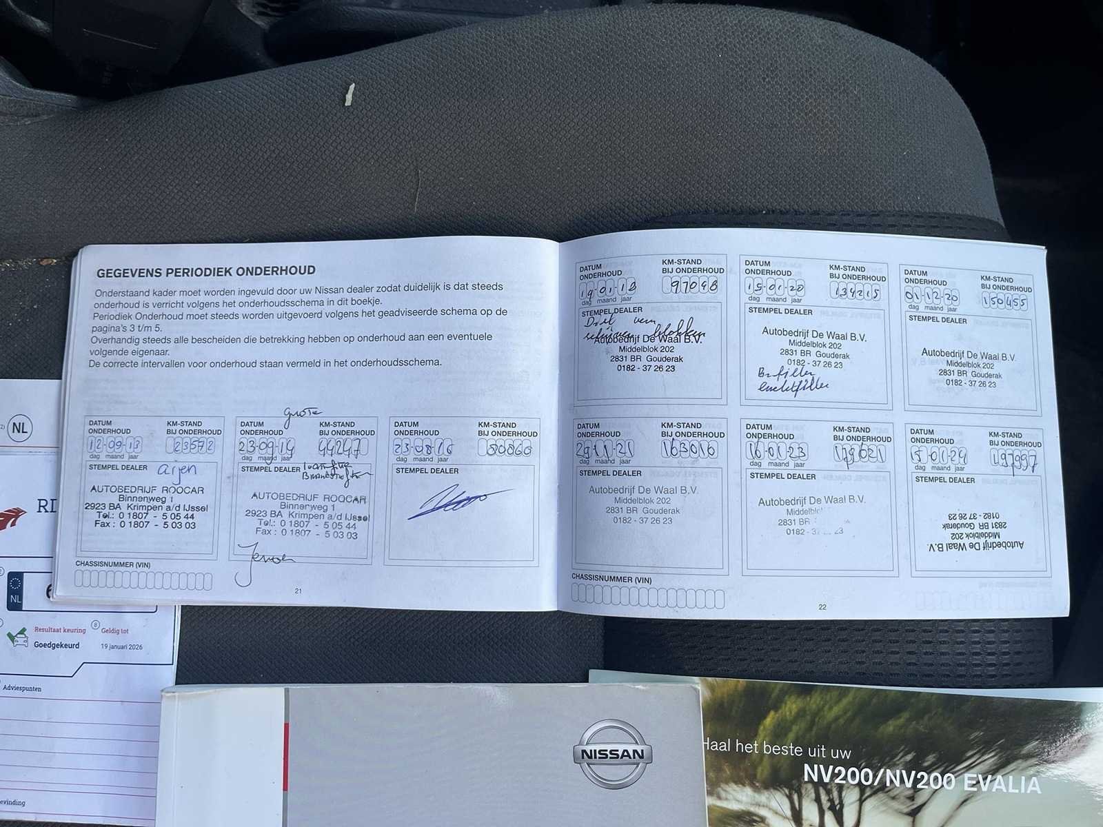 | CRUISE CONTROL | TREKHAAK | VOLLEDIG ONDERHOUDEN | SCHUIFDEUR RECHTS EN LINKS | ELEKTRISCHE RAMEN | Kenteken: 6-VST-72 Merk: Nissan Type: 1.5 dCi Acenta Model: NV200 Bouwjaar: 2012 Chassisnummer: VSKYBAM20U0033783 Afgelezen kilometerstand: 242646km Cilinderinhoud: 1461cc Vermogen (kW): 66kW Brandstof: Diesel Datum eerste toelating: 2012-01-11 Datum eerste toelating (NL): 2012-01-11 APK vervaldatum: 2026-01-19 NAP status: Logisch Aandrijving: Start en rijdt Transmissie: Handgeschakeld Aantal zitplaatsen: 2 Nationaliteit documenten: Nederland Stuurwiel: Linksgestuurd Bruto BPM (NL): 5970 Aantal sleutels: 1 Ledig gewicht: 1300kg Laadvermogen: 700kg Vermogen (pk): 89 Aantal cilinders: 4 Carrosserie: Gesloten opbouw Emissieklasse: 5 Onderhoudshistorie: Ja, aanwezig, danwel digitaal Startinformatie: Start en rijdt Maximaal trekgewicht ongeremd: 450 Maximaal trekgewicht geremd: 640