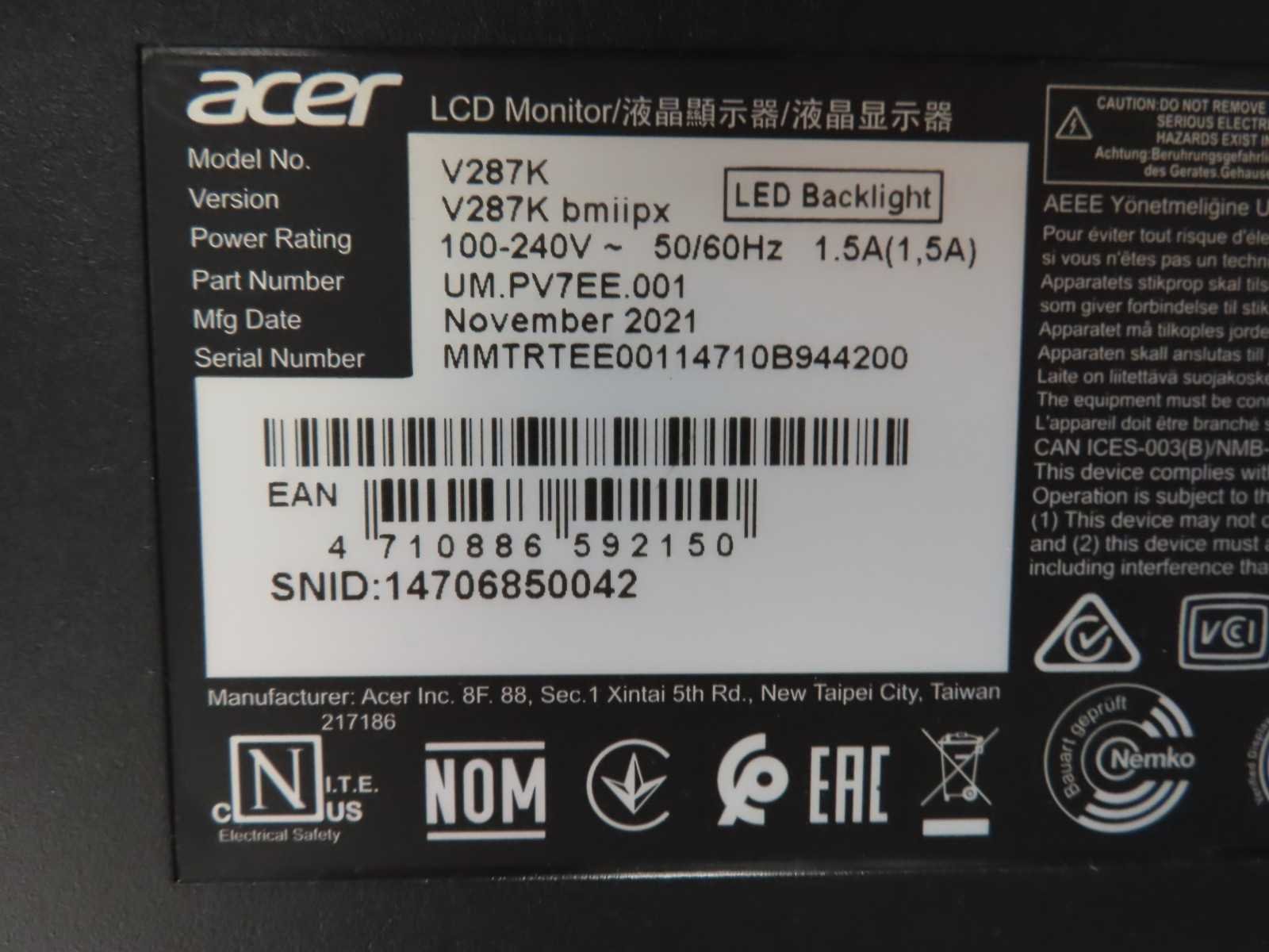 Merk: Acer Model: V287K Beelddiagonaal: 28''