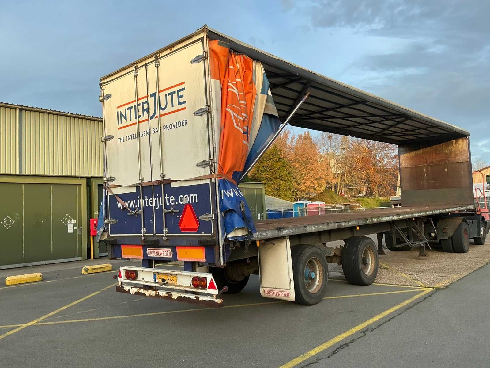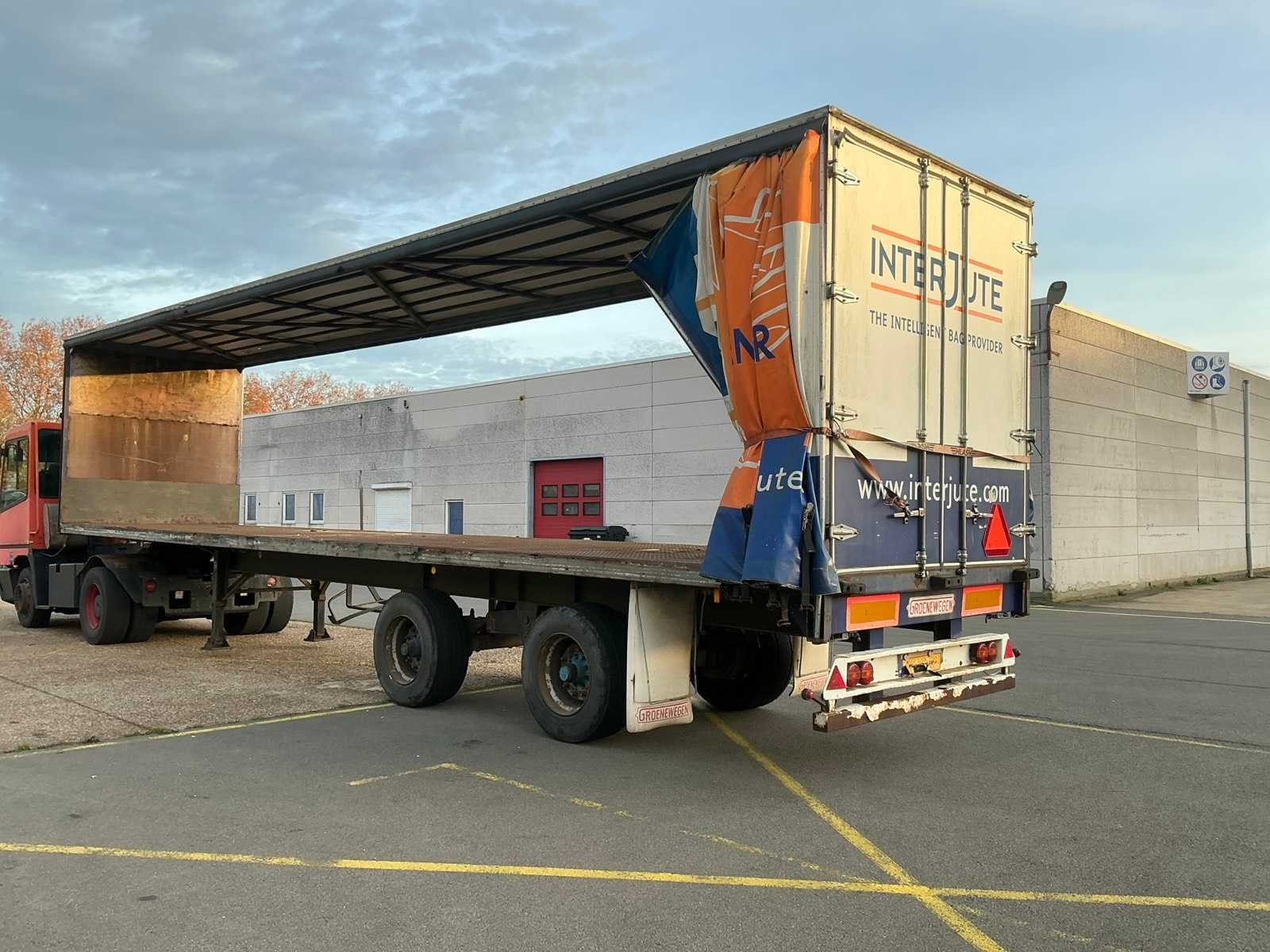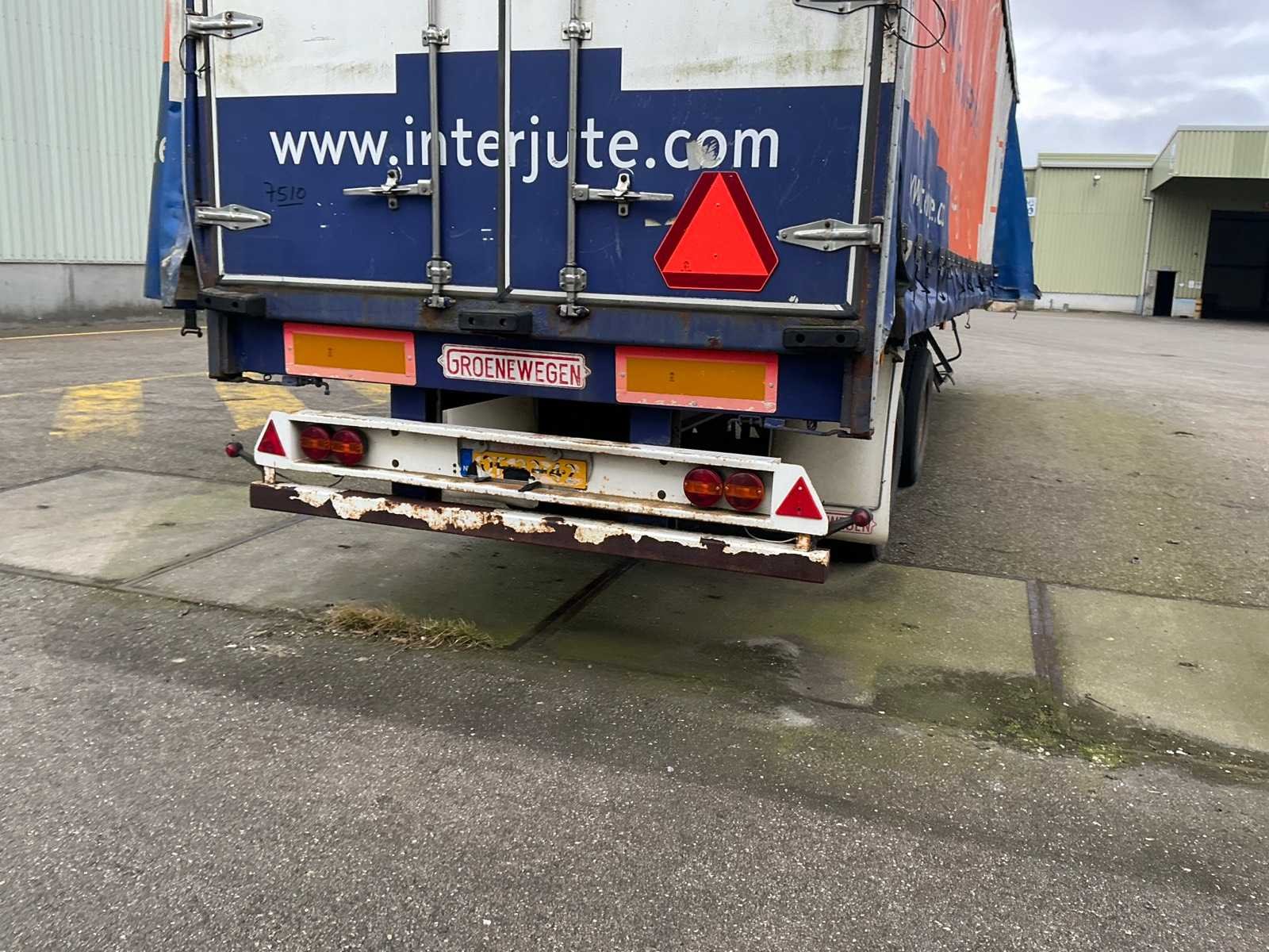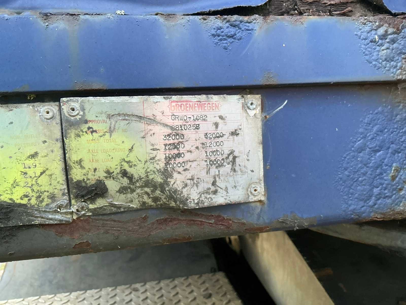 Max massa 32000kg, wielbasis 902cm; Hart koppeling achterzijde trailer 1150cm, bladgeveerde BPW assen, langdurig stil gestaan, schuifzeilen kapot Merk: Groenewegen Type: DRO-12-20 Bouwjaar: 1984 Chassisnummer VIN: 8810258 Kenteken: OF-23-42 Datum eerste toelating (NL): 1984-07-03 Datum eerste toelating: 1984-07-03 APK vervaldatum: 2017-04-05 Aantal assen: 2 Laadvermogen: 24700kg Eigen gewicht: 7300kg Totale afmeting L: 1280mm Totale afmeting Breedte: 2550mm Zelf rijdend exporteren: Nee No self drive export!: true