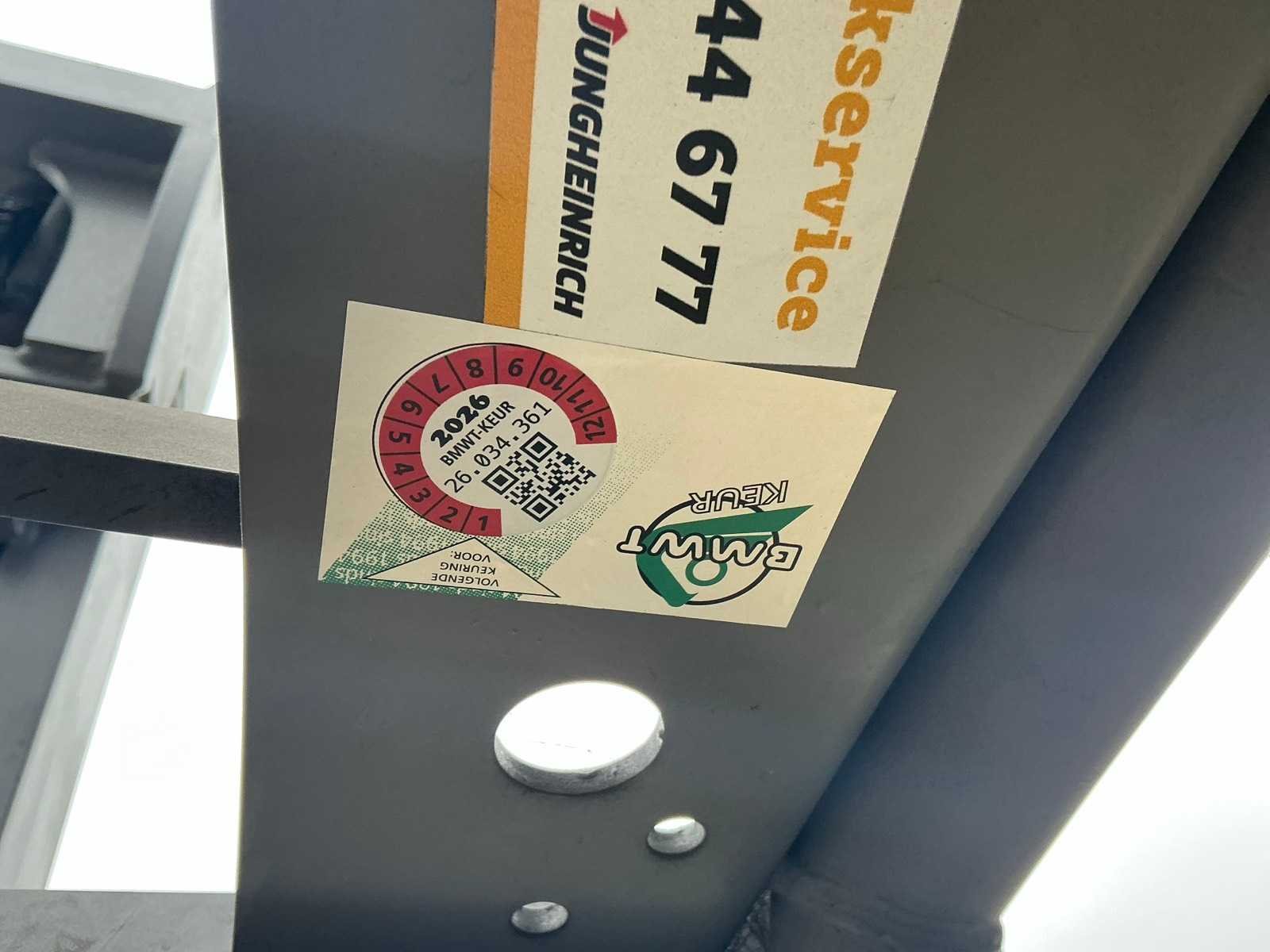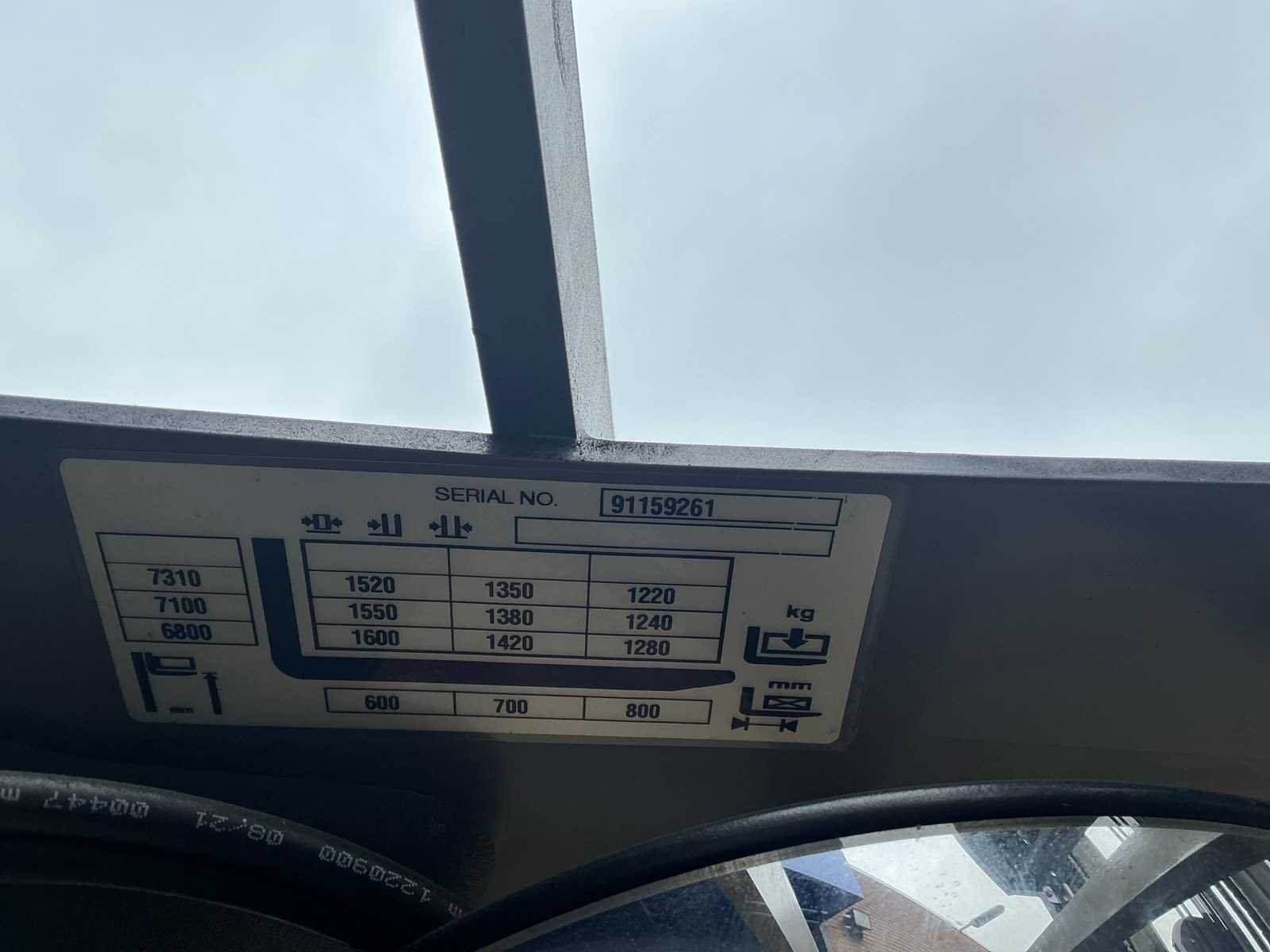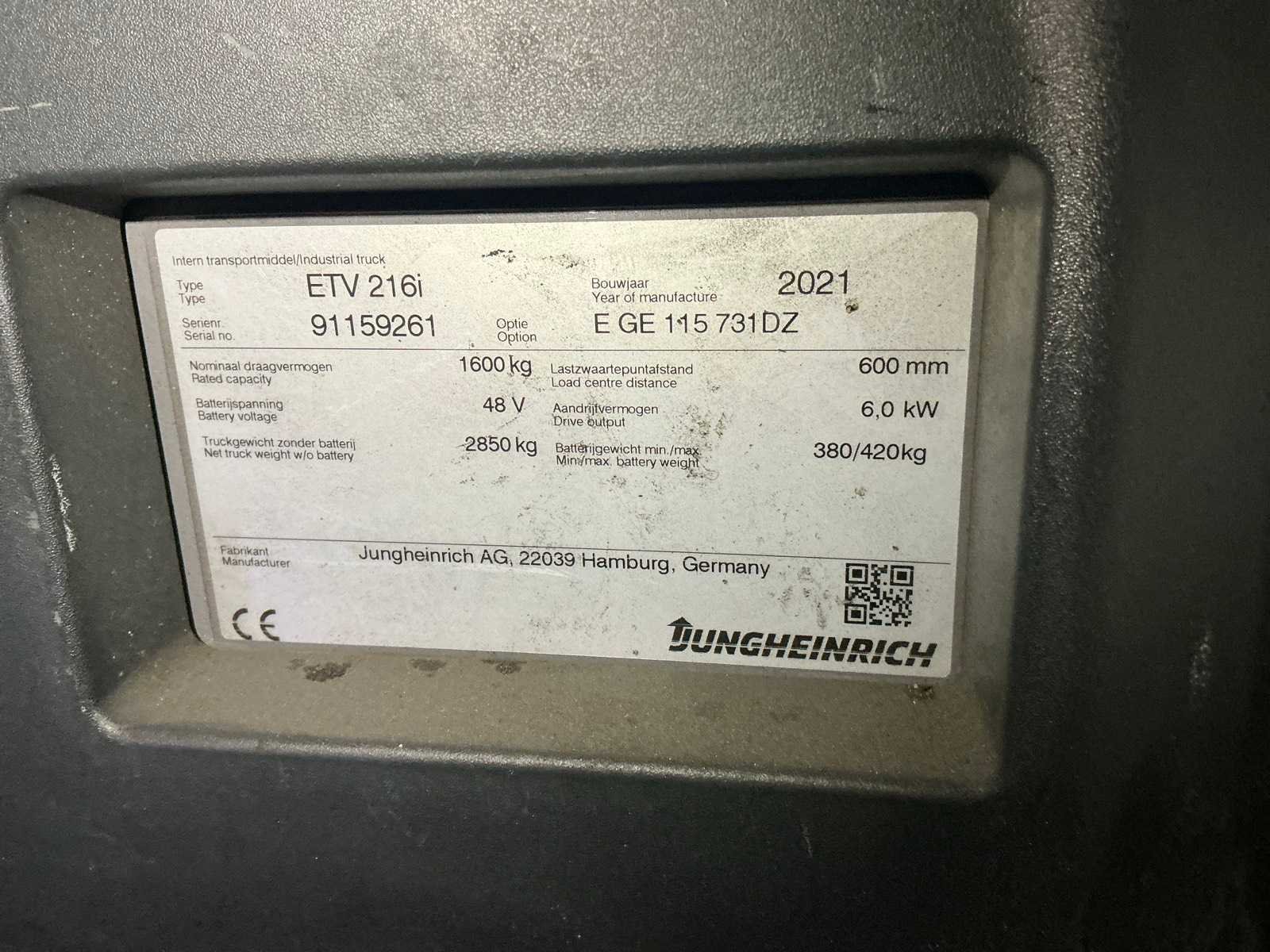 Inclusief 400Volt lader, 1x wiel welke onrond is, voorzien van camera tussen de vorken. Voorbereidingkabel voor Honeywell Thor VM1D unit Merk: Jungheinrich Type: ETV216i Bouwjaar: 2021 Serienummer: 91159261 Afgelezen urenstand: 2661 Accu lader: true Free-lift: true Side-shift: true Triple mast: true Hefvermogen: 1600kg Lepellengte: 1150mm Hefhoogte: 7300mm Minimale doorrijhoogte: 3040mm Totale afmeting L: 3100mm Totale afmeting Breedte: 1320mm Totale afmeting Hoogte: 3030mm