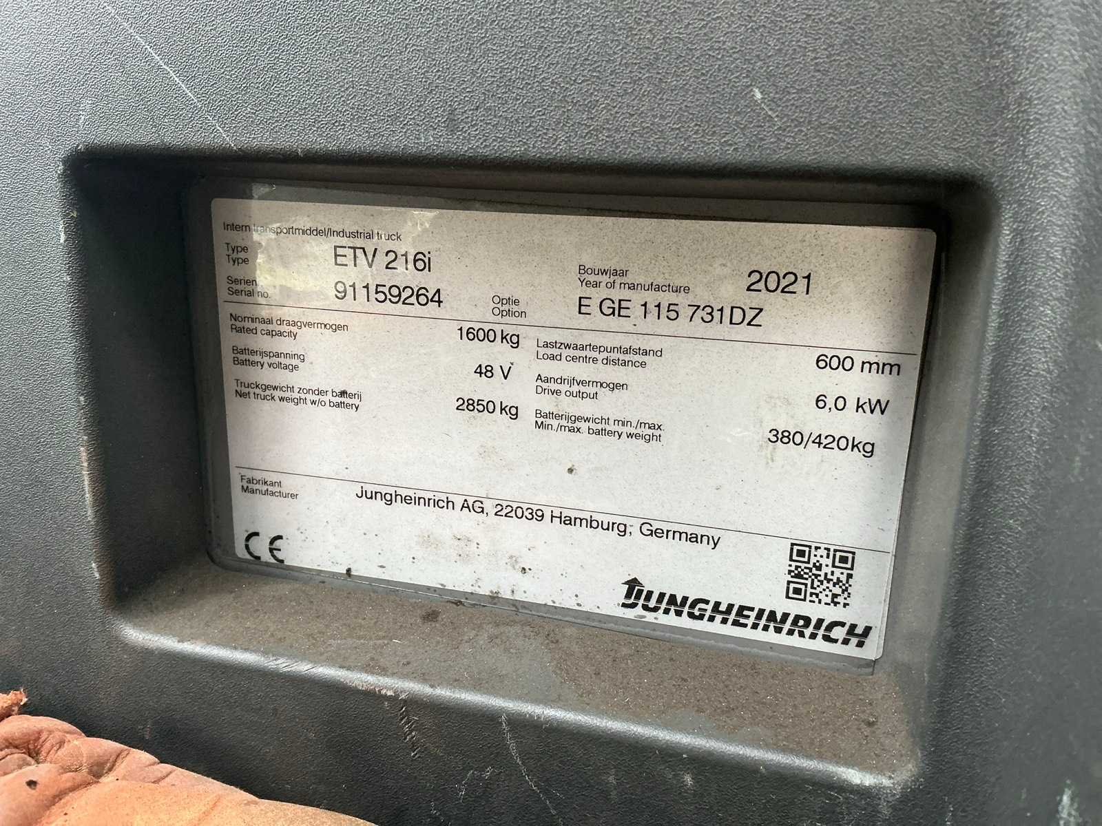 Inclusief 400Volt lader, 1x wiel welke onrond is, voorzien van camera tussen de vorken. Merk: Jungheinrich Type: ETV216i Bouwjaar: 2021 Serienummer: 91159264 Afgelezen urenstand: 1978 Accu lader: true Free-lift: true Side-shift: true Triple mast: true Hefvermogen: 1600kg Lepellengte: 1150mm Hefhoogte: 7300mm Minimale doorrijhoogte: 3040mm Totale afmeting L: 3100mm Totale afmeting Breedte: 1320mm Totale afmeting Hoogte: 3030mm