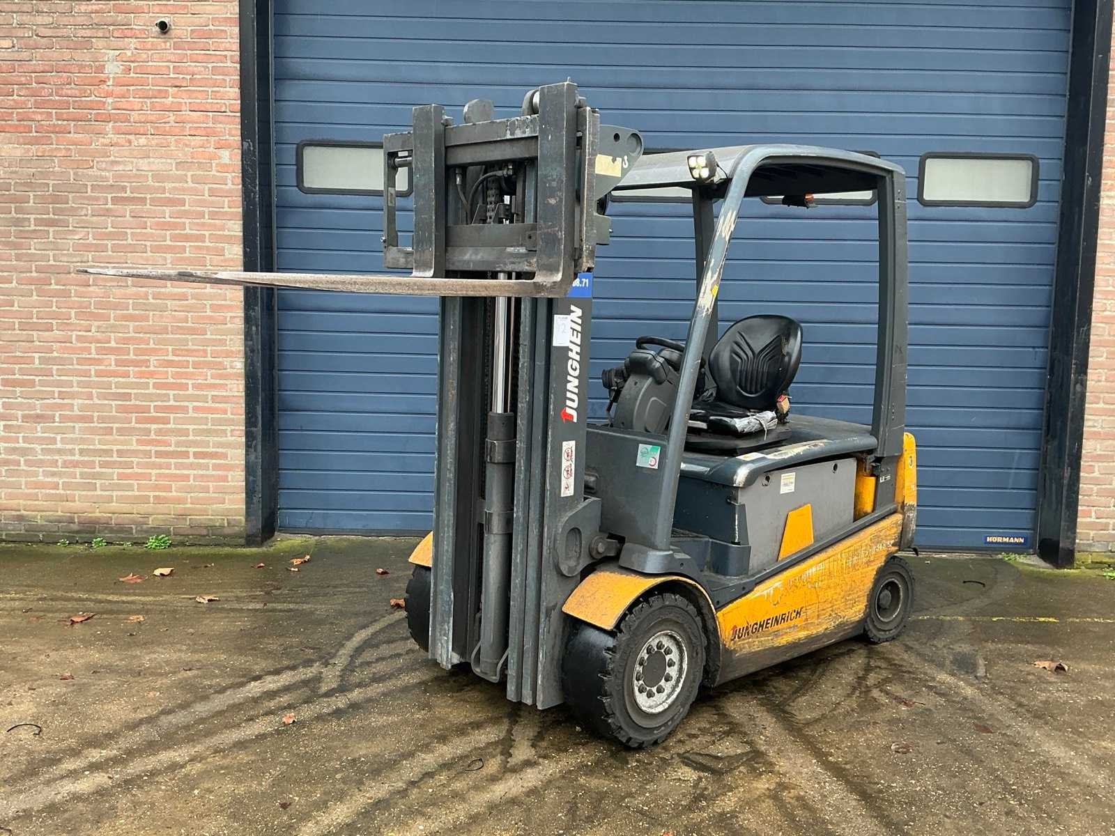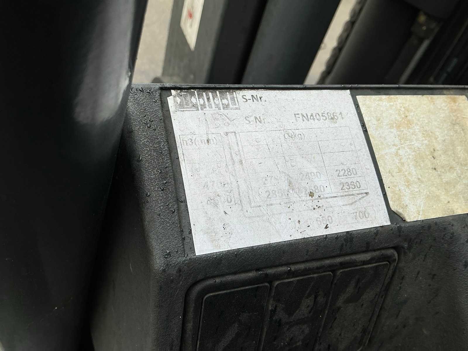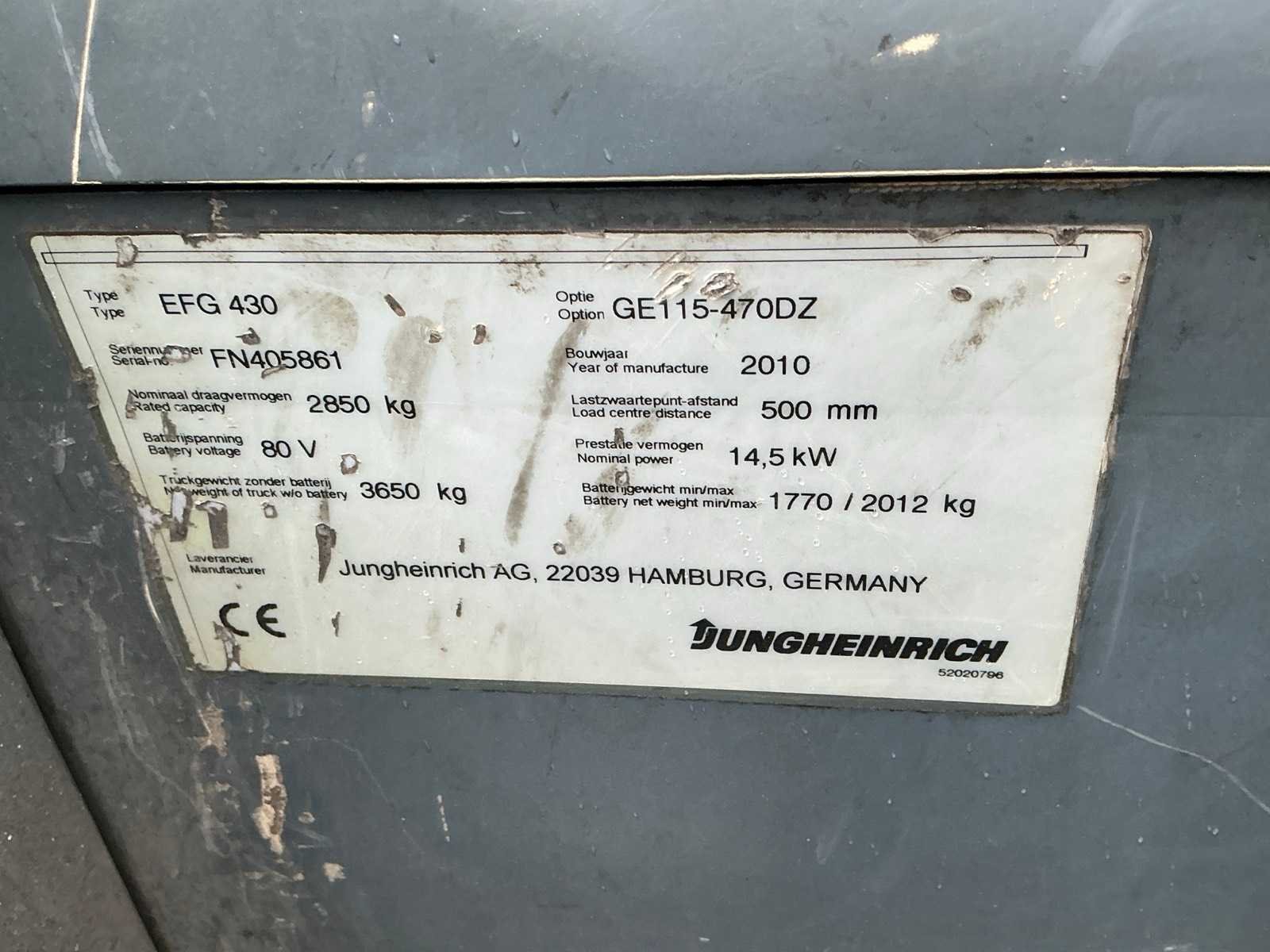 Inclusief 400Volt lader Merk: Jungheinrich Type: EFG430 Bouwjaar: 2010 Serienummer: FN405861 Brandstof: Elektrisch Mast: Triple Soort band: Volrubber banden Aantal wielen: 4 Afgelezen urenstand: 13378 Free-lift: true Side-shift: true Triple mast: true Hefvermogen: 2850kg Max. hefhoogte: 4700mm Minimale doorrijhoogte: 2230mm Totale afmeting L: 3700mm Totale afmeting Breedte: 1220mm Totale afmeting Hoogte: 2230mm