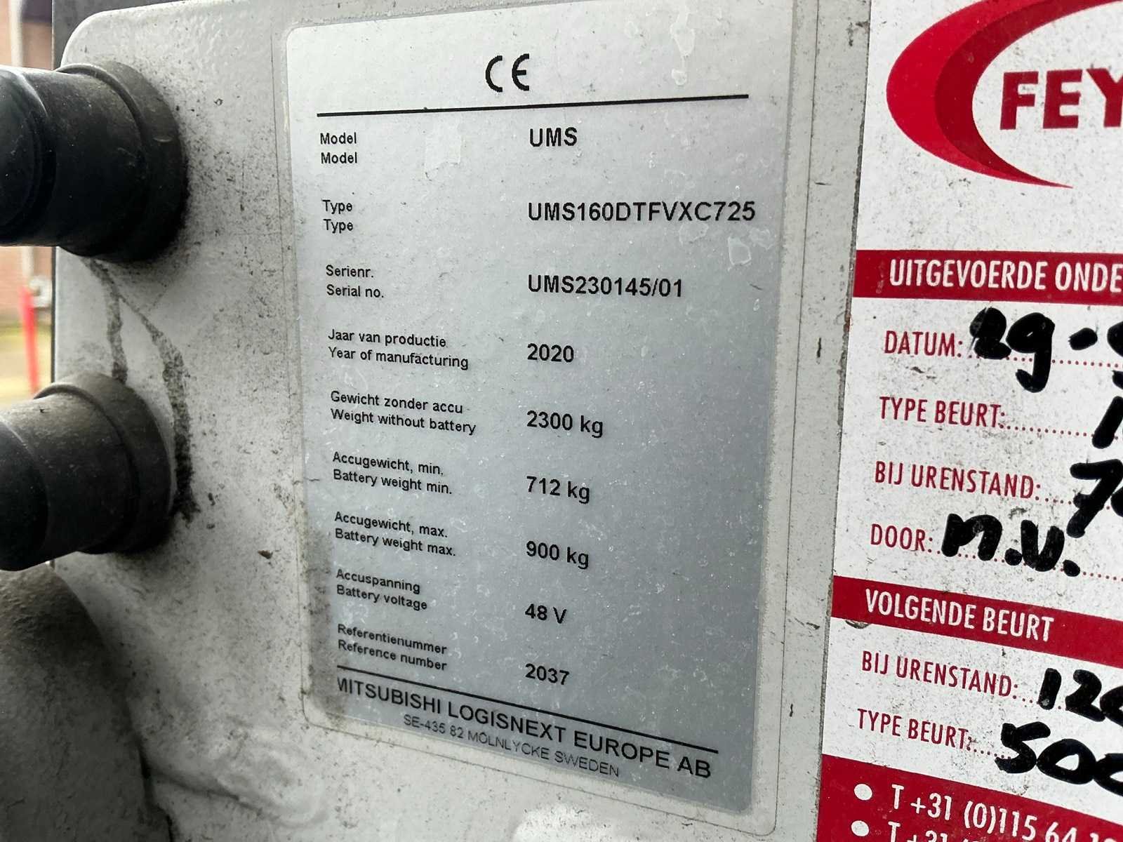 Voorzien van in hoogte verstelbare voetbediening, inclusief 400 Volt lader. Merk: UniCarriers Type: UMS160DTFVXC725 Bouwjaar: 2020 Serienummer: UMS1602300145/01 Brandstof: Elektriciteit Mast: Triple Accu lader: true Free-lift: true Side-shift: true Hefvermogen: 1600kg Lepellengte: 1150mm Hefhoogte: 7200mm Minimale doorrijhoogte: 3050mm Totale afmeting L: 2500mm Totale afmeting Breedte: 130mm Totale afmeting Hoogte: 3050mm