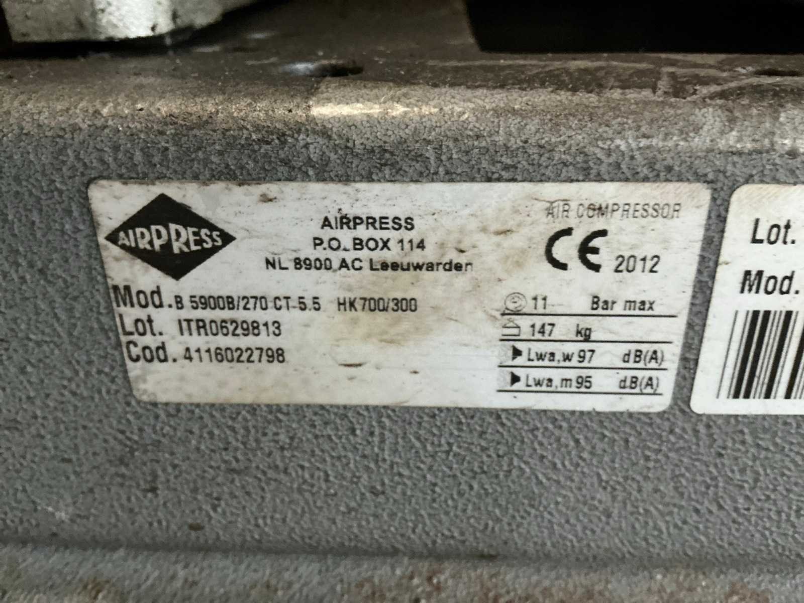 Merk: Airpress Type: Euro HK700/300 Bouwjaar: 2012 Capaciteit.: 11bar Luchtstroom: 600l/min Vermogen: 4kW Buffertank inhoud: 270l Aansluiting: 400V
