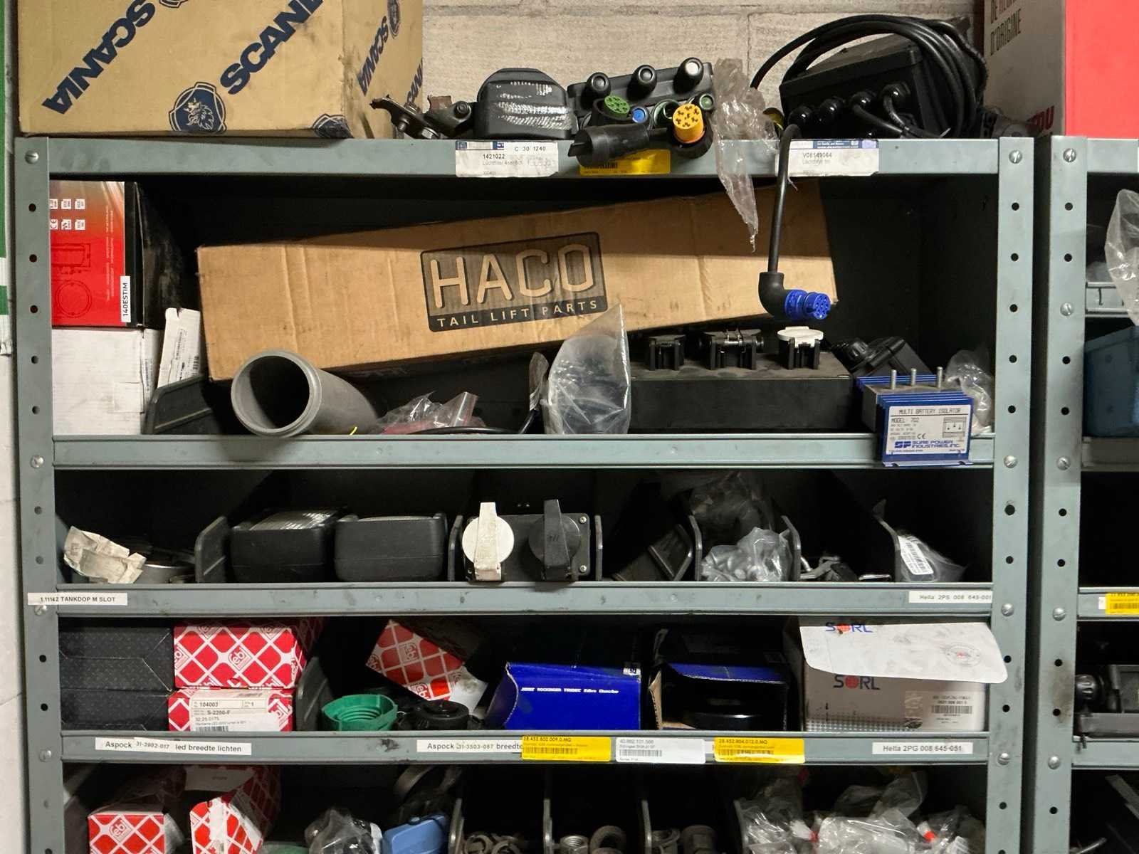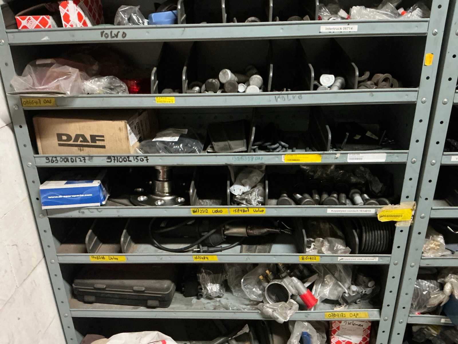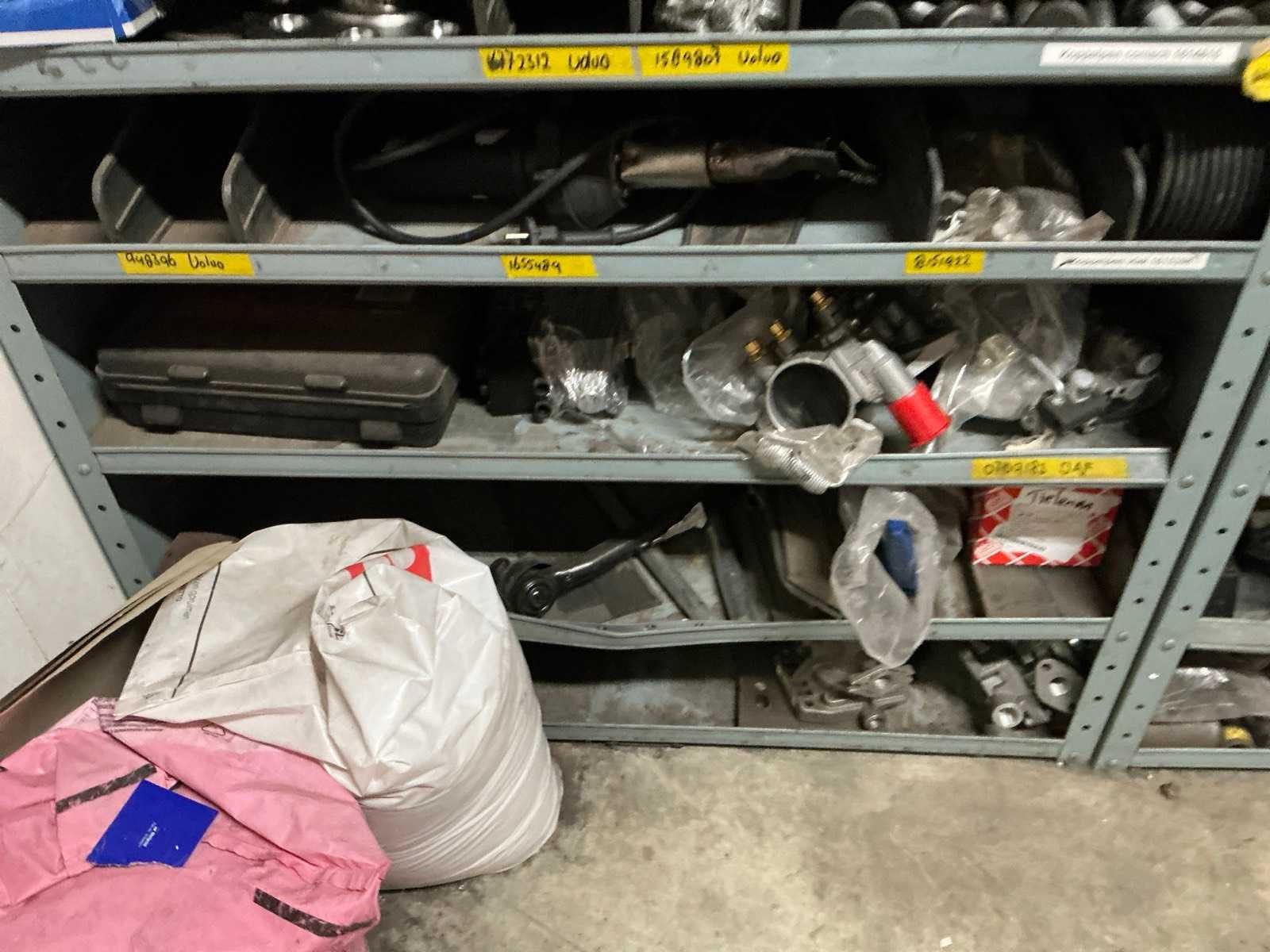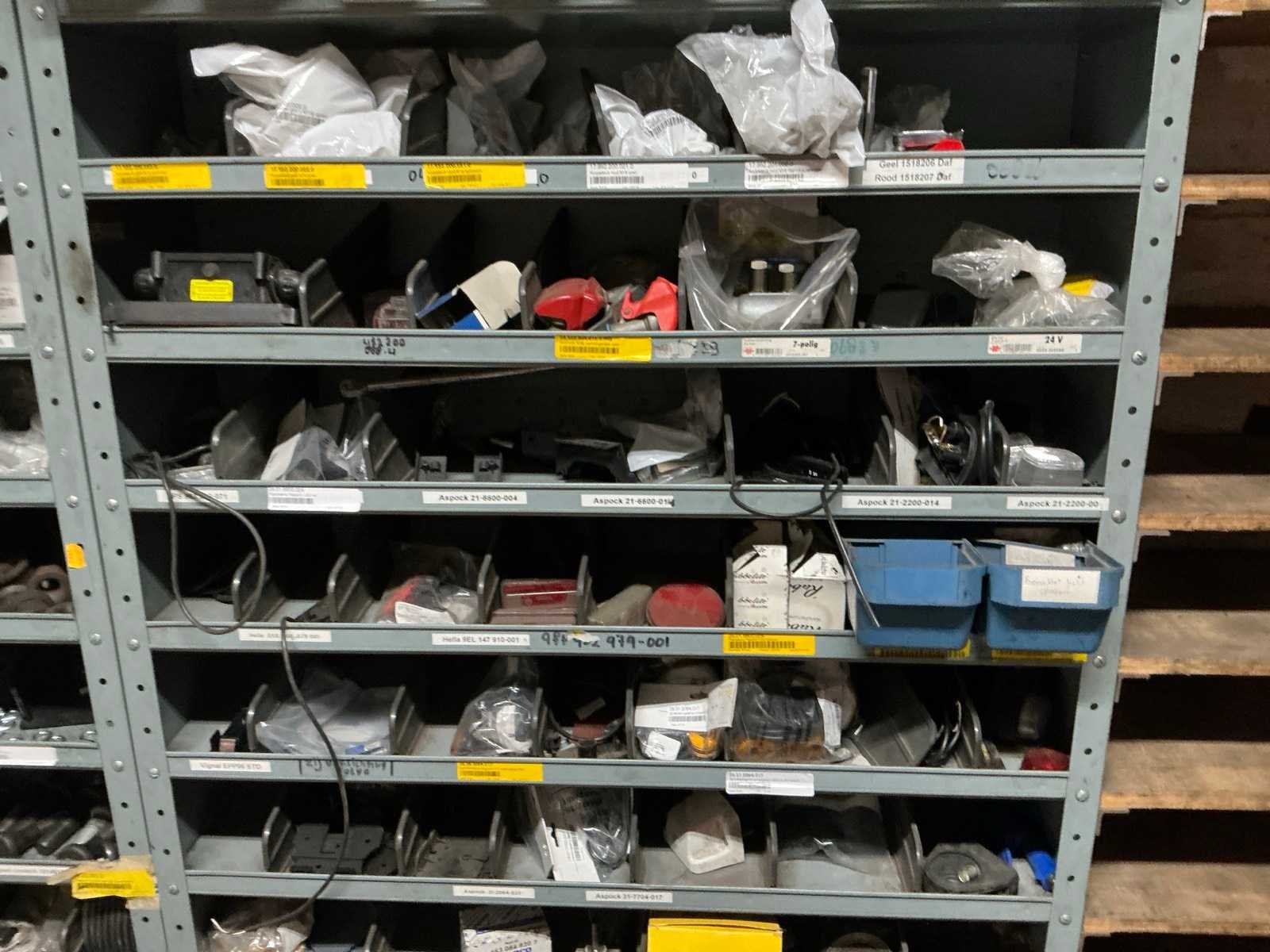 3x metalen stelling met inhoud; inhoud bestaande uit diverse vrachtwagen onderdelen en toebehoren.