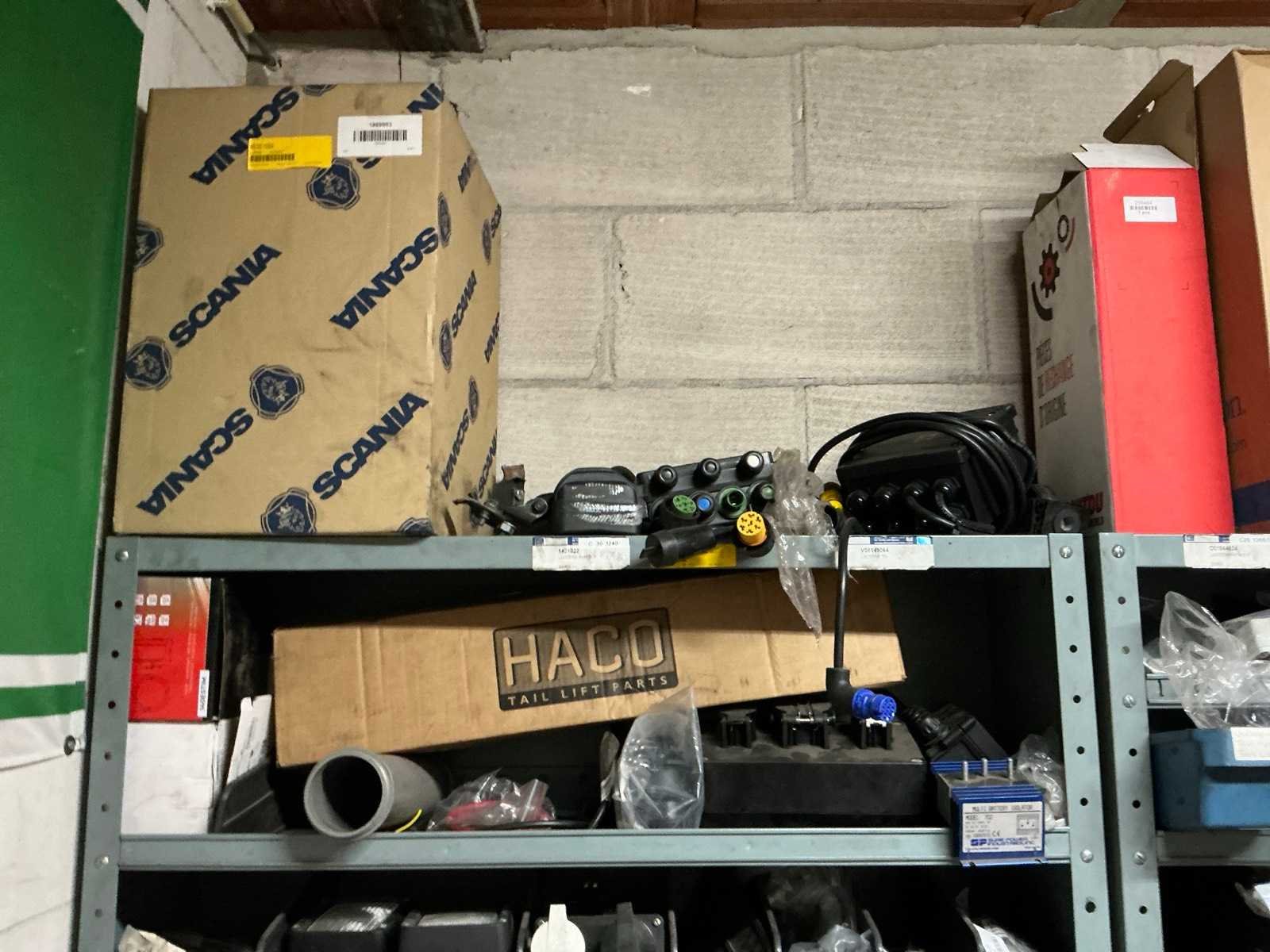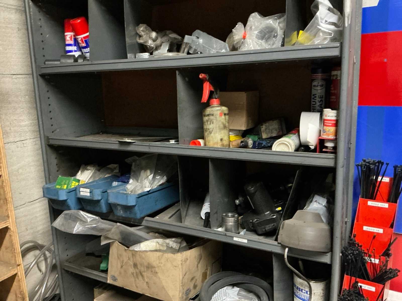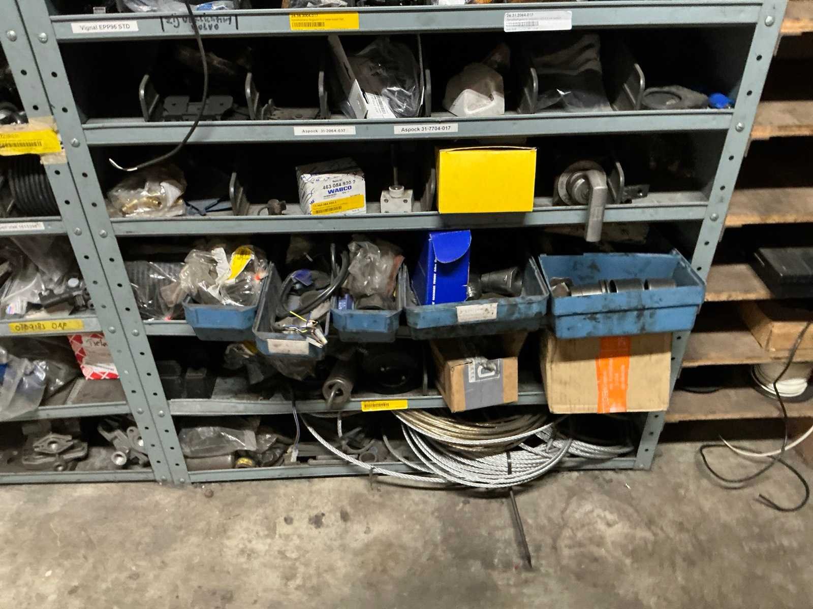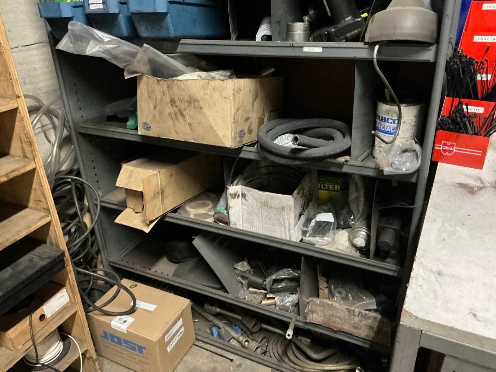 3x metalen stelling met inhoud; inhoud bestaande uit diverse vrachtwagen onderdelen en toebehoren.