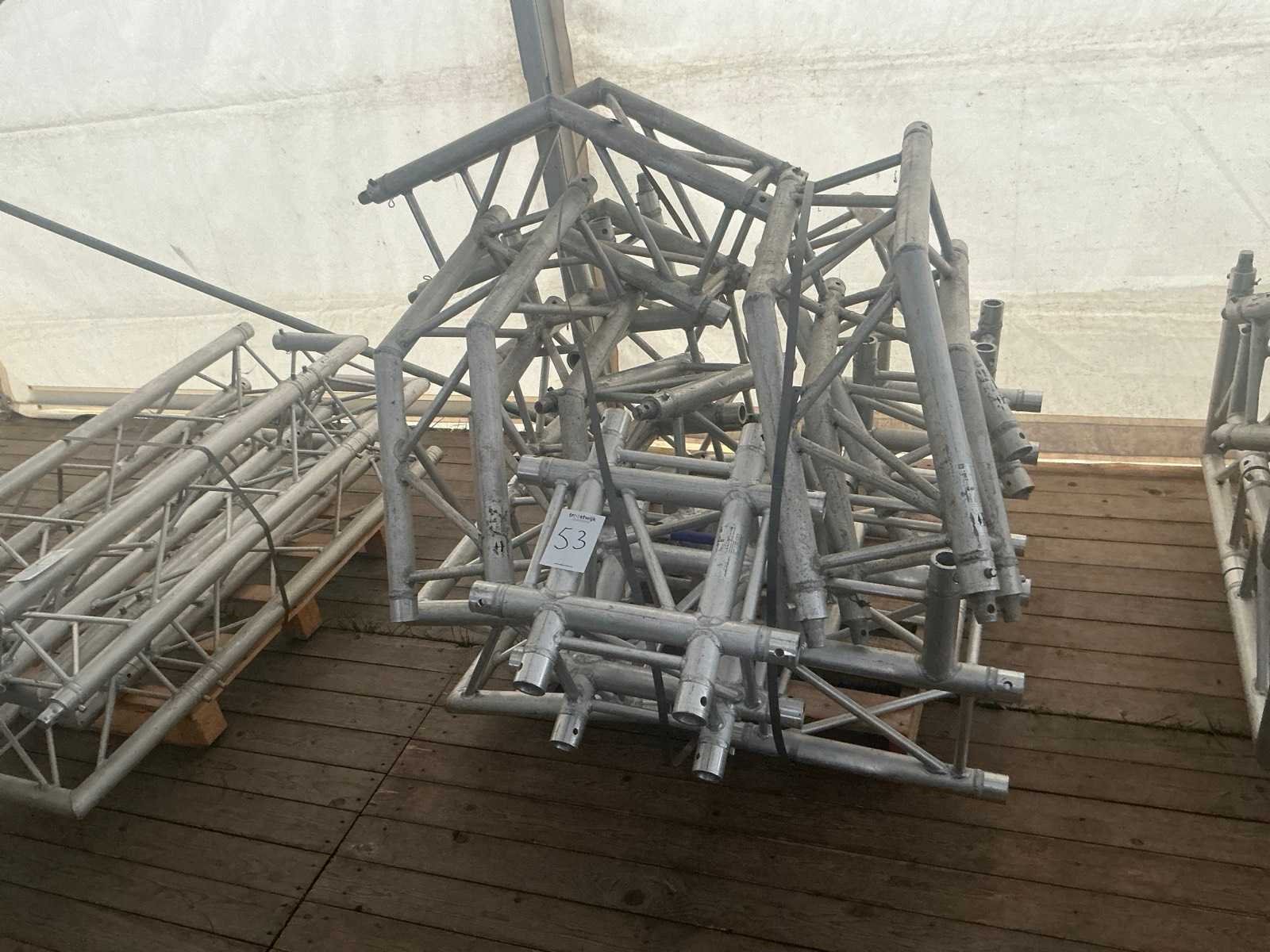 4x 135 graden; 1 Tstuk 1x 90graden + down; 2x T plus down; 2x 90 graden; 1 kruis onderdeel Merk: Eurotruss Type: FD34 Vierkant model: true Totale afmeting L: 1300mm Totale afmeting Breedte: 1300mm Totale afmeting Hoogte: 1200mm
