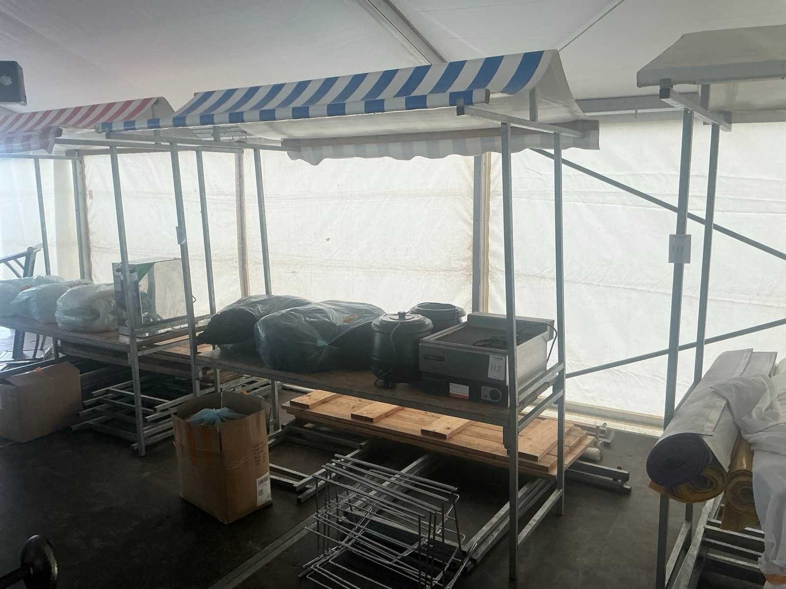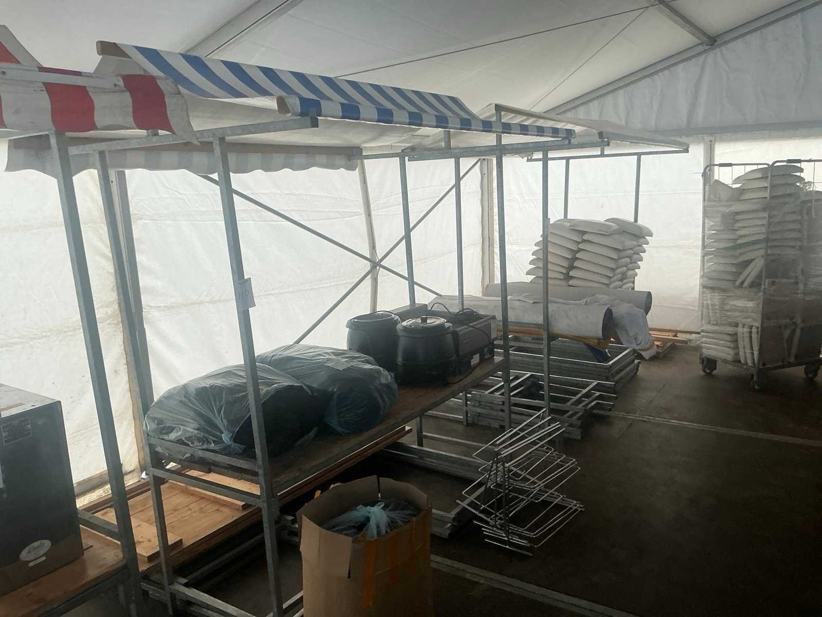 Afmeting blad: Lengte 200 cm | Breedte 70 cm | Hoogte 75 cm - Afmeting kraam: Lengte 235 cm | Diepte 150 cm | Breedte 205 cm - Demontabel Merk: Veba Kleur: Blauw/wit