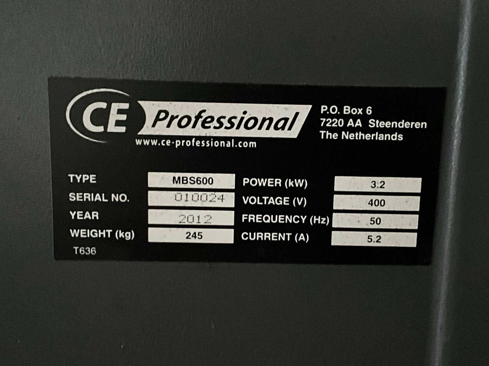Voorzien van “HBM” mobiele stofafzuiging Merk: CE Professional Type: MBS600 Bouwjaar: 2012 Serienummer: 010024 Uitlading: 550mm Tafel afmeting l: 630mm Tafel afmeting b: 480mm Aansluiting: 400V Machinegewicht: 245kg Afmeting l: 720mm Afmeting b: 1050mm Afmeting h: 2200mm