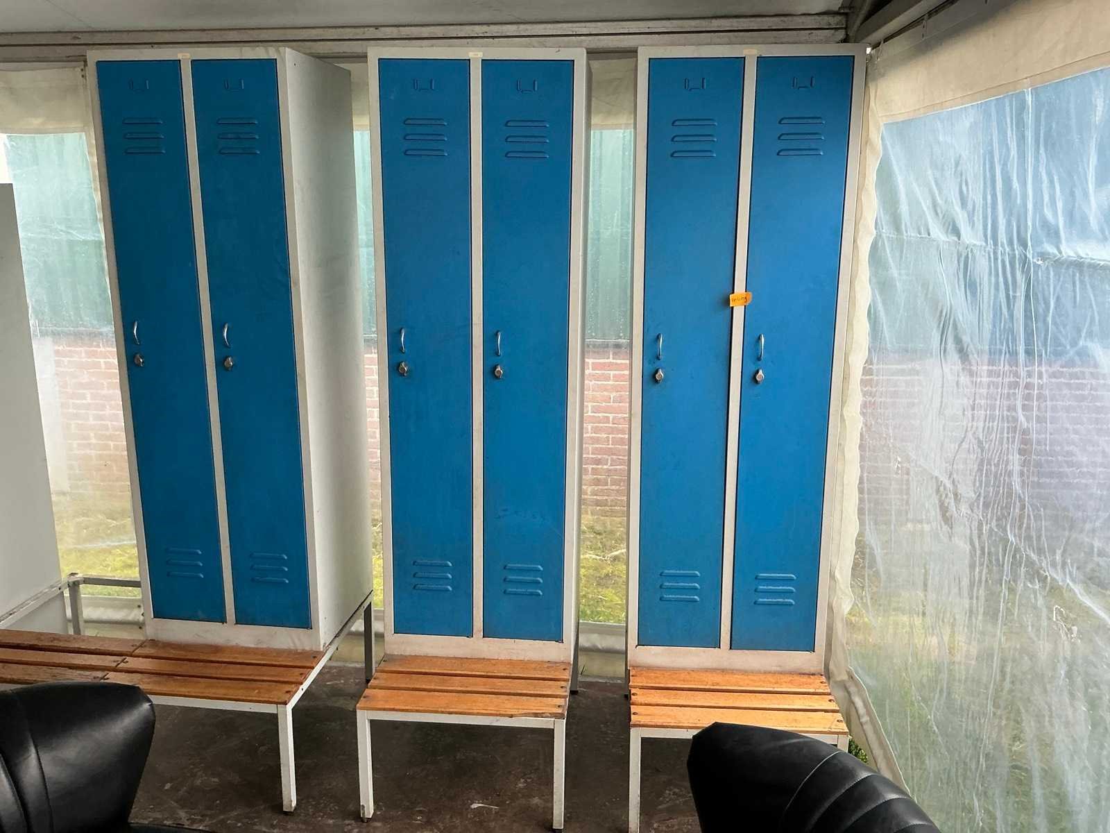 Met bank, 2 lockers per kast. Bank 38cm zithoogte. Lengte: 50cm Breedte: 59cm Hoogte: 216cm
