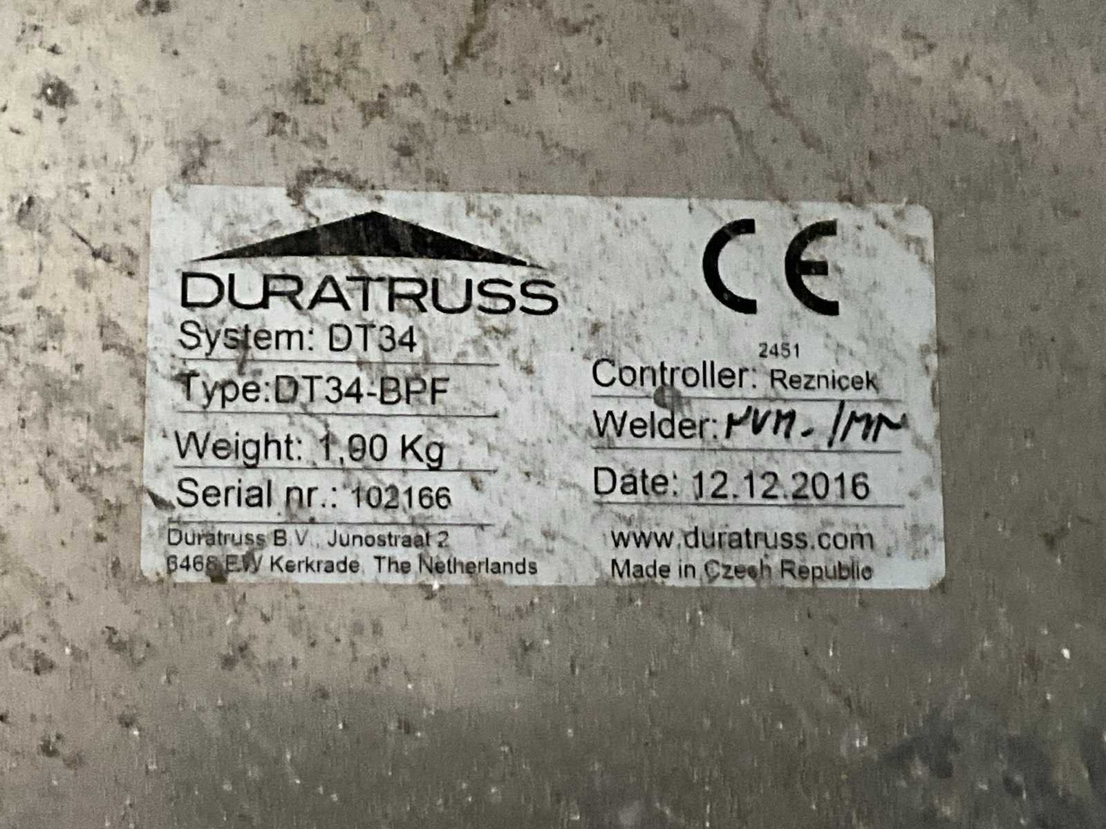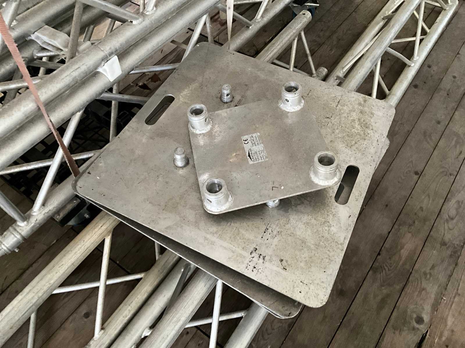 Bestaande uit 8x vierkant 200 cm; 4x vierkant 100 cm; 2x vierkant 150 cm; 2x driehoek 400 cm; 3x vloerplaat groot; 2x vloerplaat klein en pallet met diverse hoekstukken Merk: Duratruss Type: DT34 Vierkant model: true