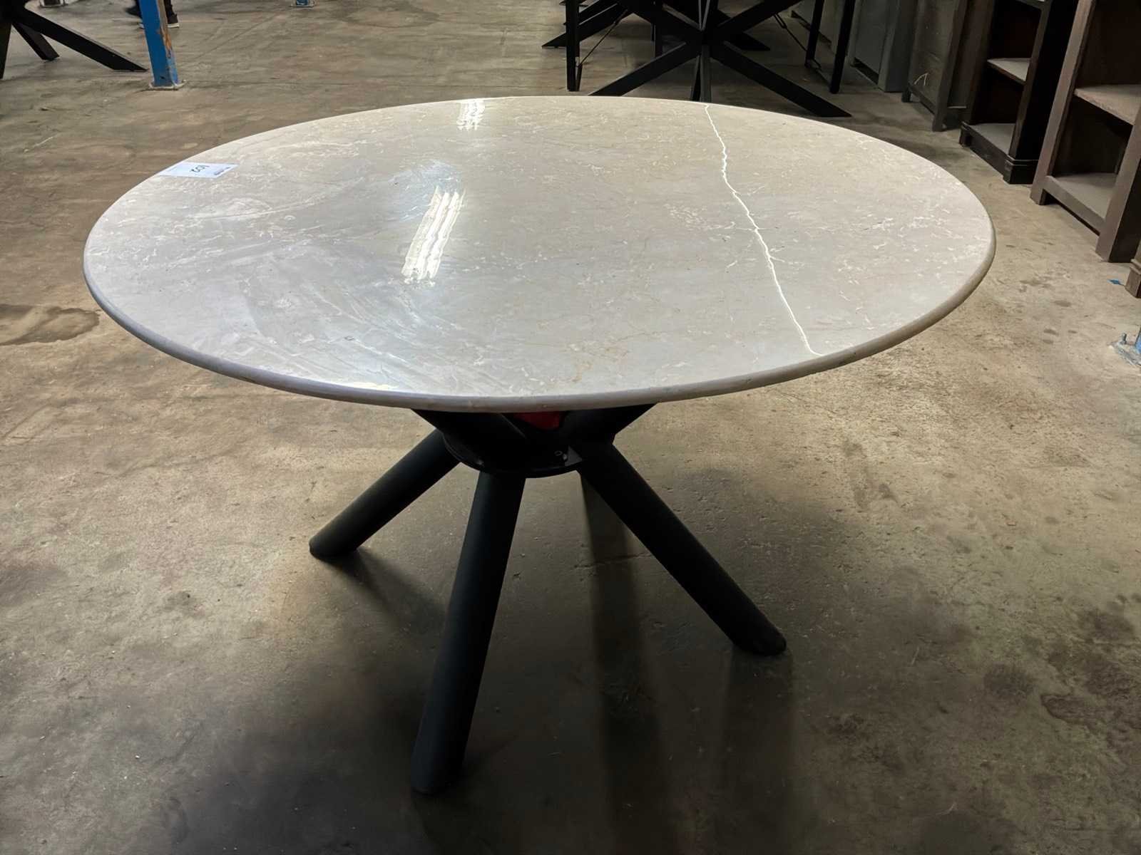 Blad iets beschadigd Vorm: Rond Lengte: 130cm Breedte: 130cm Hoogte: 77cm Materiaal: Marmer