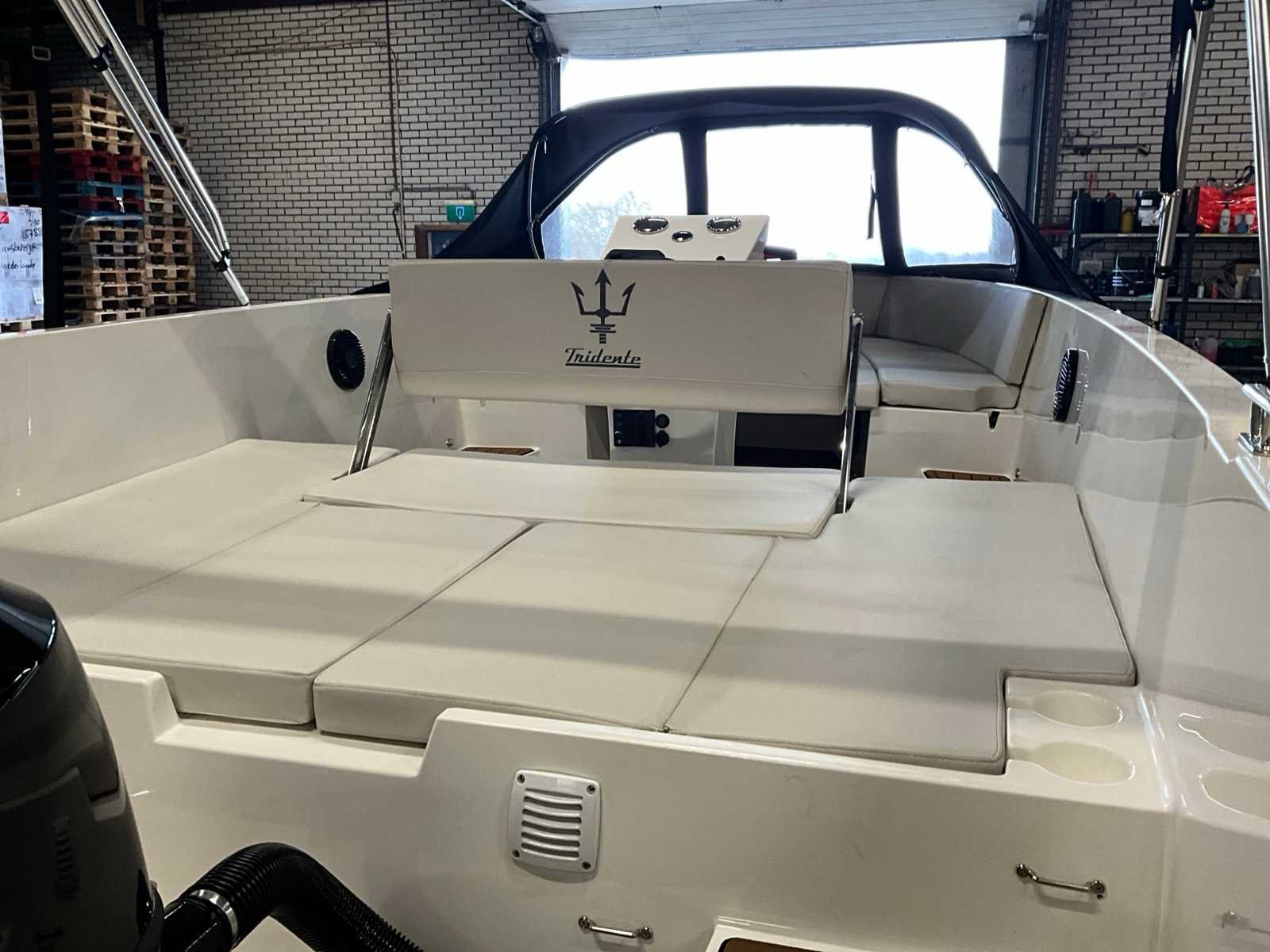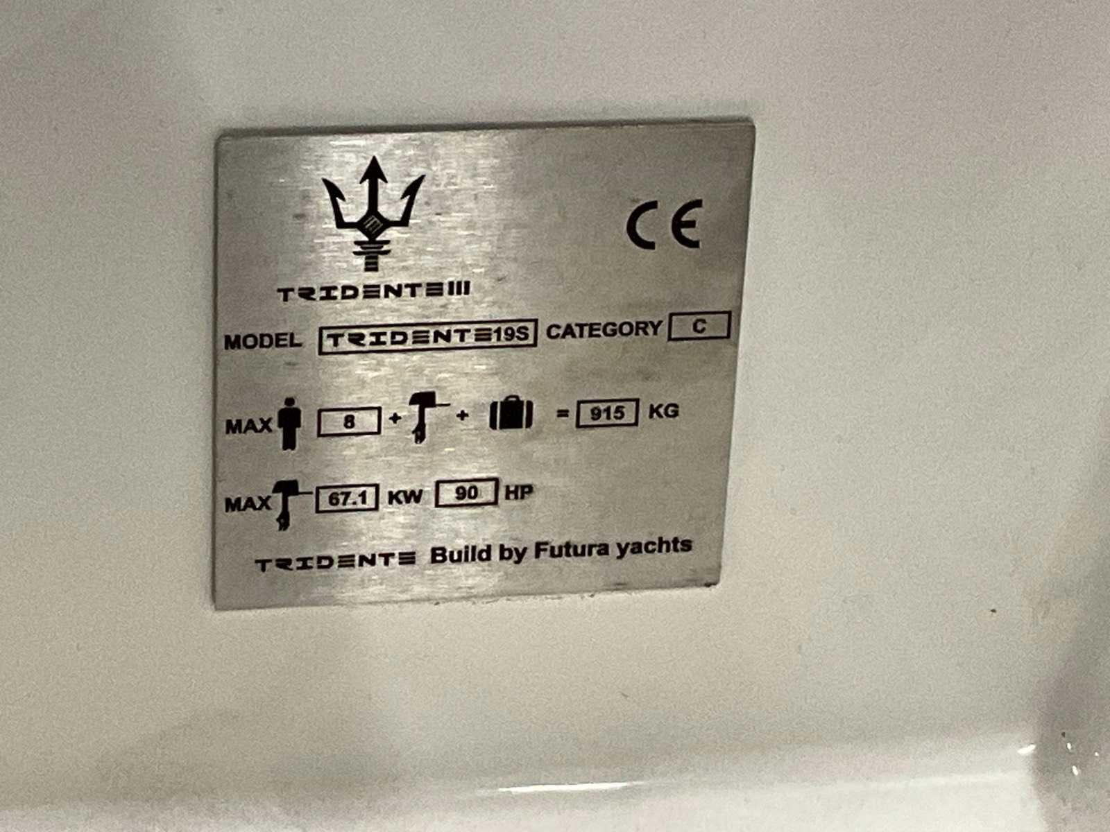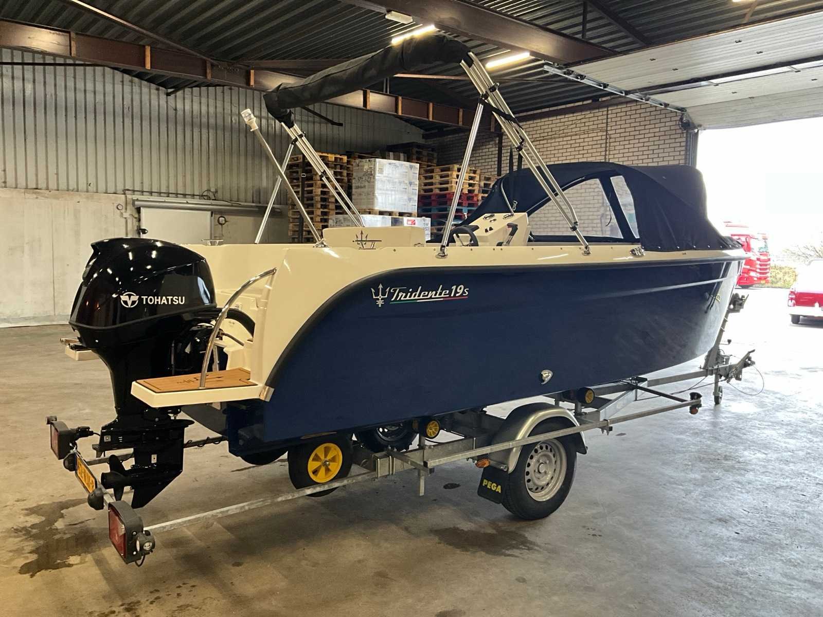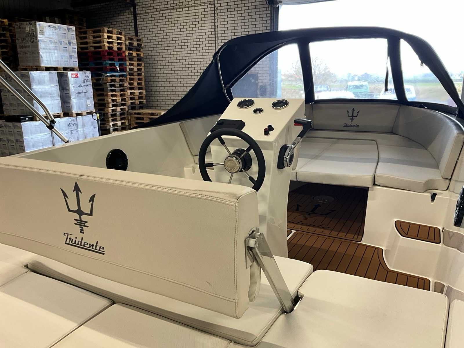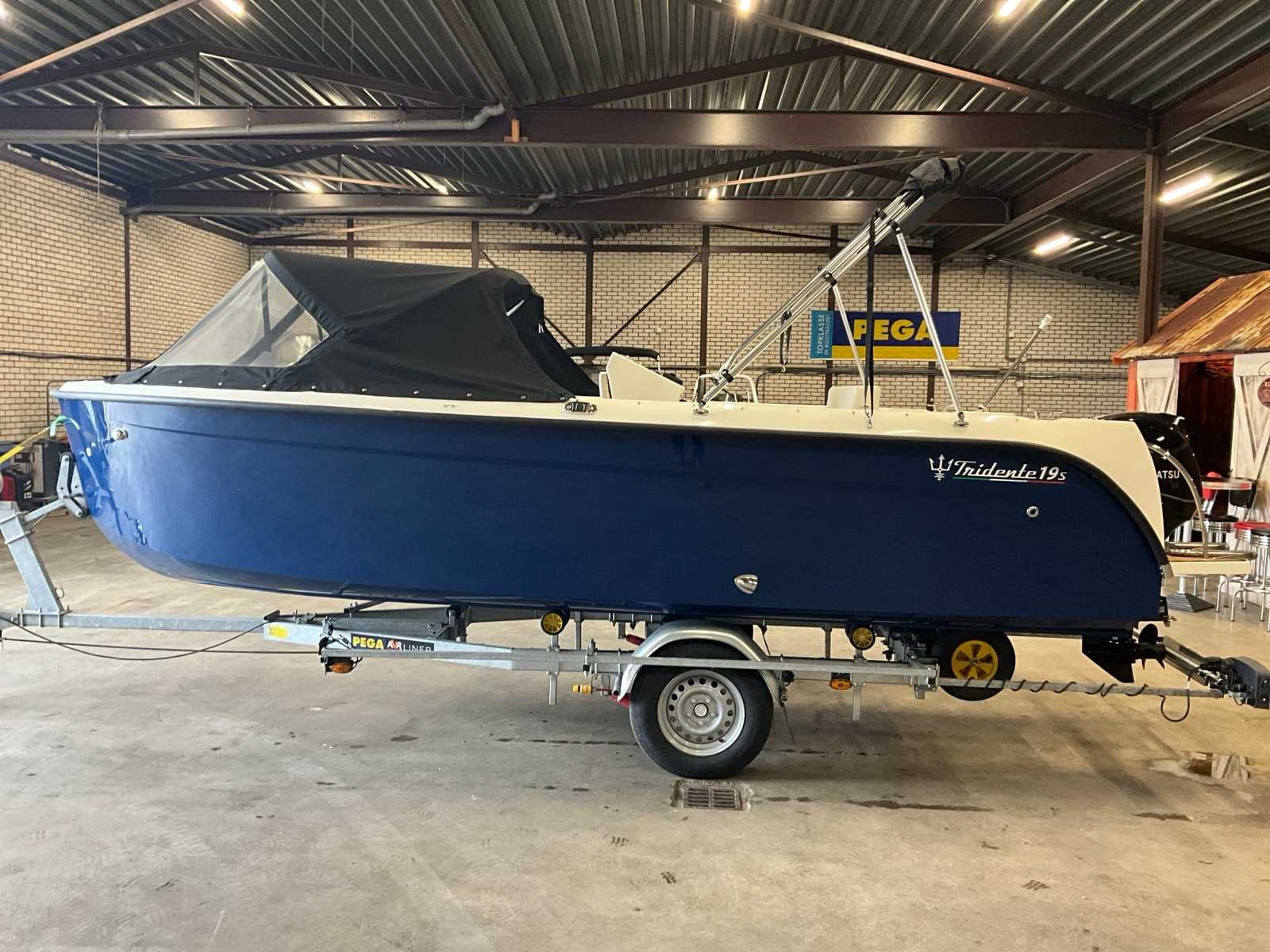 Complete set met biminitop, buiskap met afdekzeil, navigatieverlichting, toplicht, Nederlandse vlag, RVS kikkers, RVS zwemtrap en zwemplateau. Het interieur is praktisch ingericht met een loungegedeelte achter, uitneembare teaktafel, verstelbare rugleuningen, zonnedek, bekerhouders, kuipverlichting en diverse ruime opbergruimtes. Verder voorzien van een onderhoudsvriendelijke HPL teak vloer en zwemplateau, hoofdstroomschakelaar, diverse meters op het dashboard en een Hertz audiosysteem, op en inclusief Pega boottrailer. Merk: Tridente Type: 19S Rompmateriaal: Polyester Brandstof: Benzine Bouwjaar: 2025 Serienummer: NL-FYC T1911K122 Lengte over alles: 5.95m Breedte formaat: 2.35m Type motor: Tohatsu 60PK