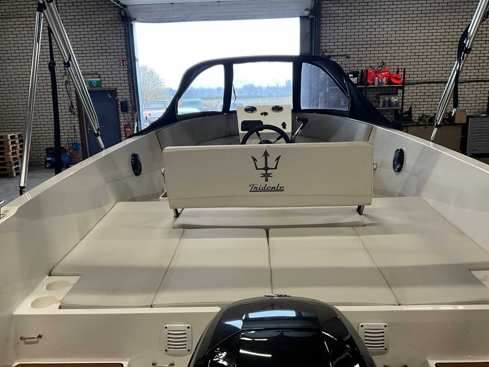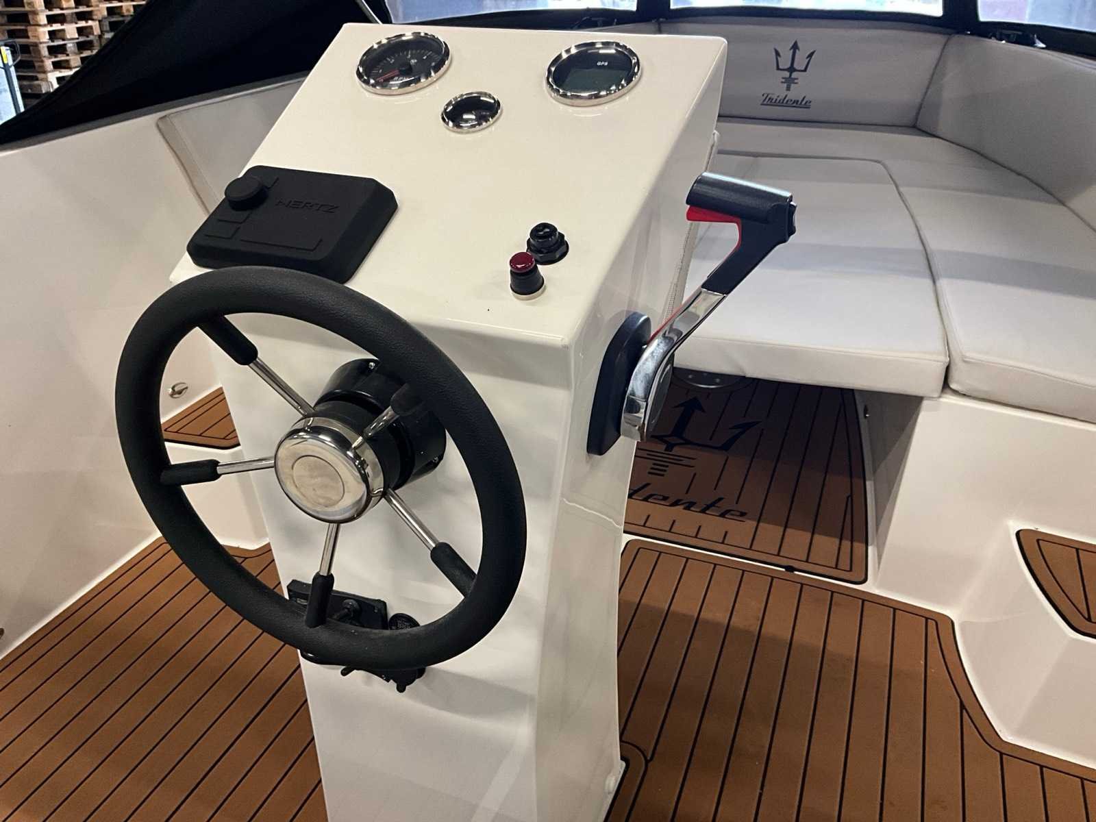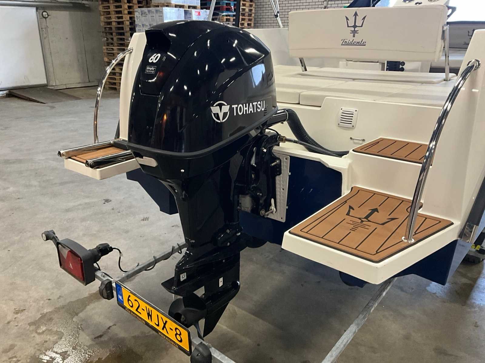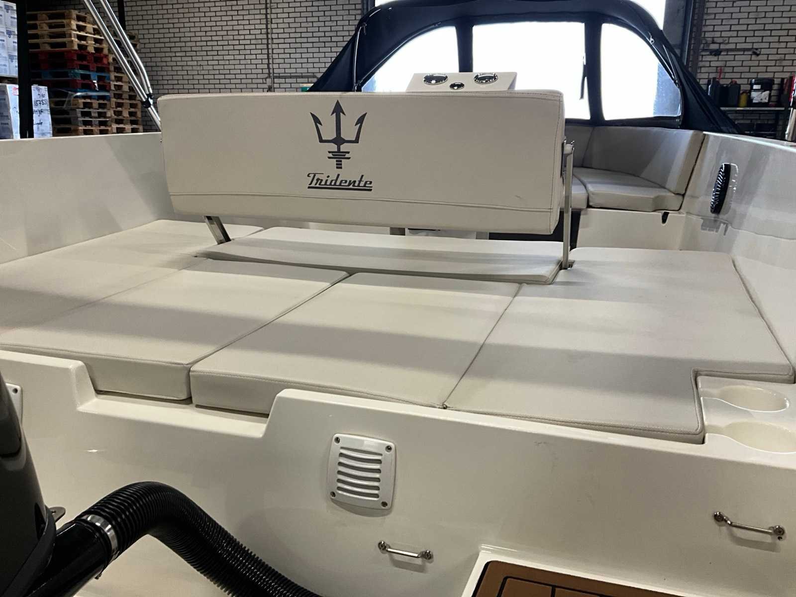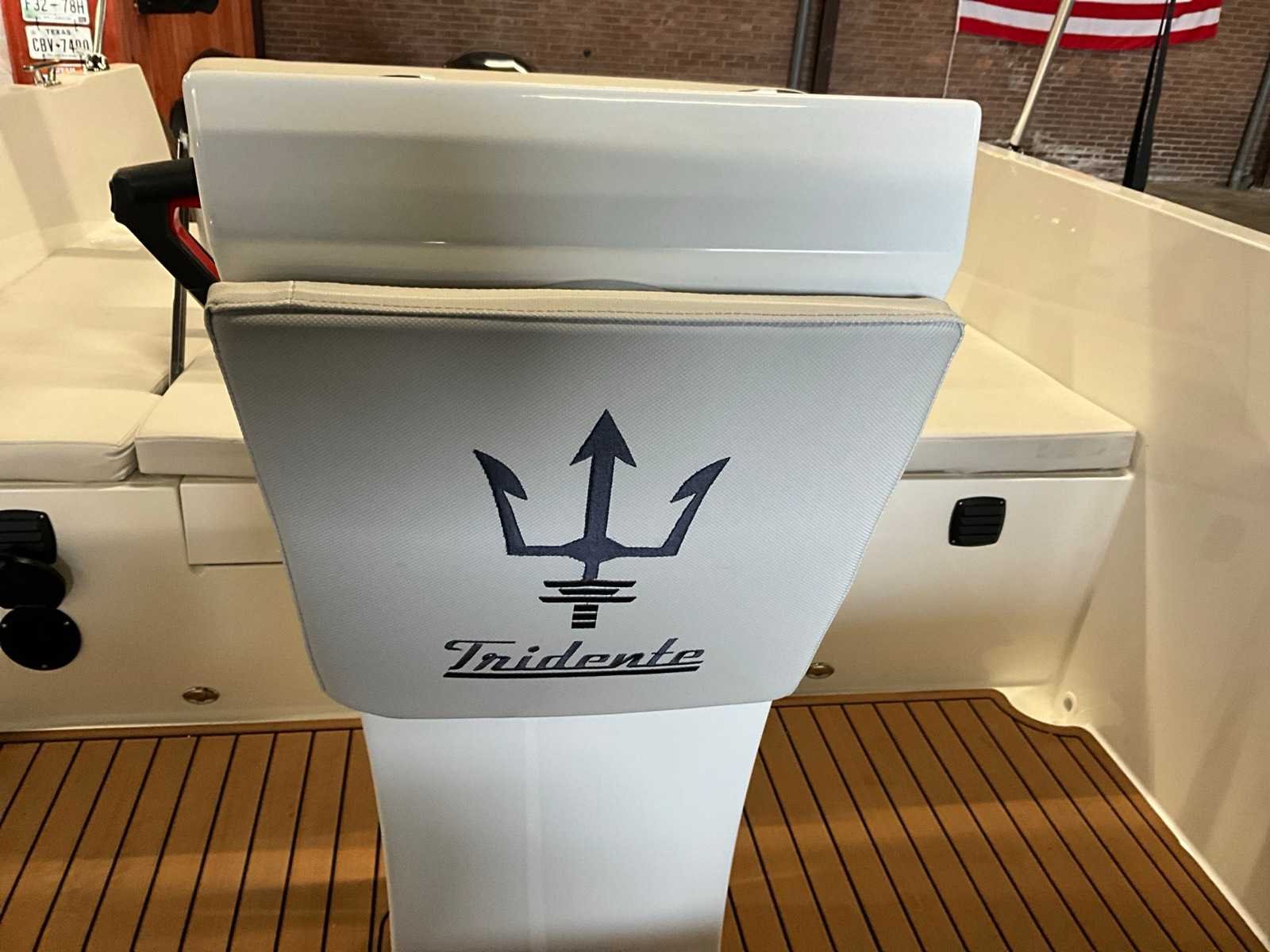 Complete set met biminitop, buiskap met afdekzeil, navigatieverlichting, toplicht, Nederlandse vlag, RVS kikkers, RVS zwemtrap en zwemplateau. Het interieur is praktisch ingericht met een loungegedeelte achter, uitneembare teaktafel, verstelbare rugleuningen, zonnedek, bekerhouders, kuipverlichting en diverse ruime opbergruimtes. Verder voorzien van een onderhoudsvriendelijke HPL teak vloer en zwemplateau, hoofdstroomschakelaar, diverse meters op het dashboard en een Hertz audiosysteem, op en inclusief Pega boottrailer. Merk: Tridente Type: 19S Rompmateriaal: Polyester Brandstof: Benzine Bouwjaar: 2025 Serienummer: NL-FYC T1911K122 Lengte over alles: 5.95m Breedte formaat: 2.35m Type motor: Tohatsu 60PK