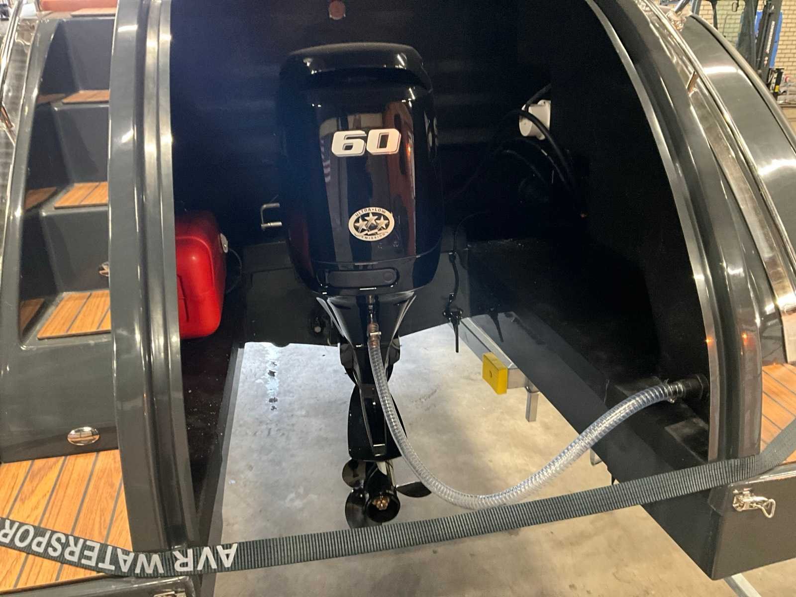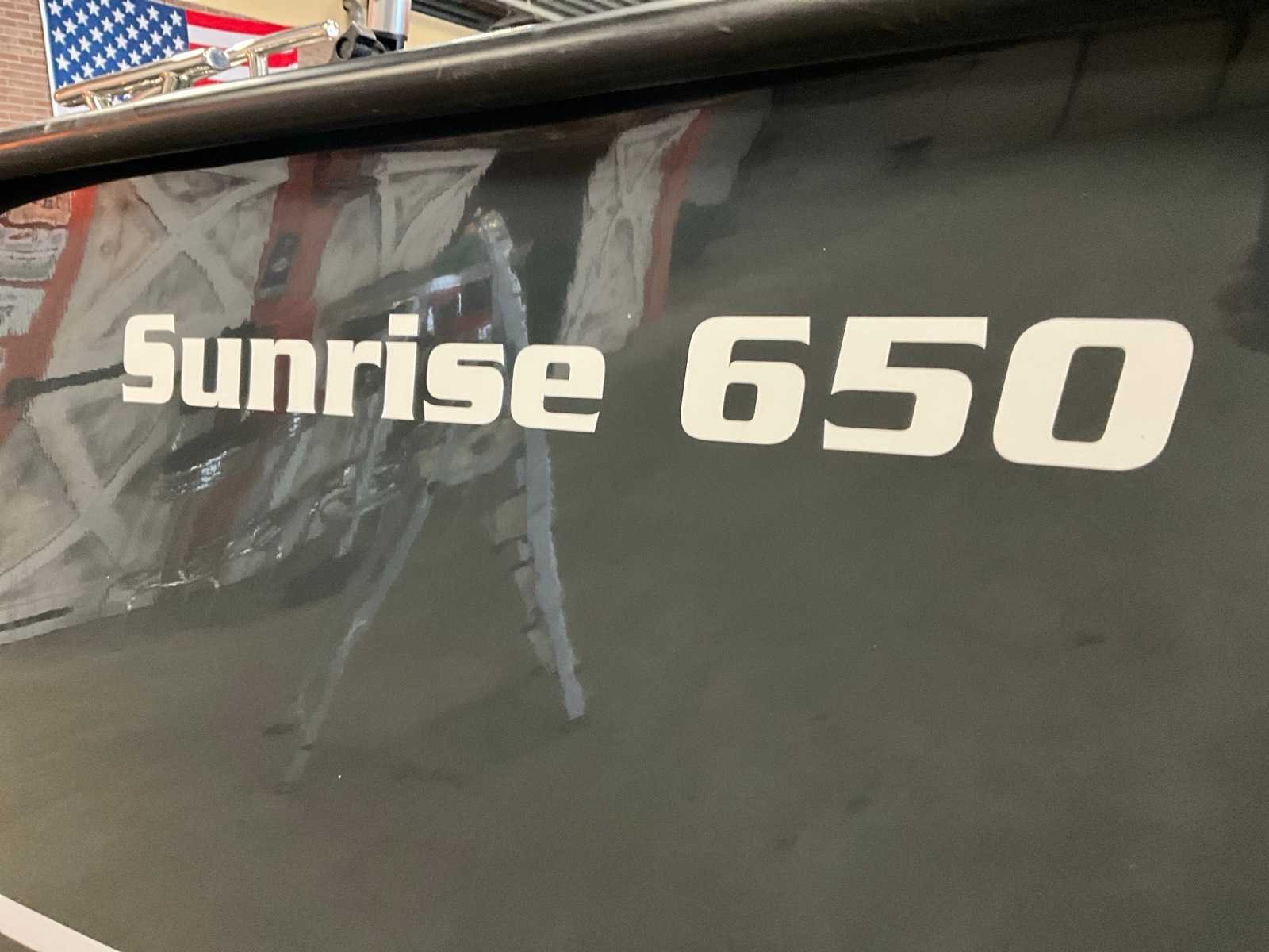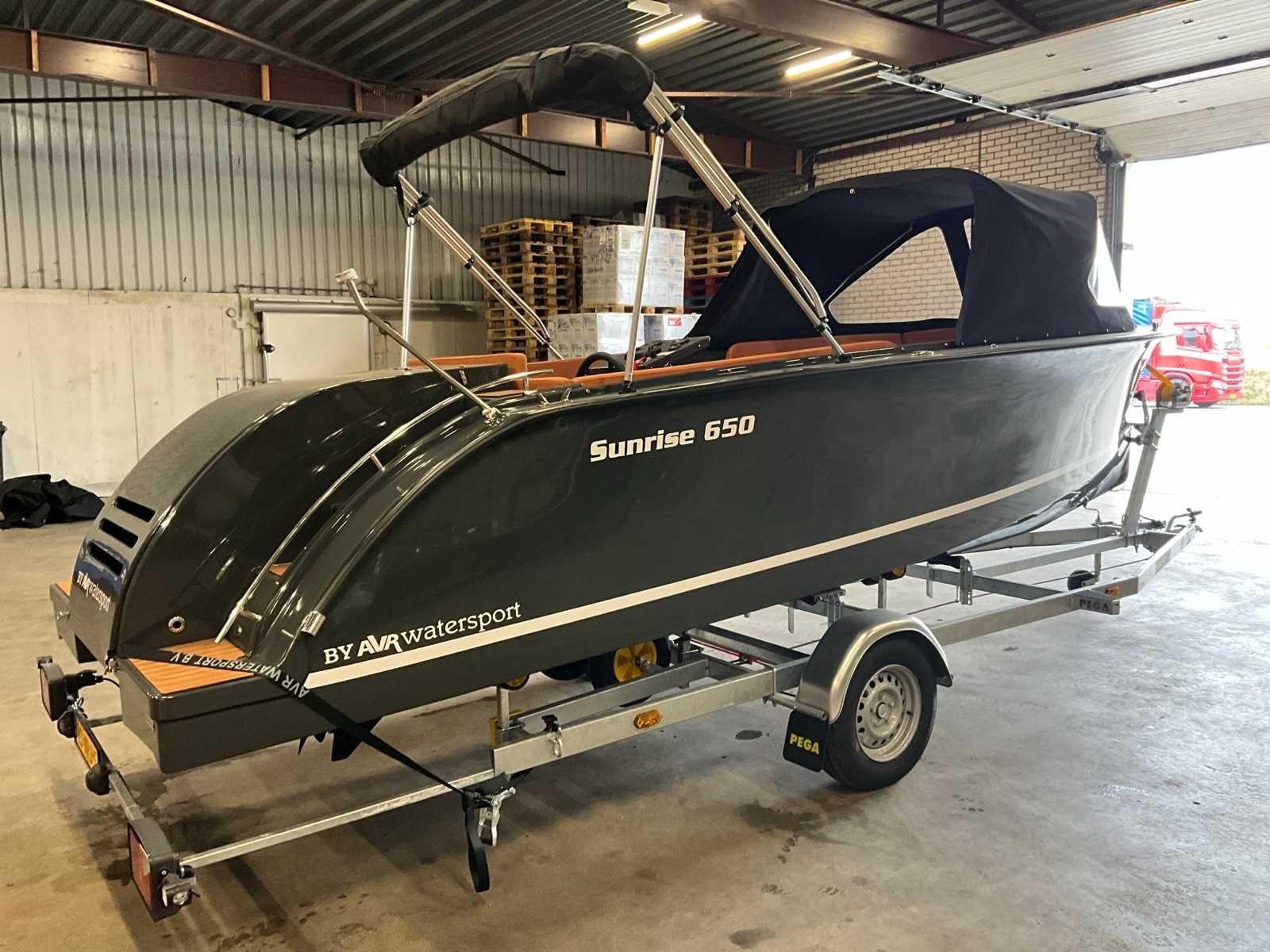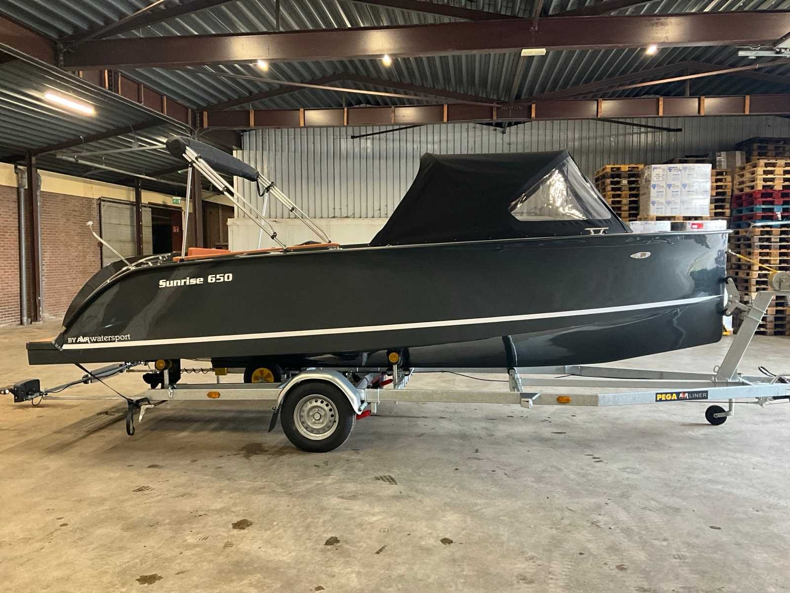 Complete set, Voorzien van biminitop, buiskap met afdekzeil, navigatieverlichting, toplicht en verlichting op de traptrede. Het interieur is luxe ingericht met een chromen schakelkast, diverse ruime opbergruimtes, kuipverlichting, een rondzit met uitneembaar zonnedek en RVS bekerhouders. Uitgerust met een uitgebreid infotainmentsysteem, waaronder een Hertz audiosysteem en diverse meters op het dashboard. Verder voorzien van een hoofdstroomschakelaar en een onderhoudsvriendelijke HPL teakvloer met zwemplateau, op en inclusief Pega boottrailer. Merk: Sunrise Type: 650T Rompmateriaal: Polyester Brandstof: Benzine Bouwjaar: 2025 Serienummer: PLQFIS65001A525 Lengte over alles: 6.4m Breedte formaat: 2.4m Type motor: Suzuki 60PK