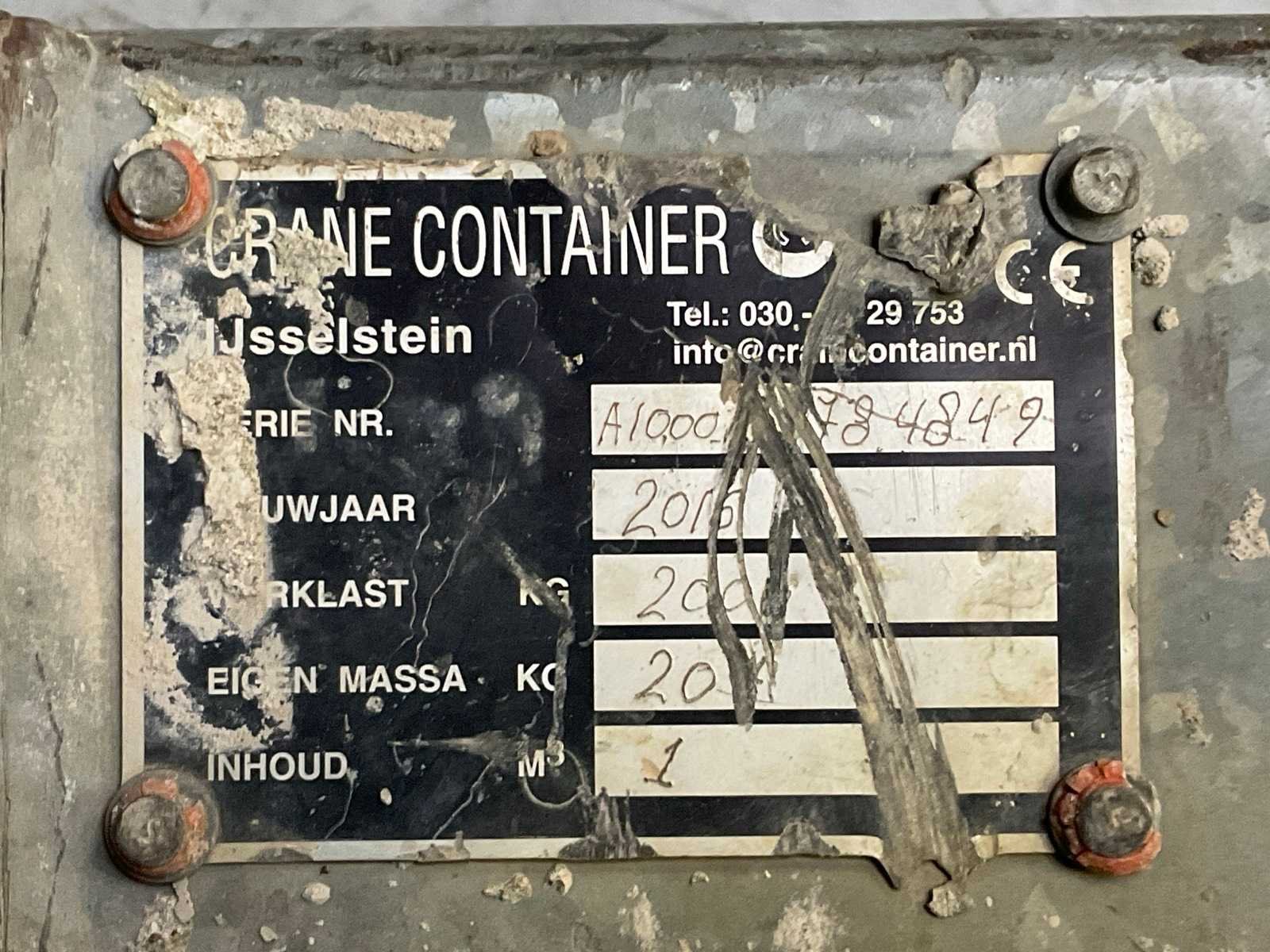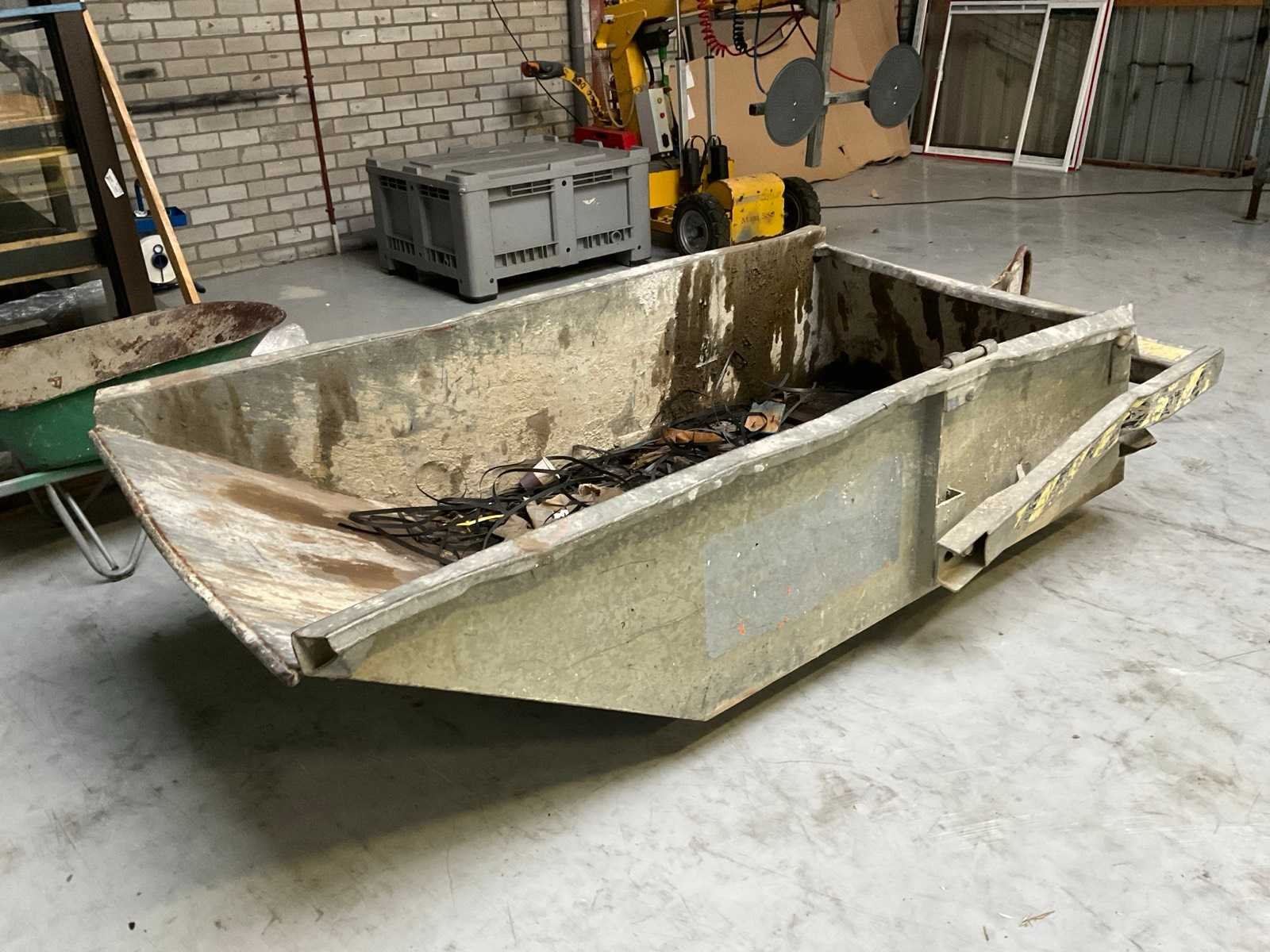Eigen gewicht: 200 kg, capaciteit 2000 kg. Merk: Crane Container Bouwjaar: 2016 Staal, inhoud: 1m³ Gebruikt voor bouw en sloopafval: true Totale afmeting L: 2600mm Totale afmeting Breedte: 1050mm Totale afmeting Hoogte: 700mm