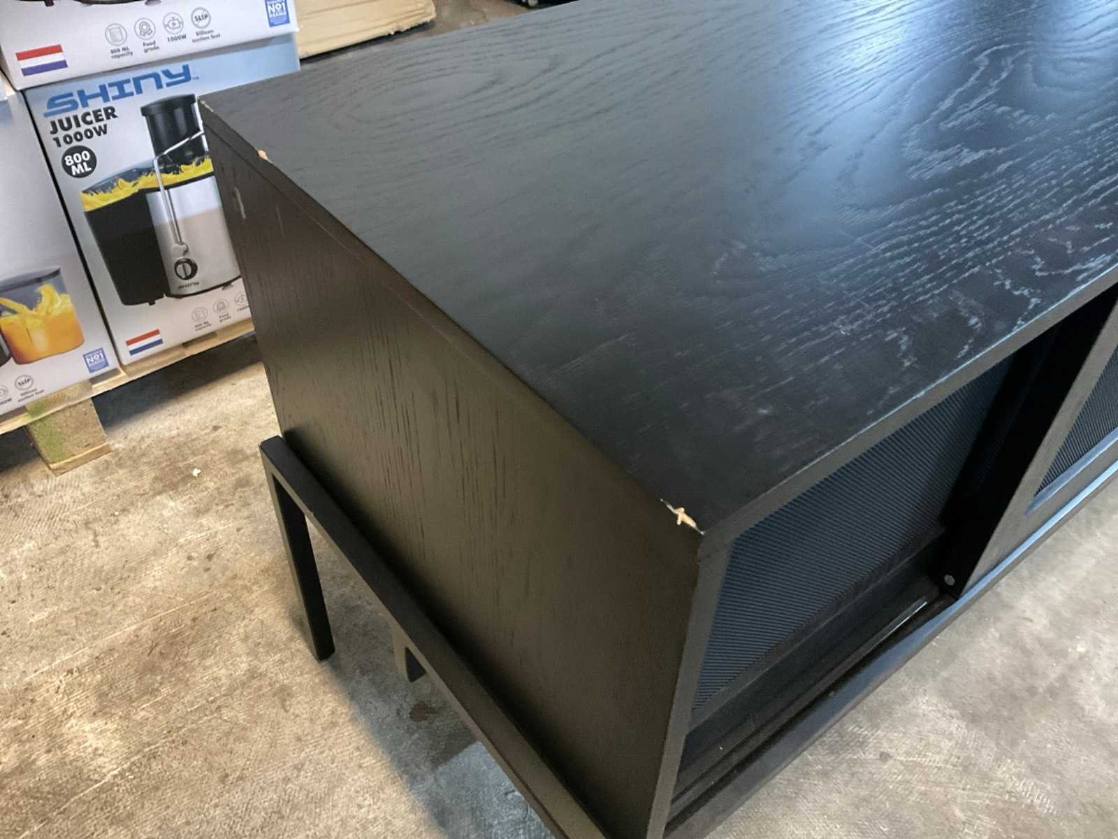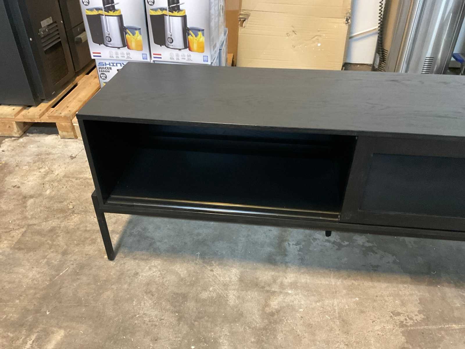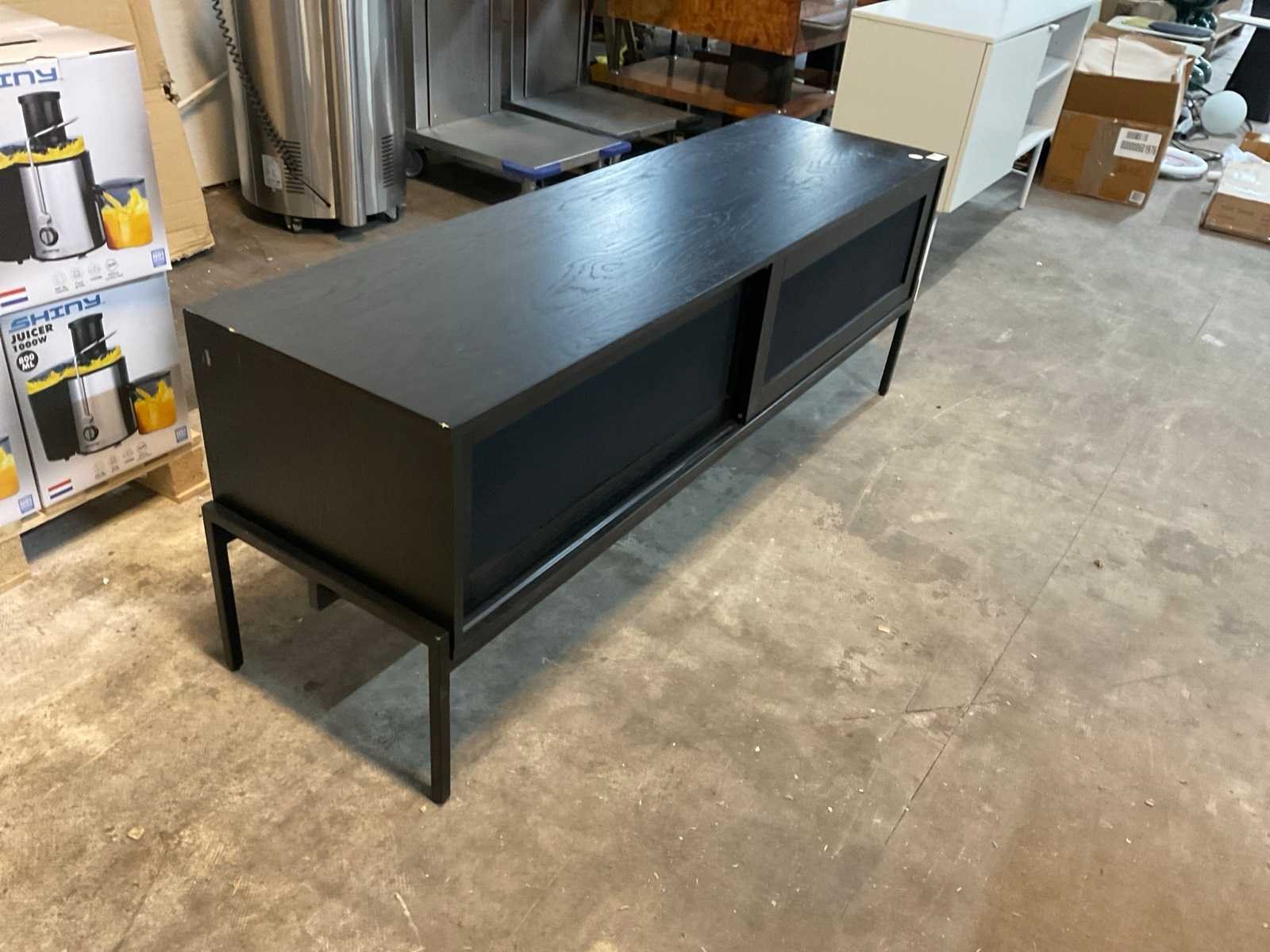 Kavel heeft beschadigingen, zie foto’s Merk: Zuiver Model: Hardy Kleur: Zwart Breedte: 160cm Hoogte: 60cm Diepte: 45cm