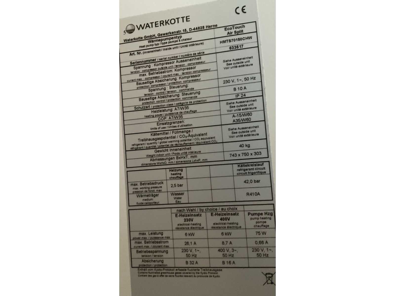Merk: Waterkotte Model: HMTS70150CHW Kleur: Wit Gewicht: 40kg Lengte: 743cm Breedte: 303cm Hoogte: 750cm