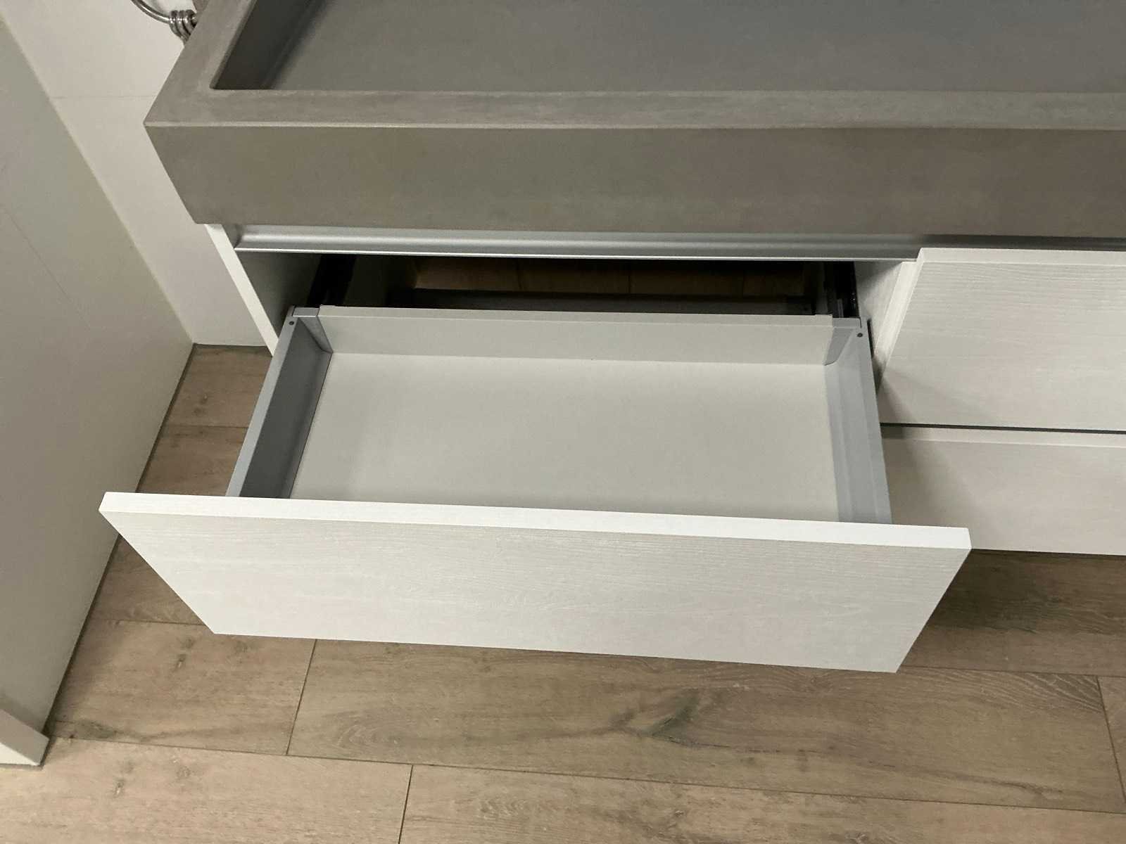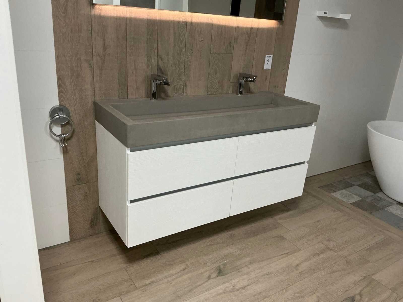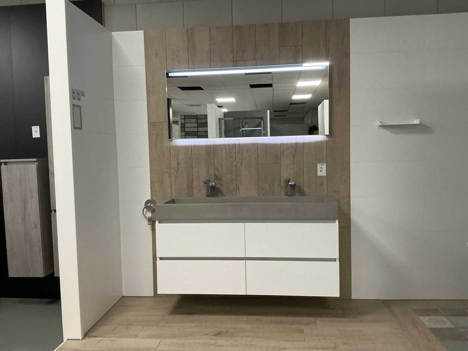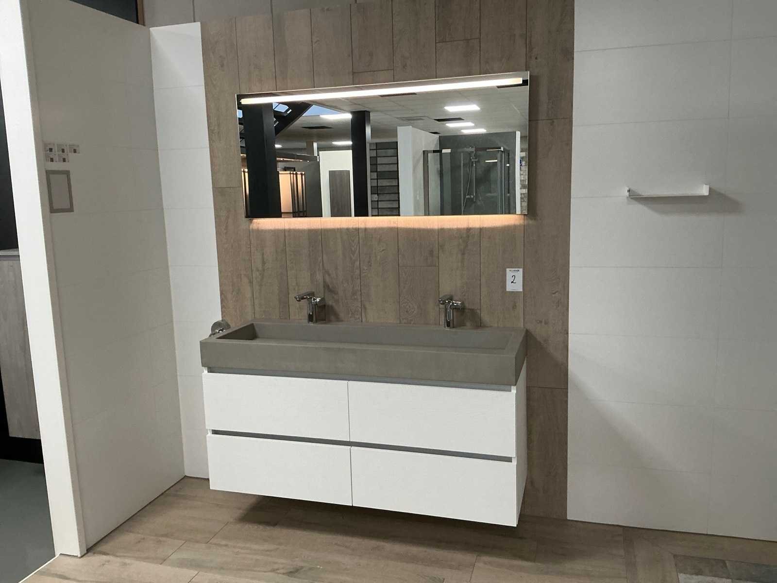 Voorzien van Evolve Duo wastafel (140x50cm), 2x Hansgrohe Focus mengkraan en LED spiegel met dimmer, kleurwissel en spiegelverwarming (140x60cm) en maatwerk onderkast, 4 lades Blum softclose (140x55cm). Merk: DYSIGN