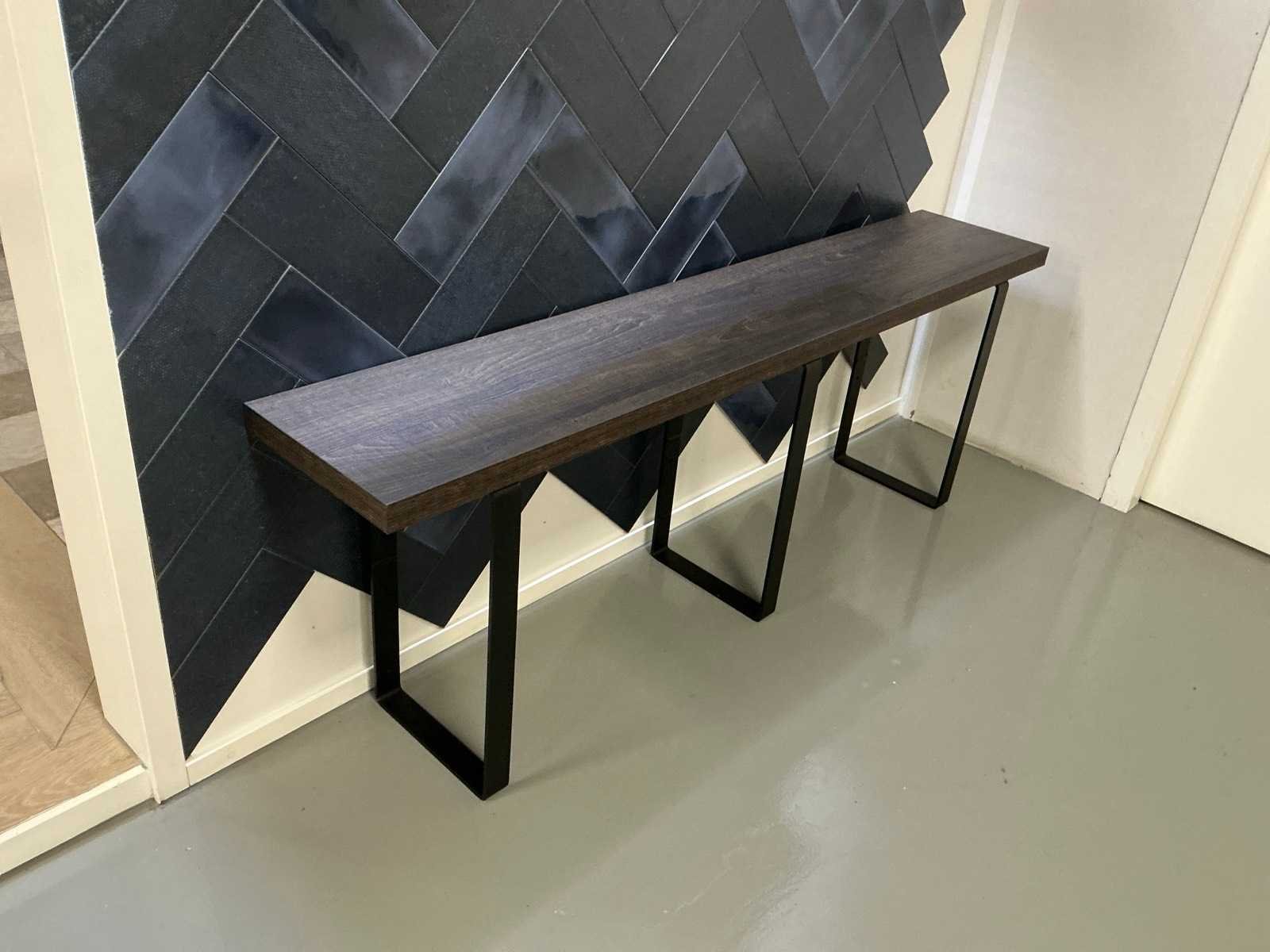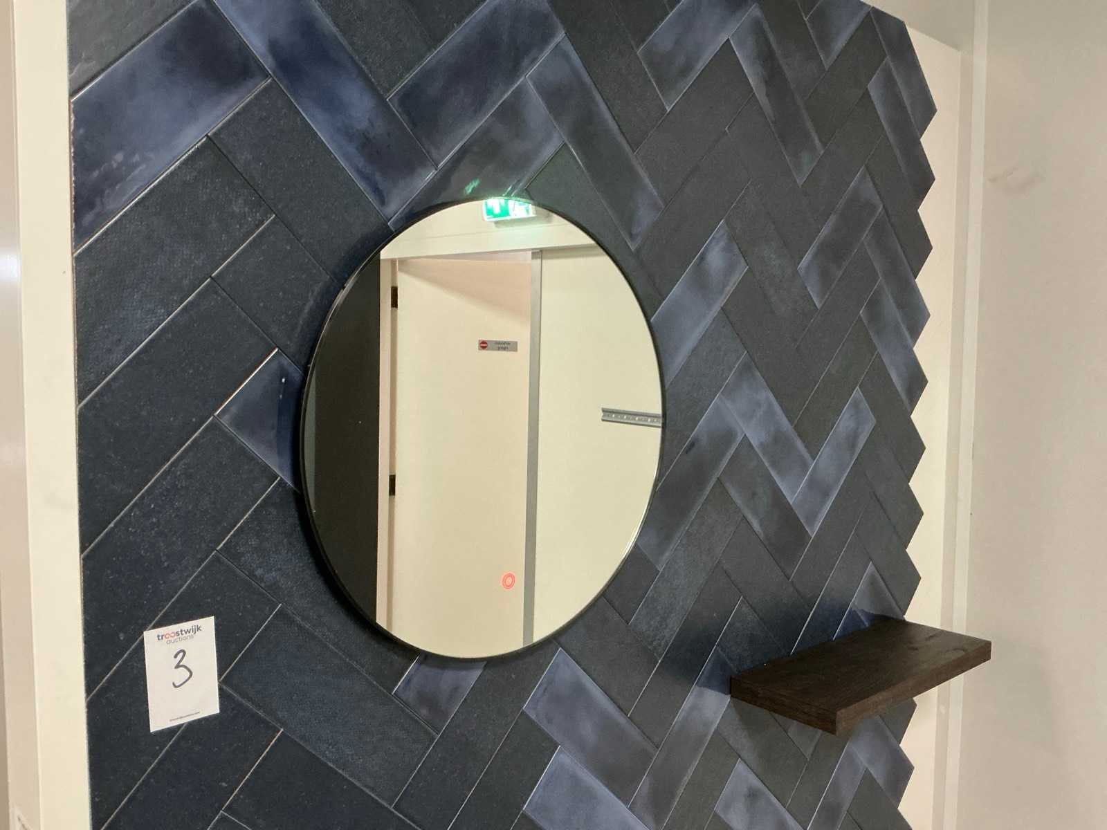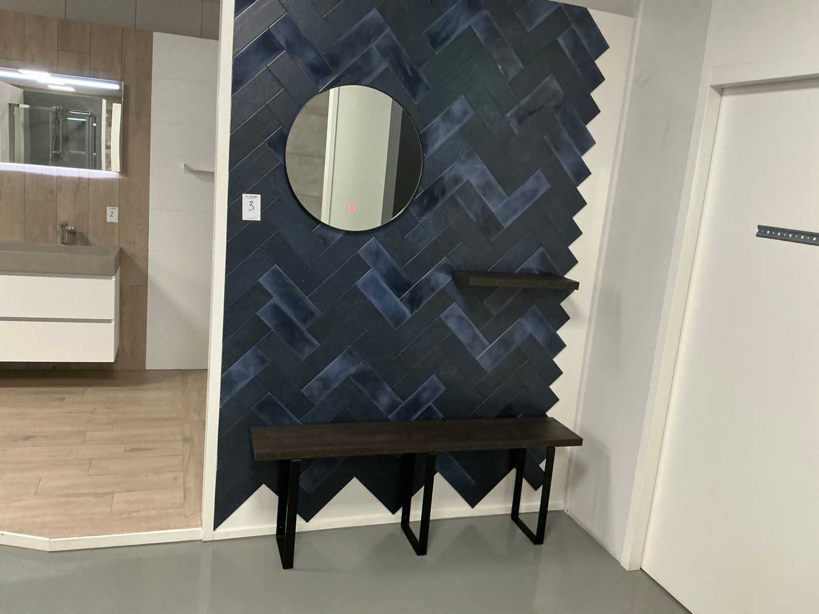 Spiegel Ø60cm, bankje 150x28x53cm, plank 55x20cm. Houtkleur S071 decolegno