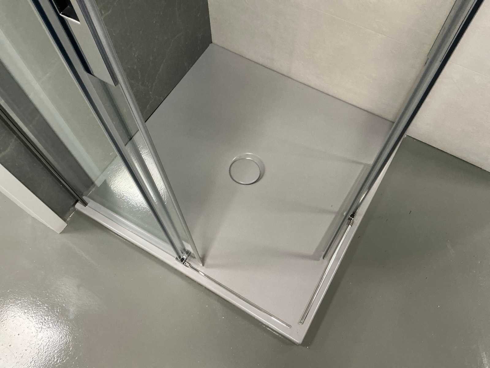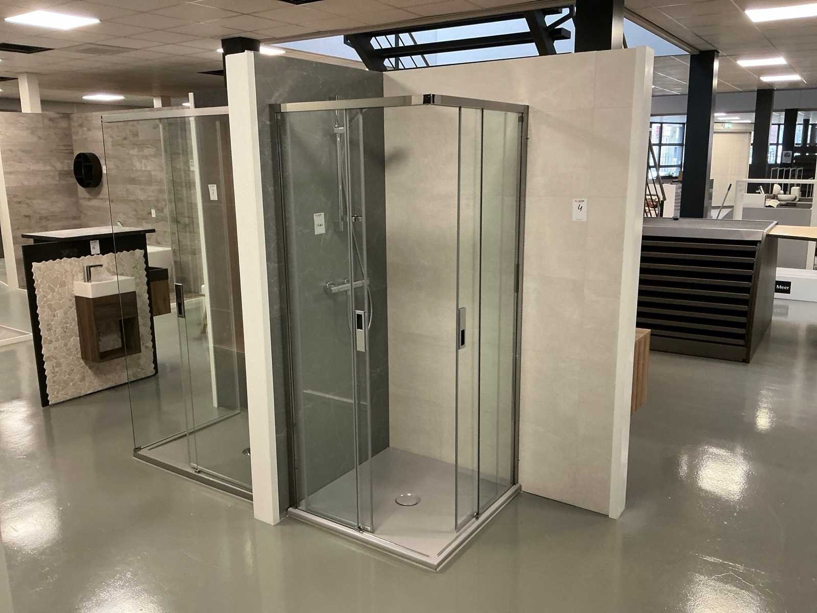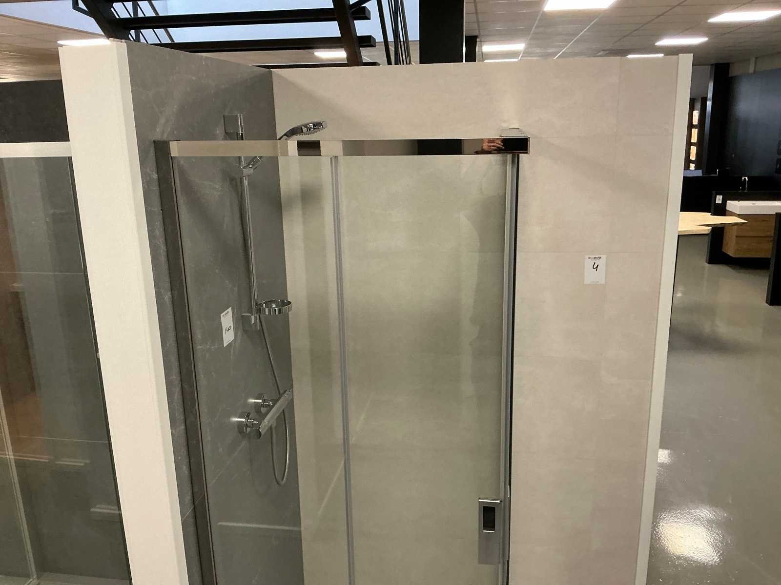 Novellini Opera hoekschuifdeur. Met softclose, uitvoering chroom. BETTE Floor, titaanstaal - zelfdragend (slechts 3 cm hoogte) - kleur lichtgrijs (410 silver). Eventueel losse afvoerset ook verkrijgbaar ( kavel 276, 277 en 278). Merk: BETTE / Novellini Lengte: 90cm Breedte: 90cm Hoogte: 200cm