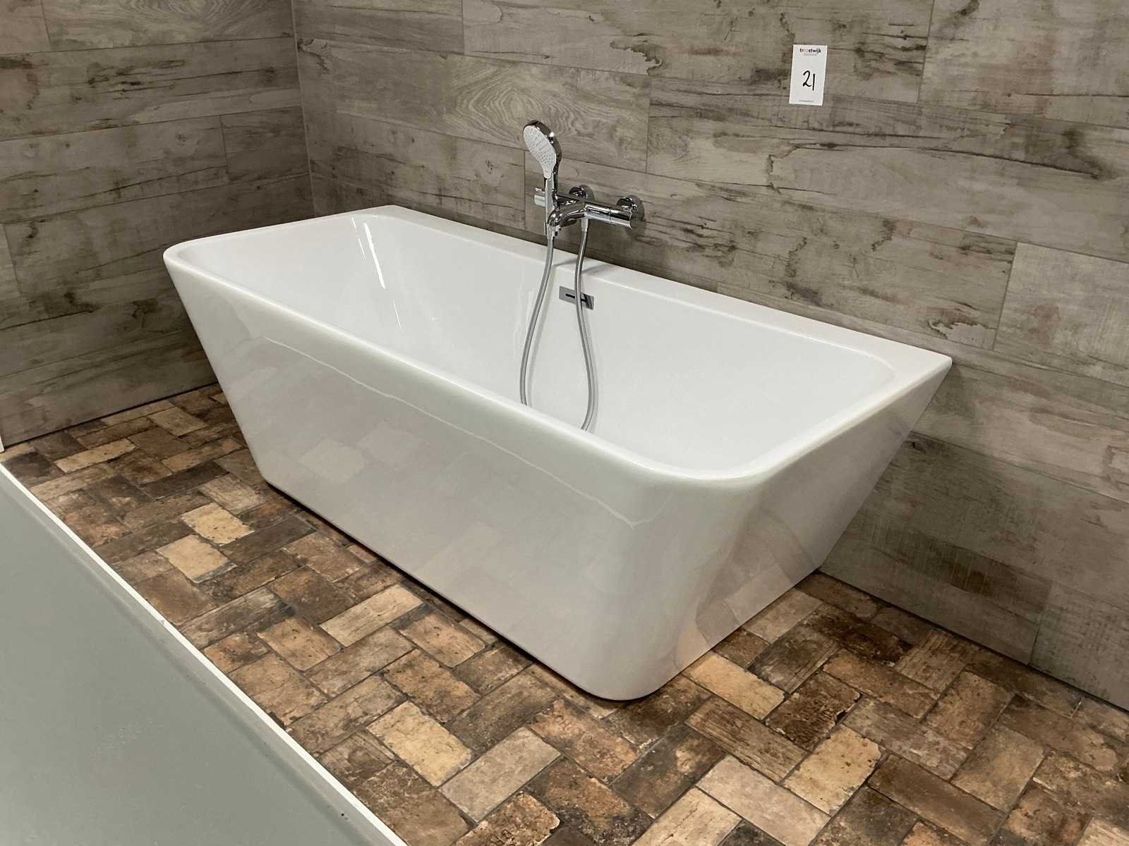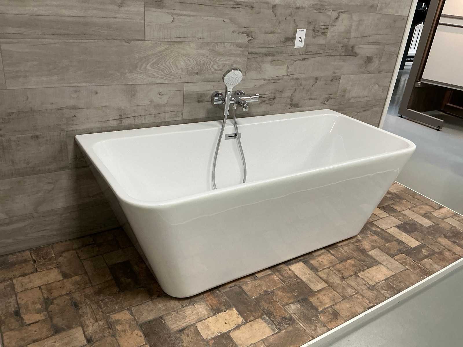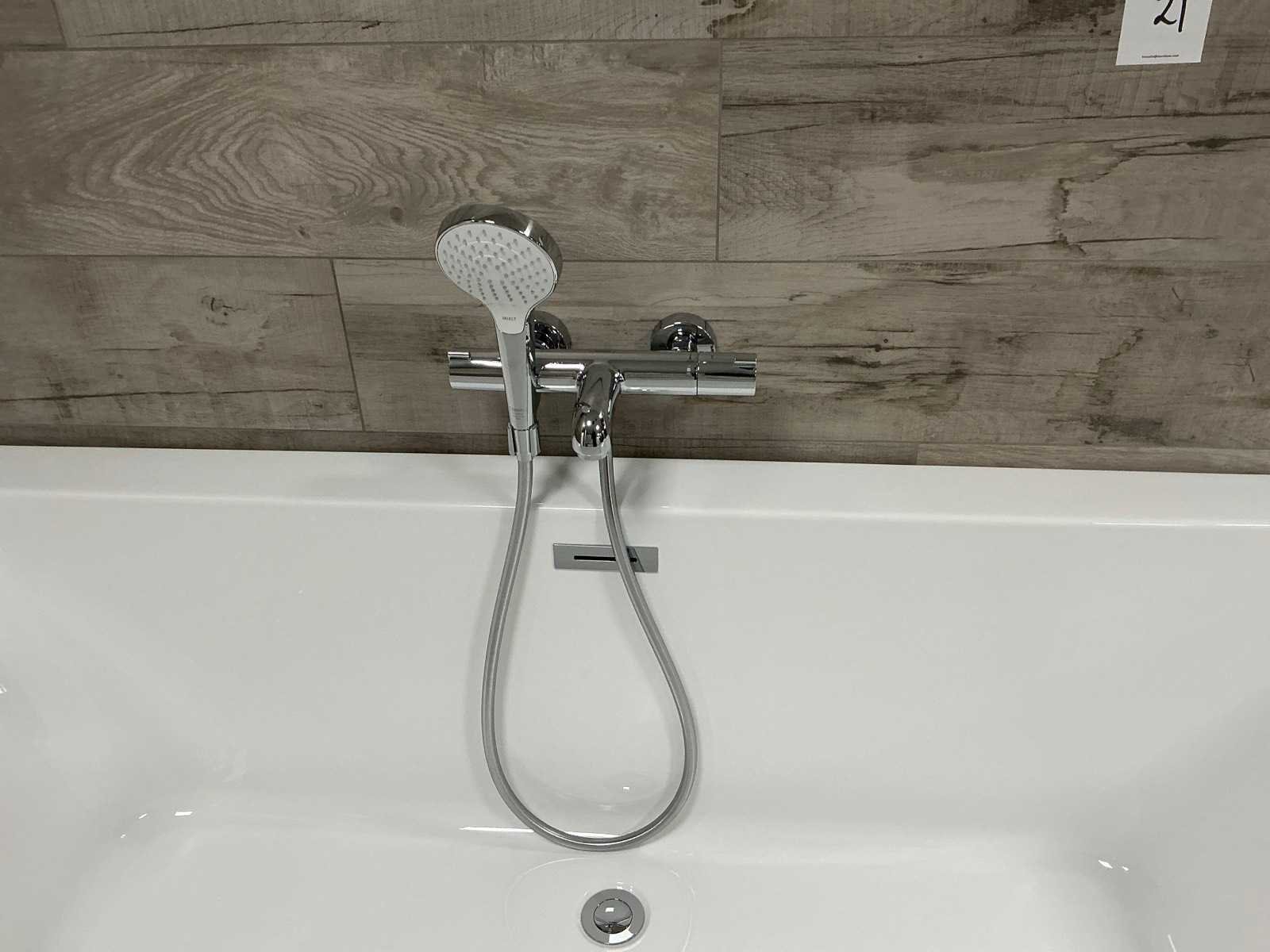 Semi vrijstaand, back to the wall Ligbad. Acryl wit. Voorzien van Hansgröhe CL1001 thermostaat badkraan en Hansgrohe select handdouche met Reno houder. Lengte: 170cm Breedte: 75cm Hoogte: 60cm