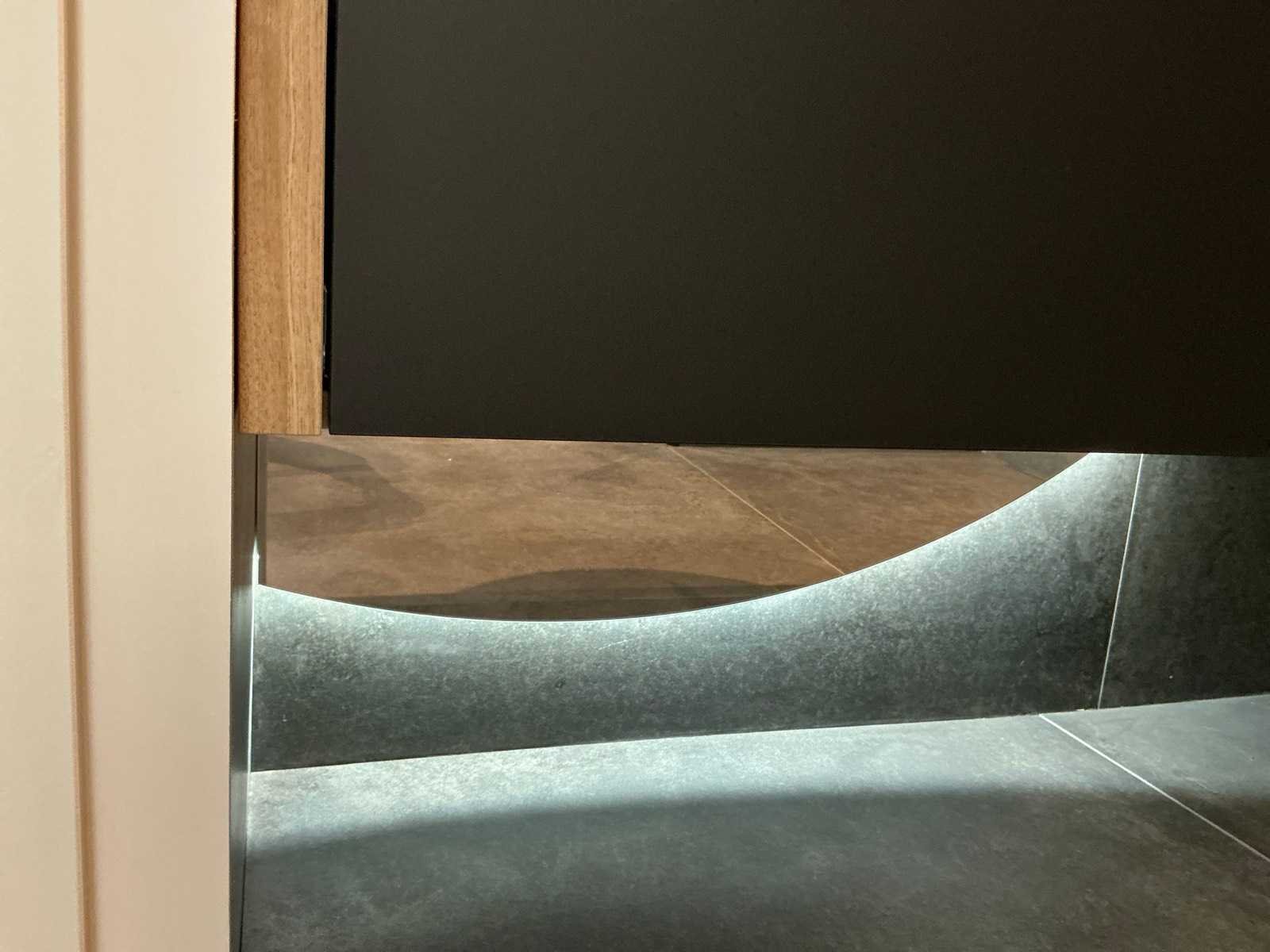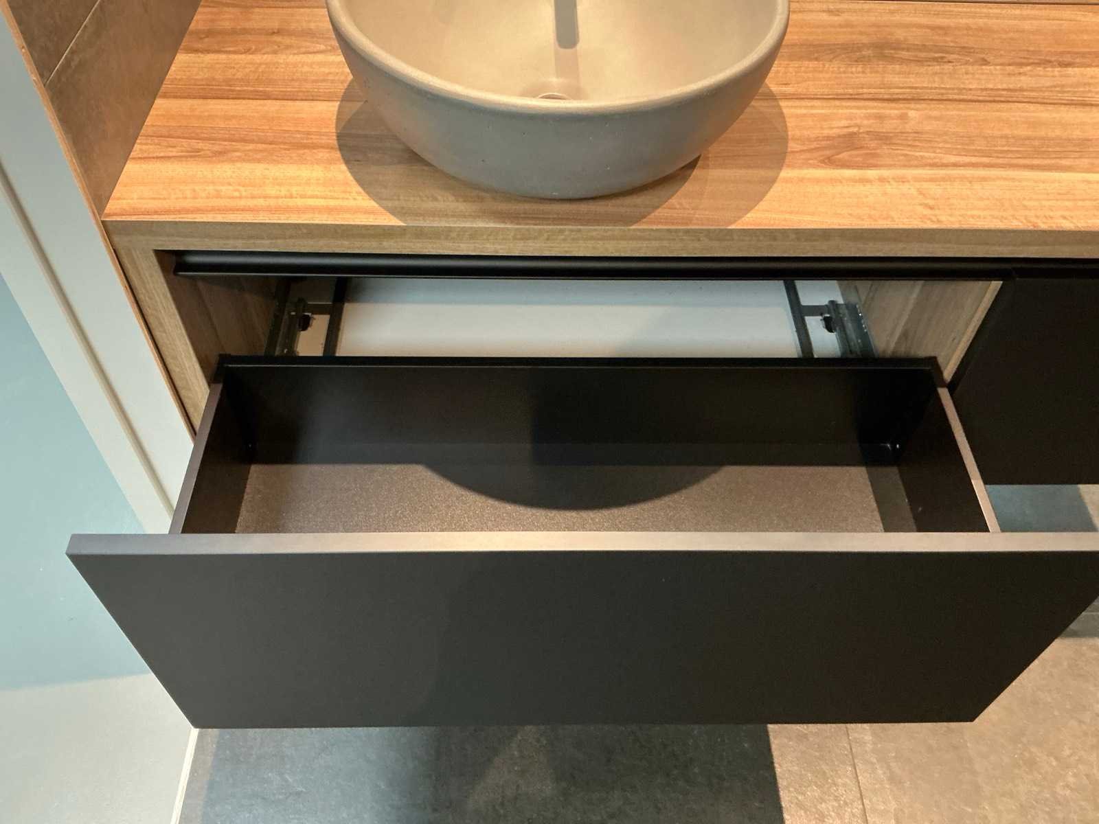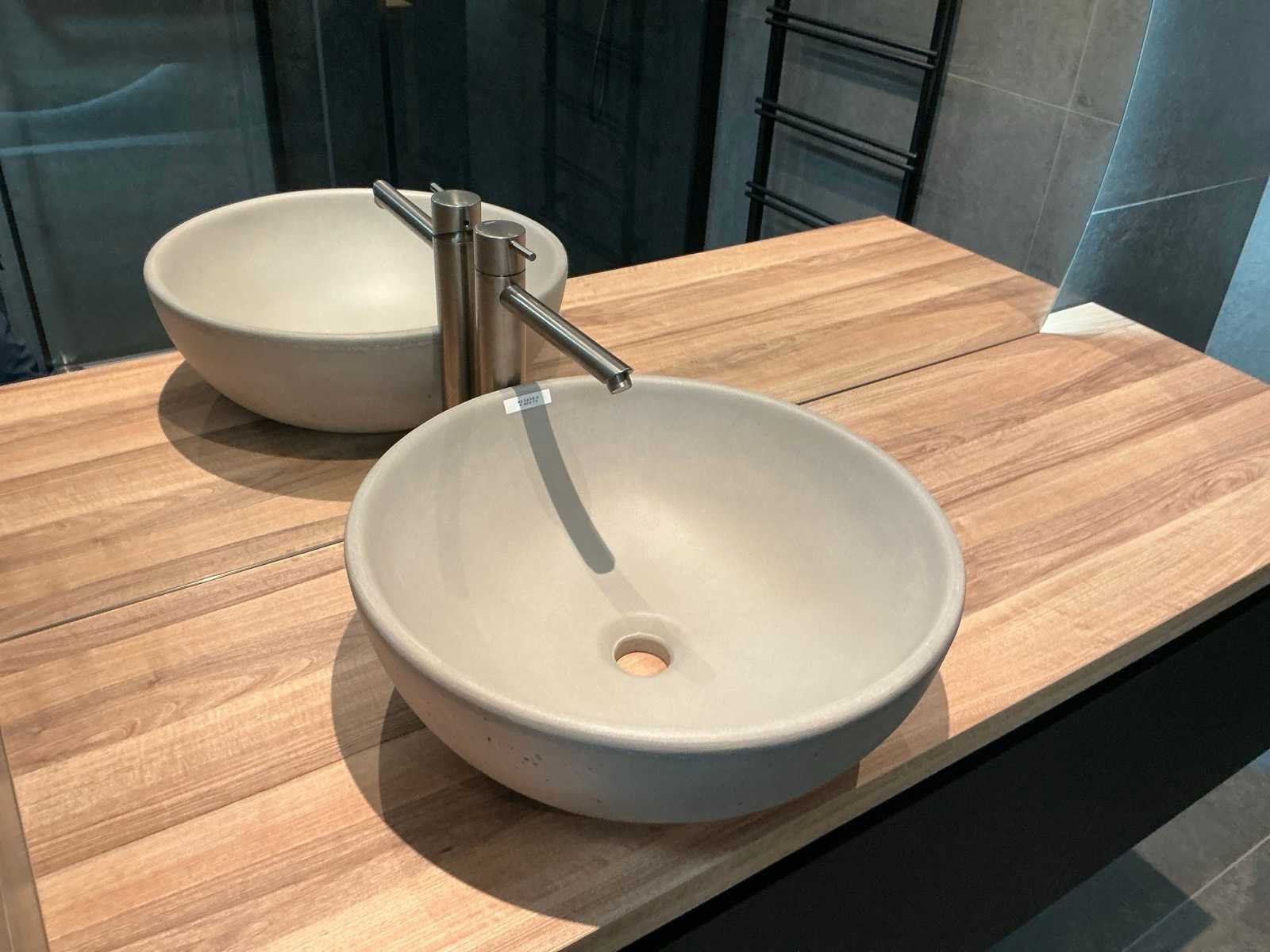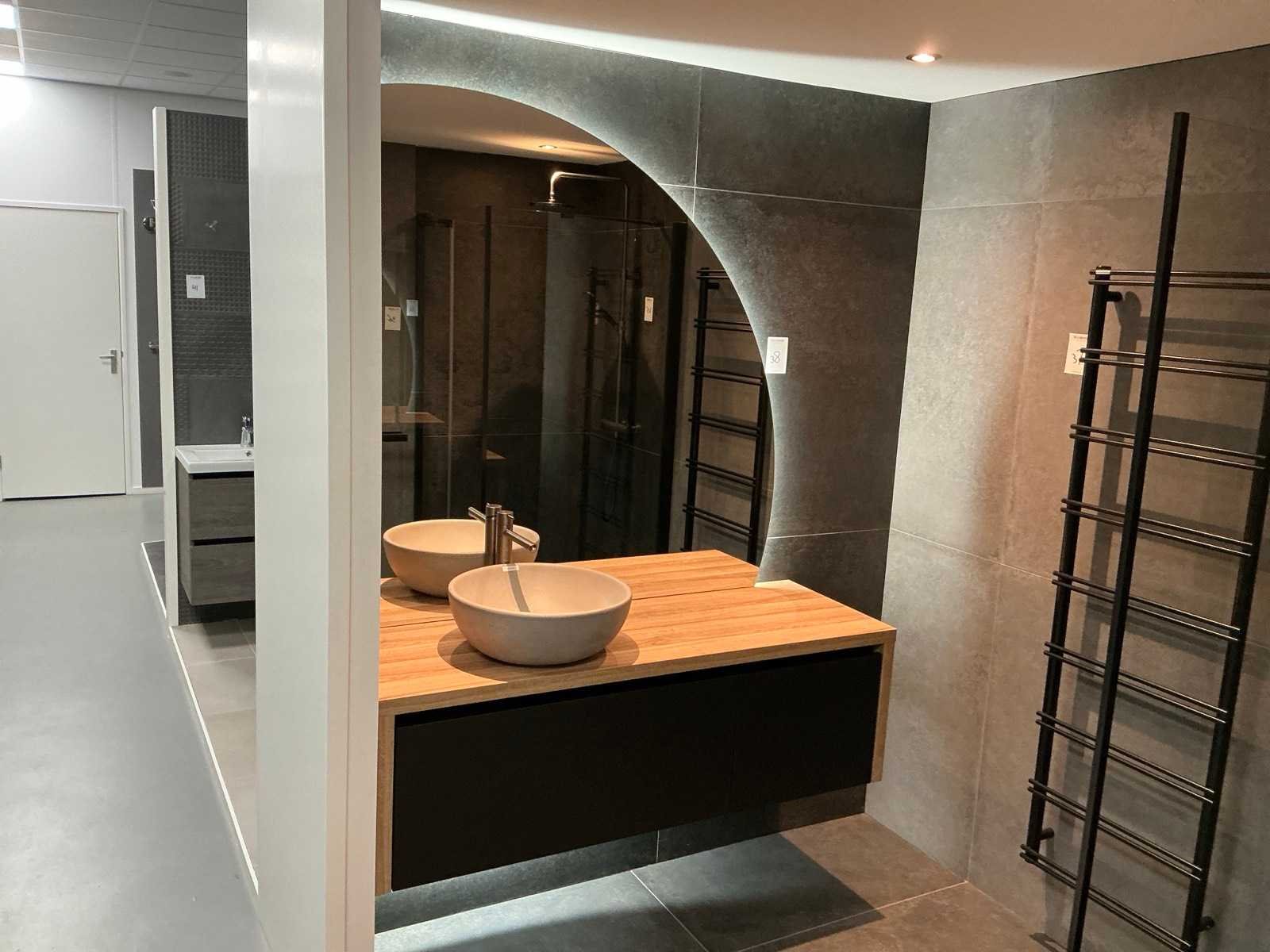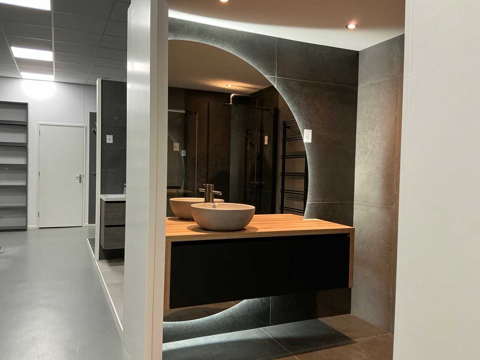 Bestaande uit een Evolve beton opzetwaskom (43,5x16,5cm) , Hotbath wastafelmengkraan, sunset LED-spiegel (210x130cm) met indirect licht, Blum softclose ladegeleiders, onderkast (140x48x44cm). Merk: DYSIGN
