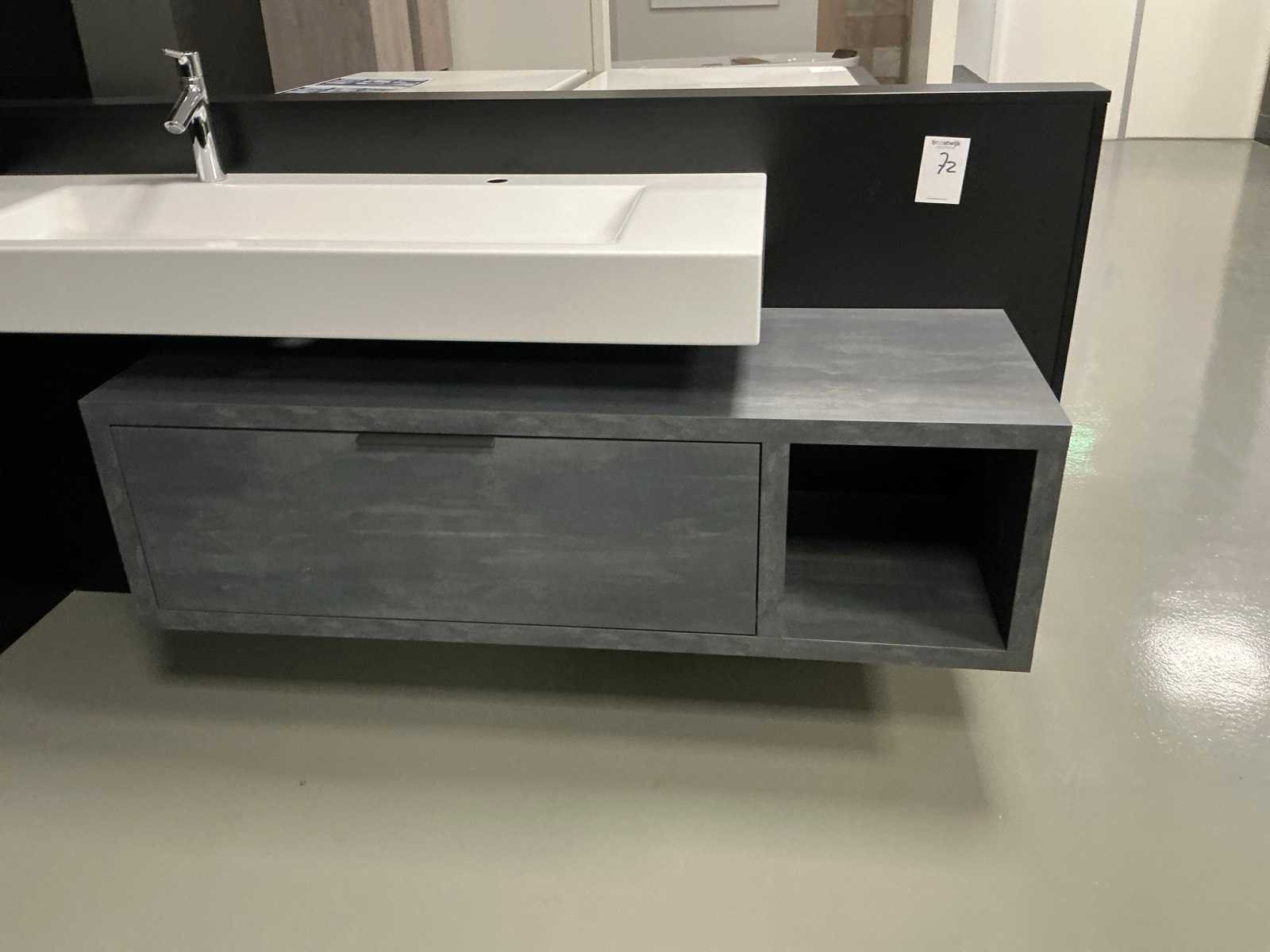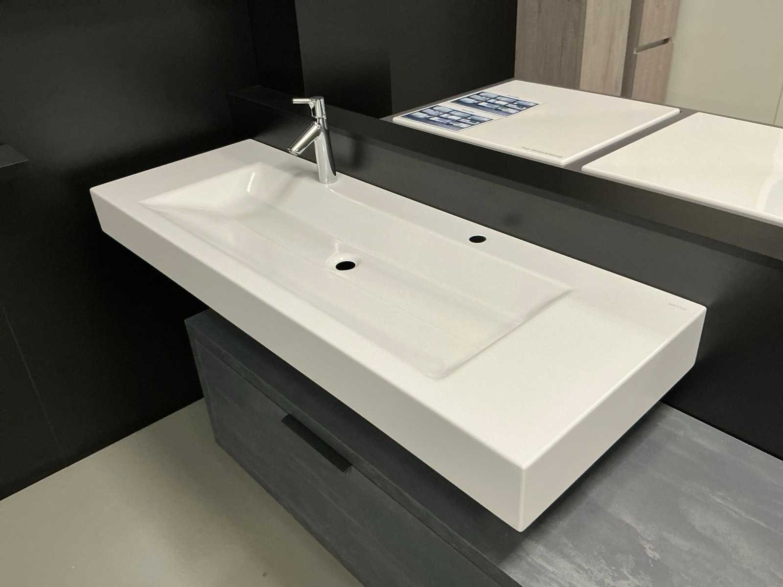 Voorzien van 1 Hansgröhe Talis wastafelmengkraan. Onderkast 140x50x40cm, Wastafel BETTE titaanstaal. Mat wit 440 Merk: BETTE / DYSIGN Lengte: 140cm Breedte: 50cm Hoogte: 13cm