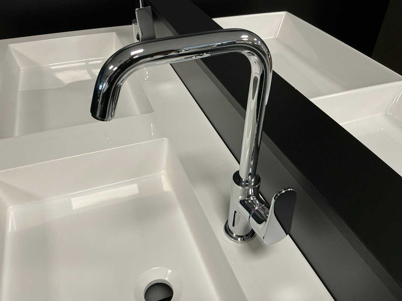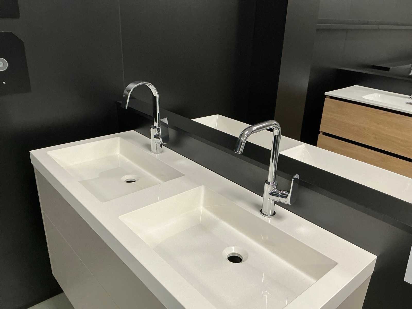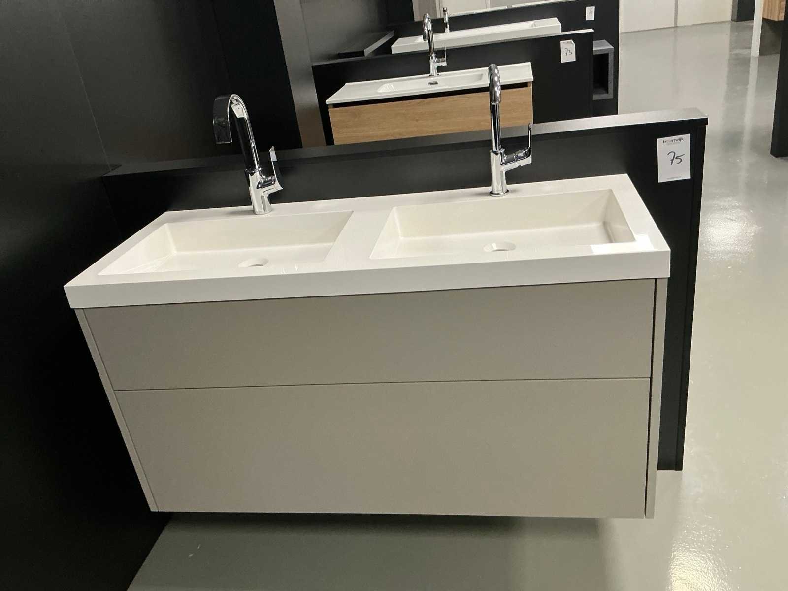 Onderkast met touch open lades, merk: Blum. Kleur: mat taupe. Wastafel met 2 wasbakken. Voorzien van Hansgröhe wastafelmengkranen, Vivenis en Metris. Merk: DYSIGN Lengte: 120cm Breedte: 47cm Hoogte: 63cm