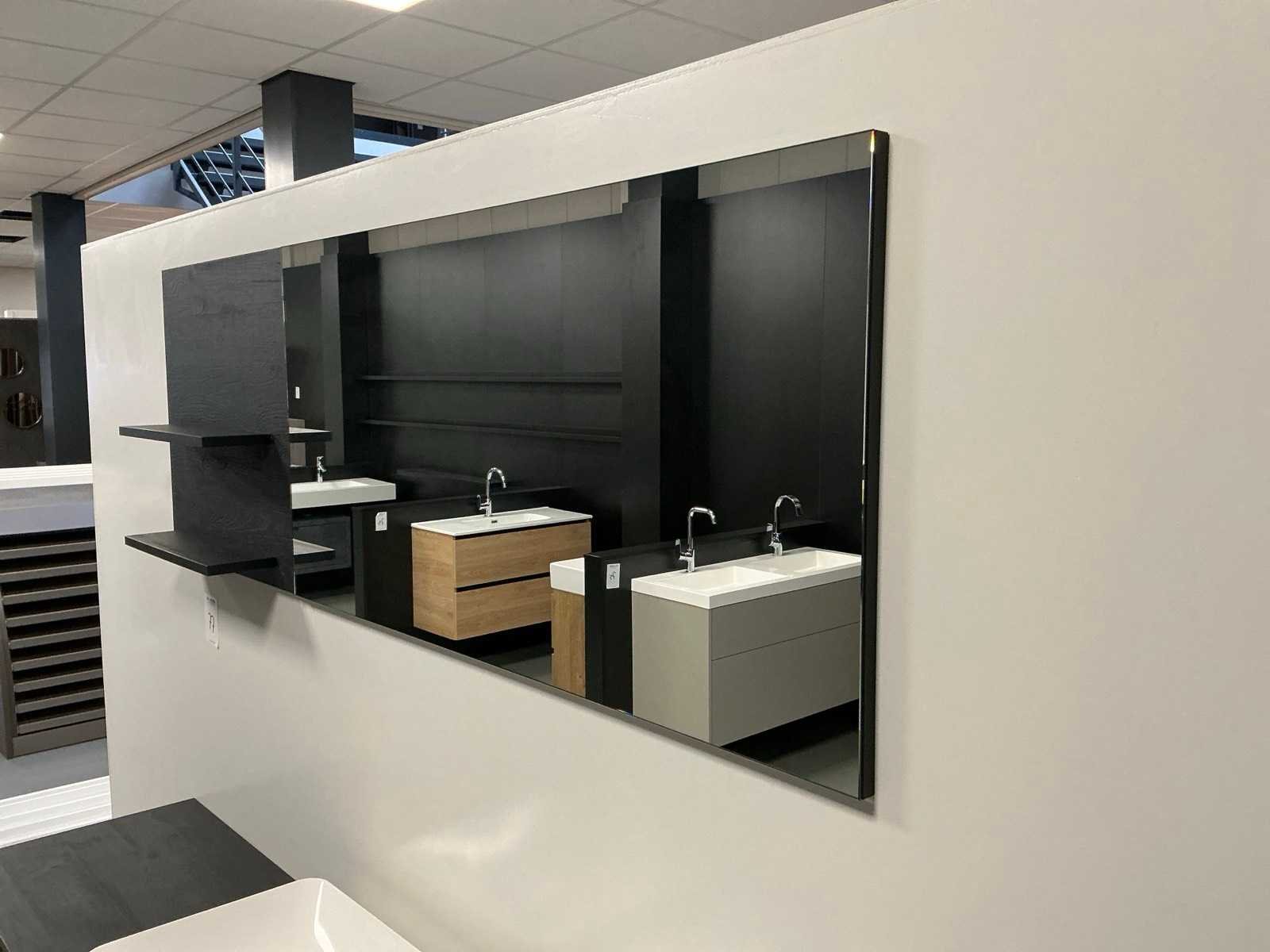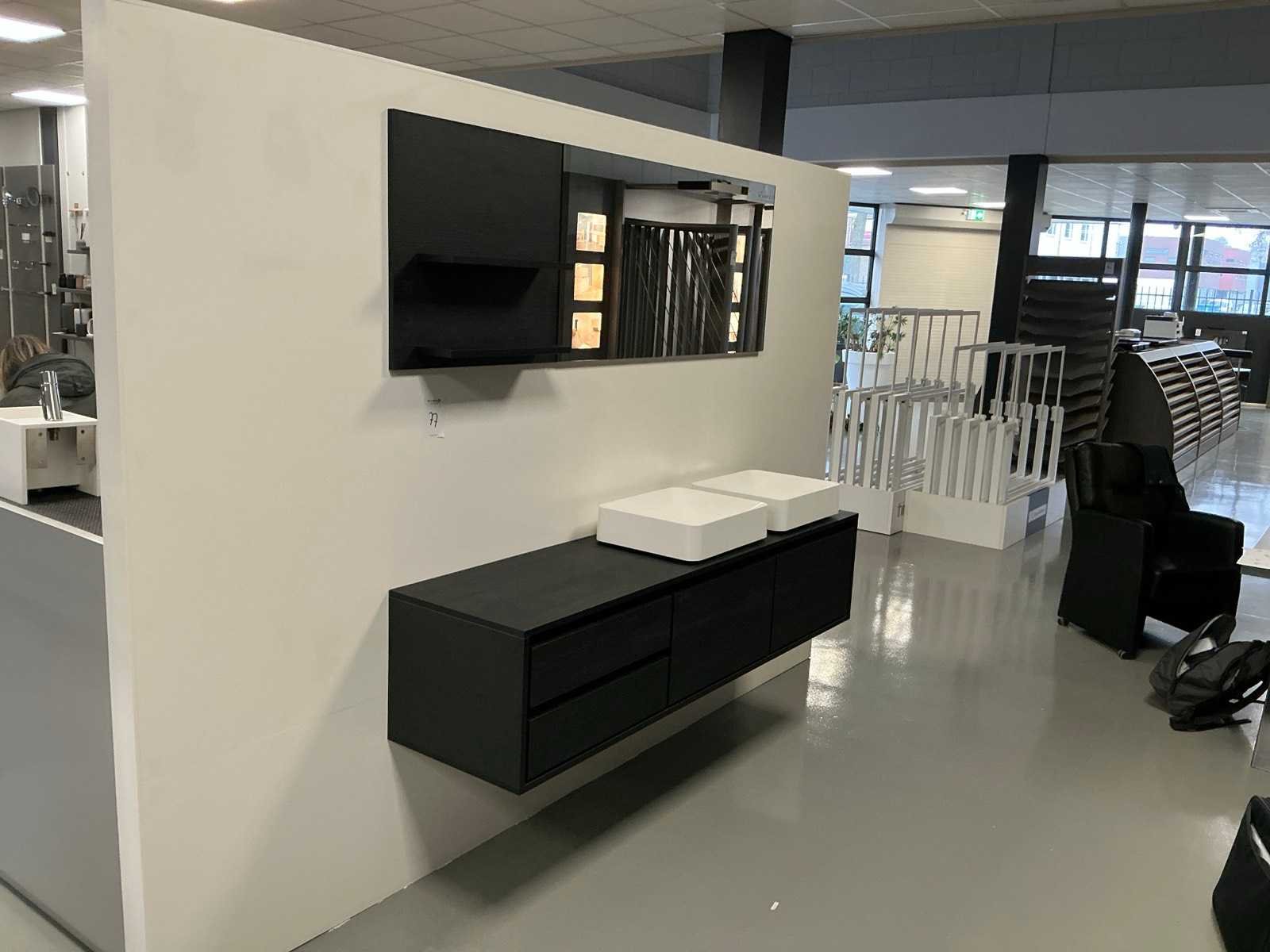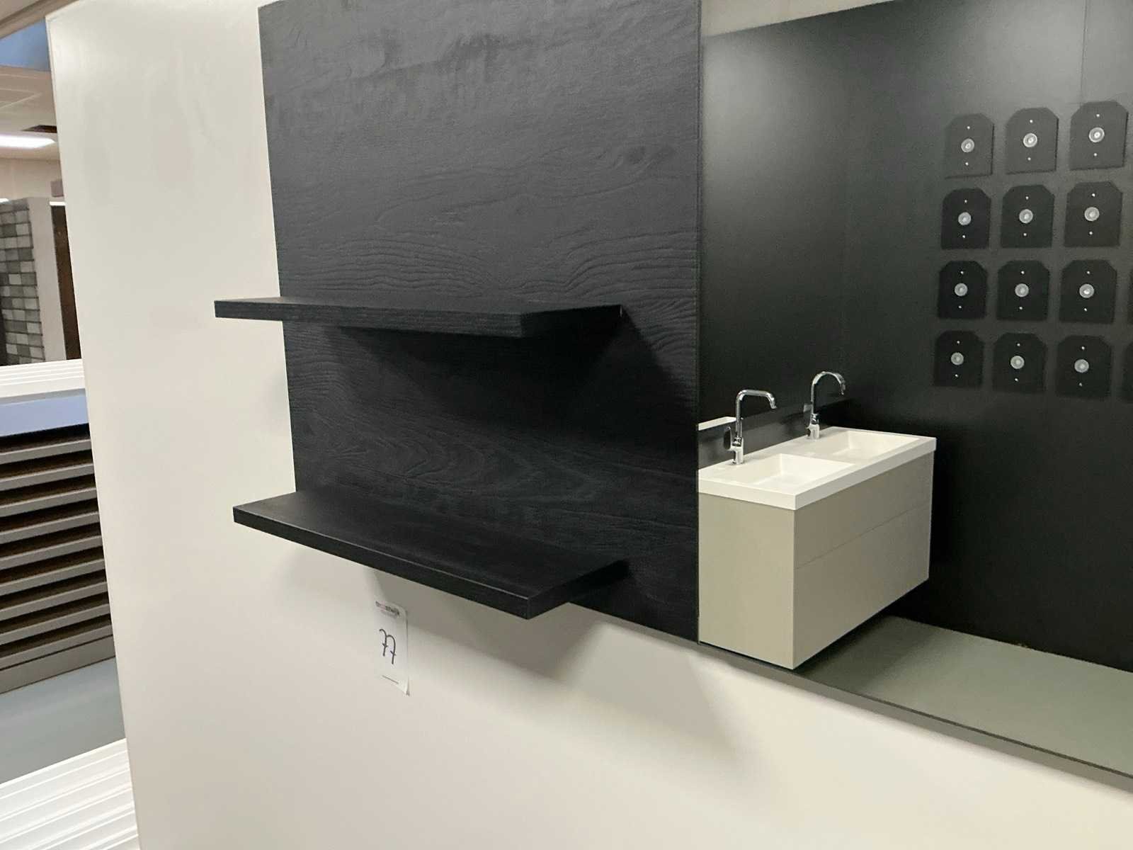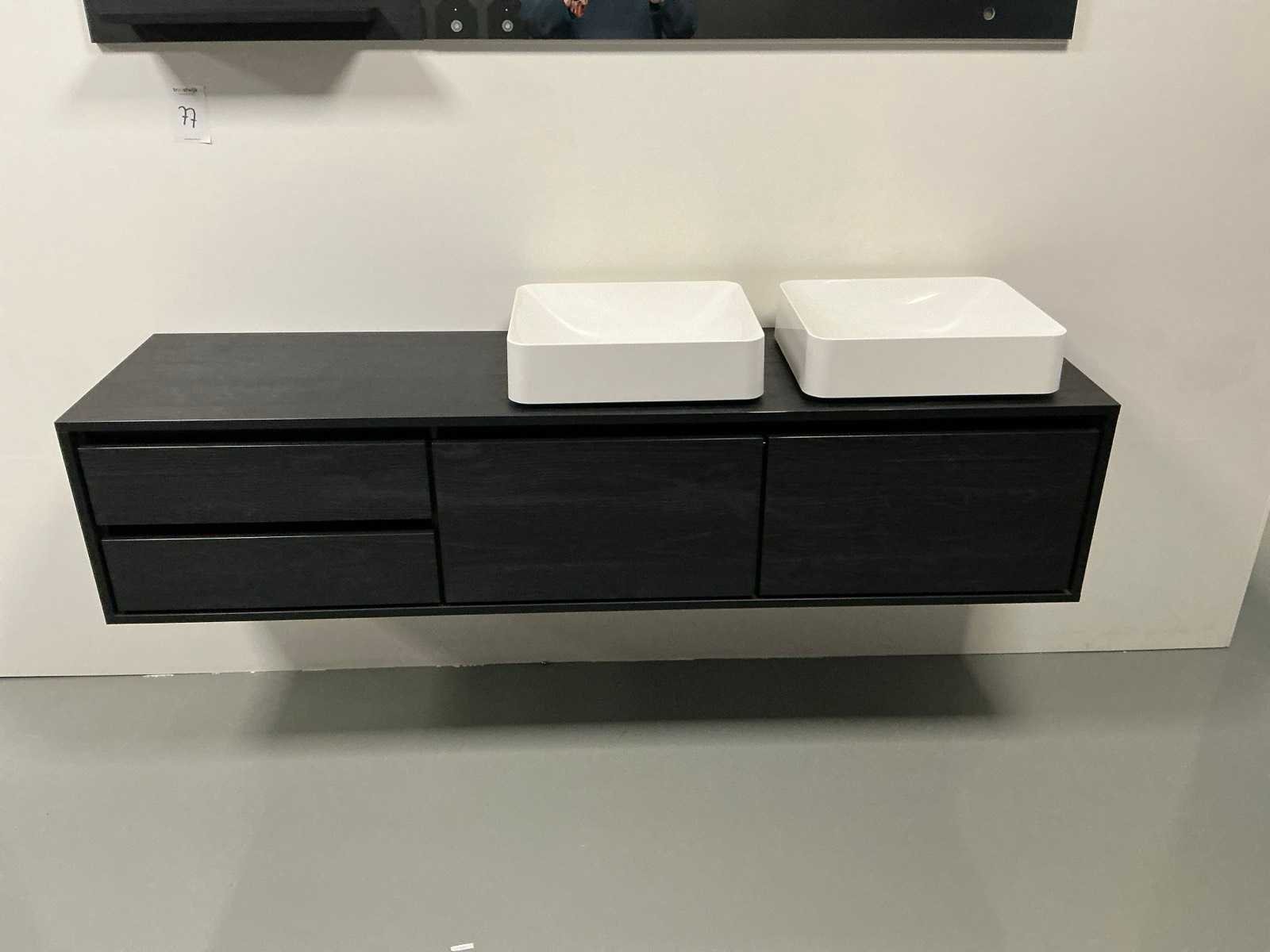 Badmeubel met 4 softclose lades van Blum. Meubelkleur: U129 Sherwood van Decolegno. Spiegel 60x180cm, voorzien van 2 opzetwaskommen. Merk: DYSIGN Lengte: 180cm Breedte: 46cm Hoogte: 40cm