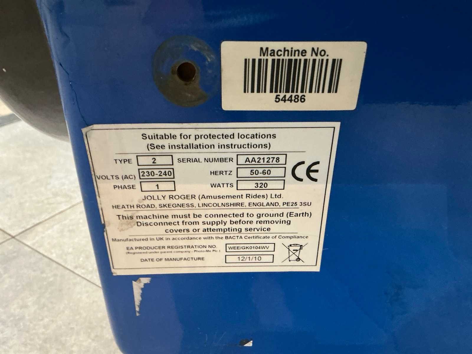 Verrijdbaar, voorzien van muntinvoer en sleutels. Merk: Jolly Roger Model: 2 Lengte: 120cm Breedte: 68cm Hoogte: 125cm