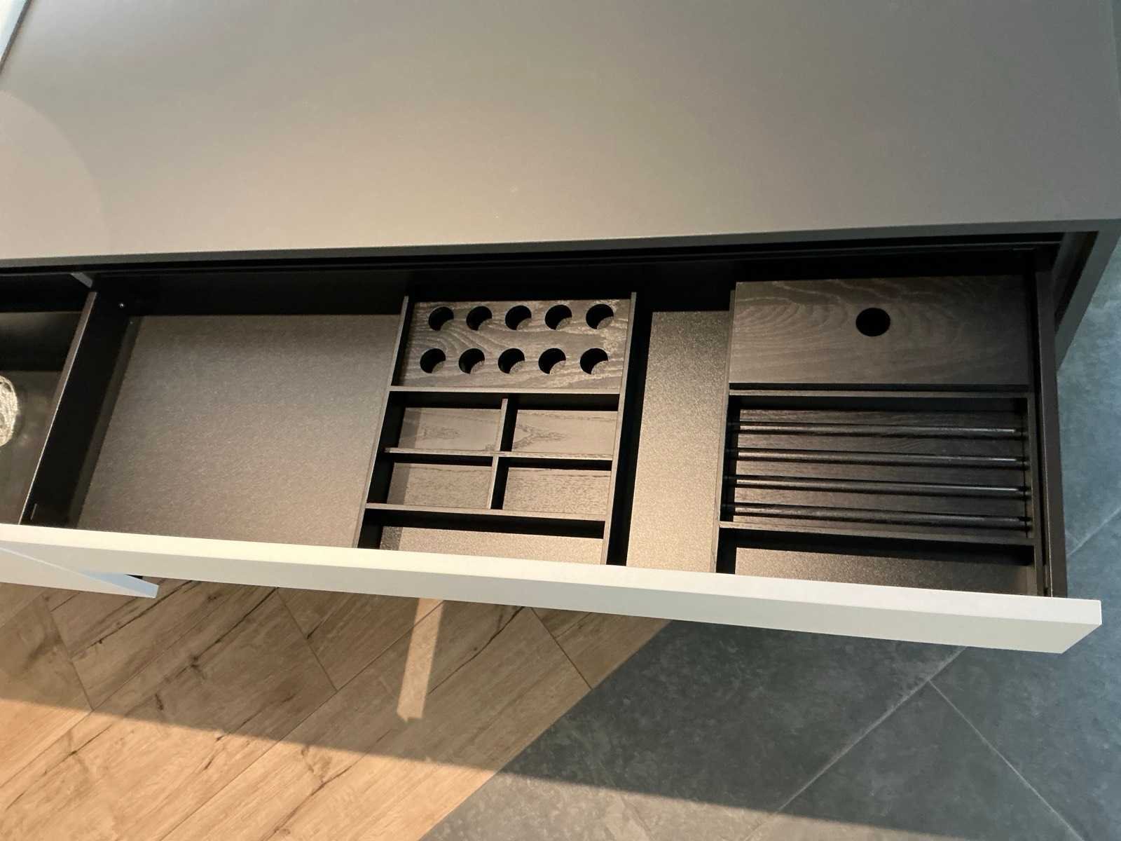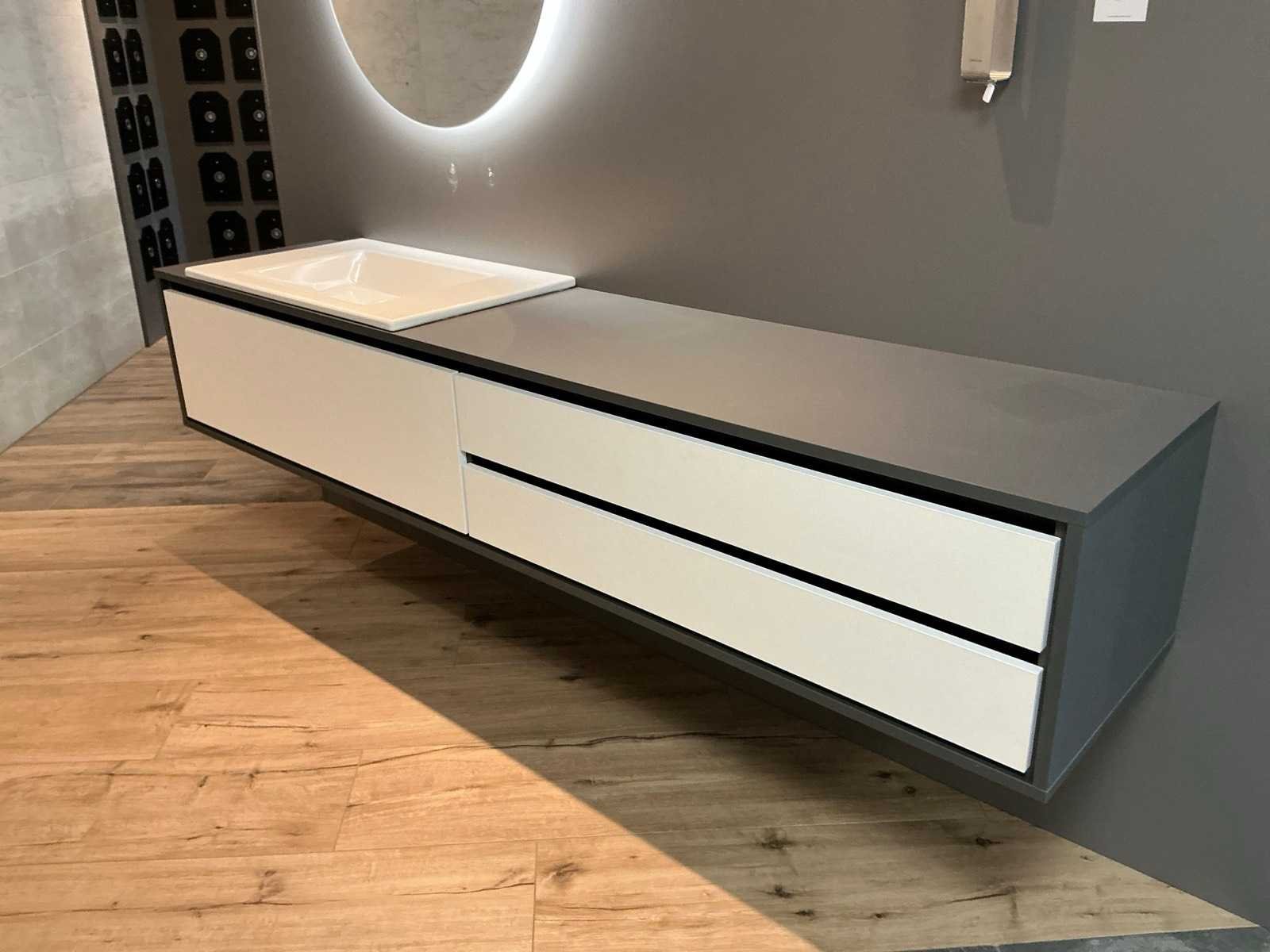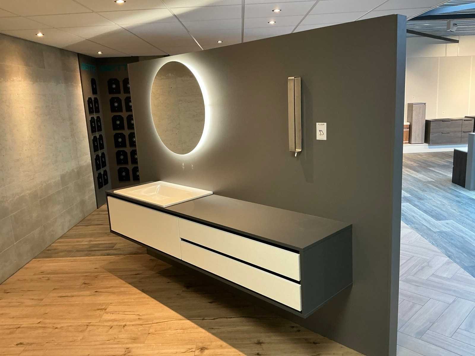 Bestaande uit een Bette wastafel 80x50cm, DYSIGN onderkast 230x50x40cm, Blum softclose lades, LED spiegel Ø80cm, Blomus handdoekhouder. Merk: Bette / DYSIGN