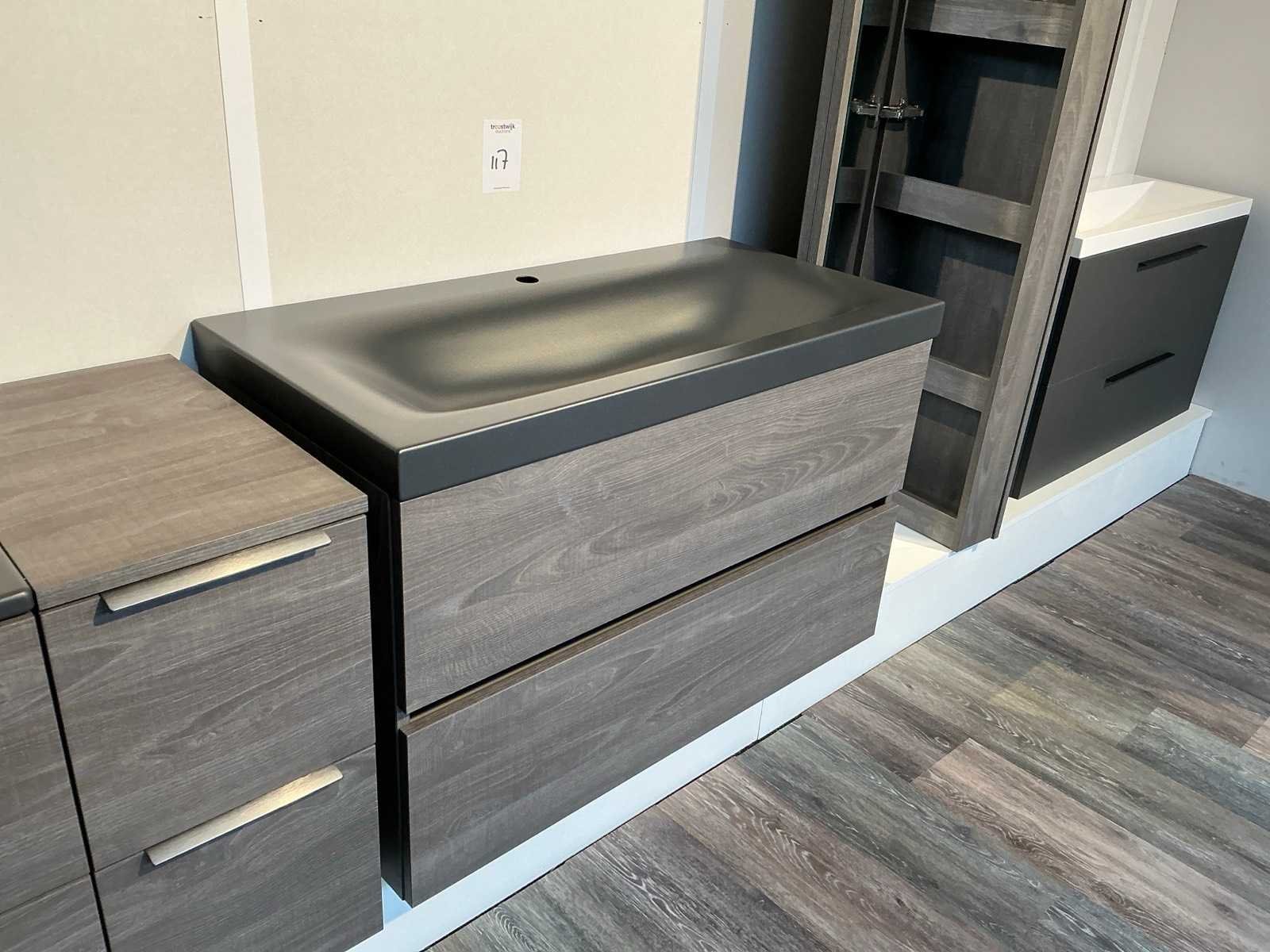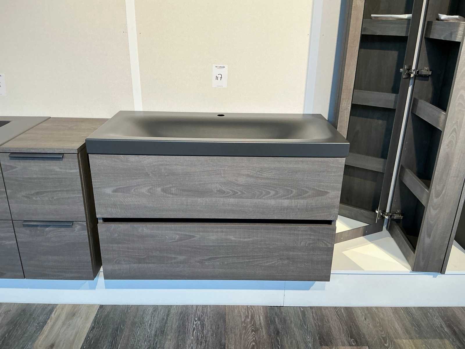 Omderkastkleur S095 Decolegno, wastafel antraciet (403). Voorzien van 2 Blum softclose lades. Merk: DYSIGN / Bette Lengte: 100cm Breedte: 50cm Hoogte: 64cm