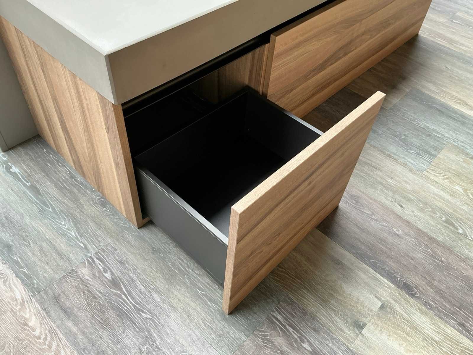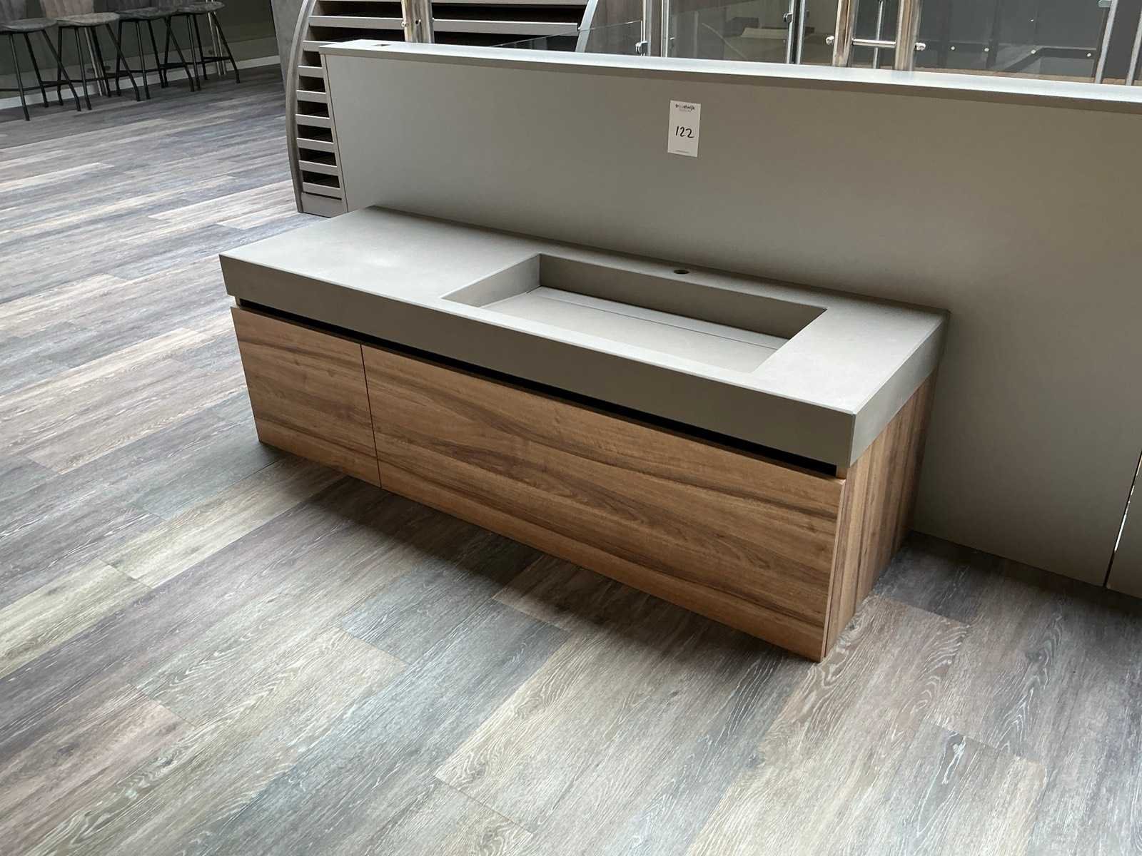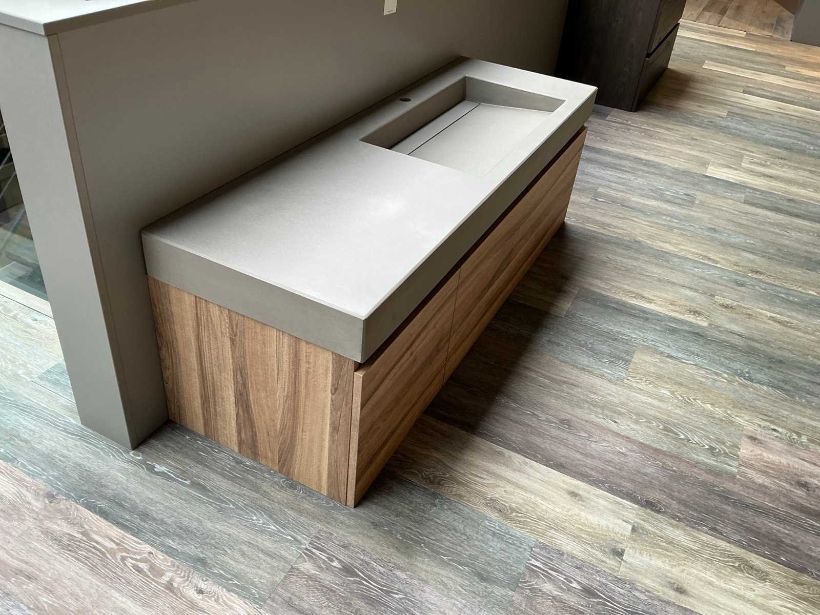 Wastafel Evolve Beton (gecoat), onderkast kleur LR77 Decolegno - Voorzien van 2 Blum softclose lades. Merk: DYSIGN / Evolve Lengte: 155cm Breedte: 50cm Hoogte: 51cm