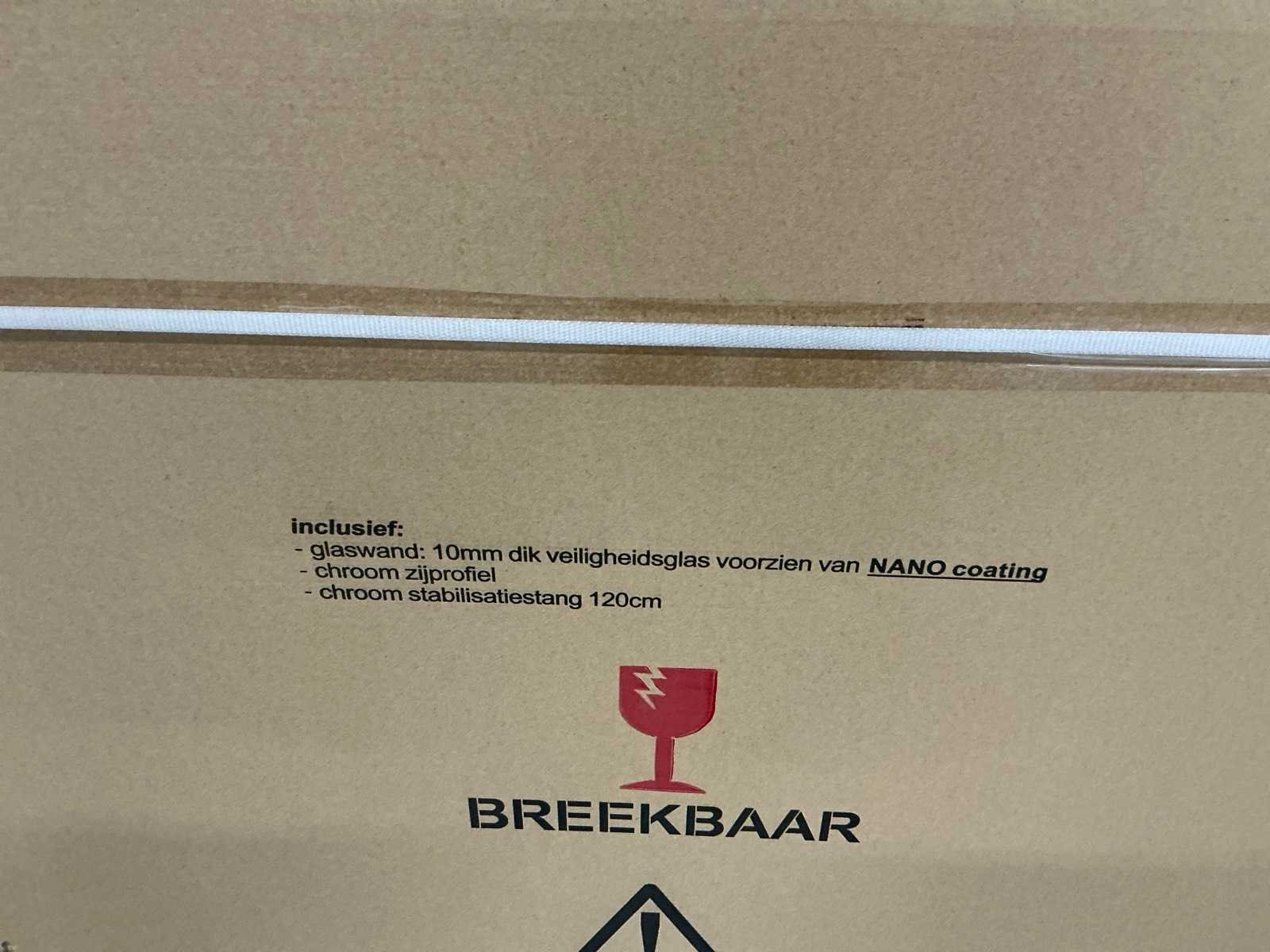 Glasdikte 10mm, voorzien van nano coating , chroom zijprofiel, 120cm chromen stabilisatie stang, ongebruikt in doos Lengte: 118cm Hoogte: 200cm