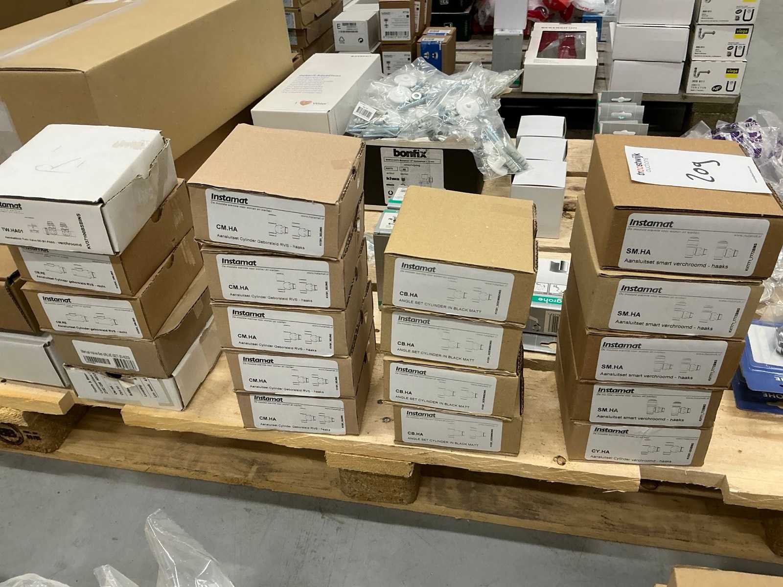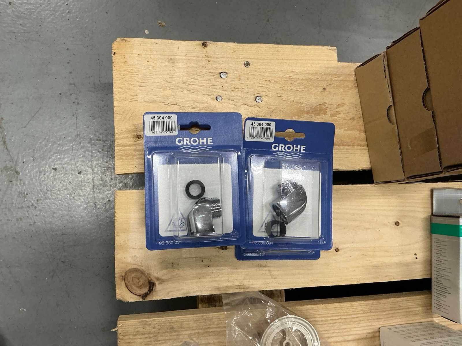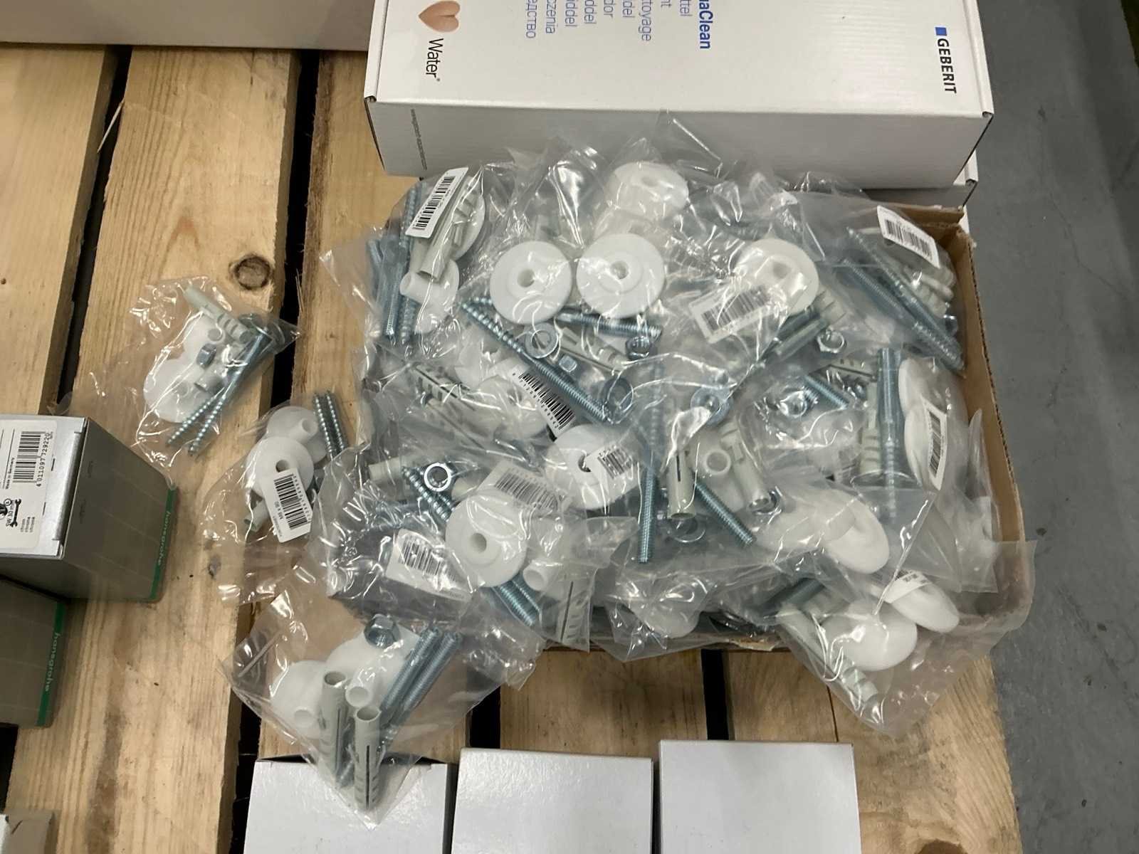 Verschillende soorten en maten ongebruikt in doos van Hansgrohe, Grohe, Instamat, Geberit, Bonfix