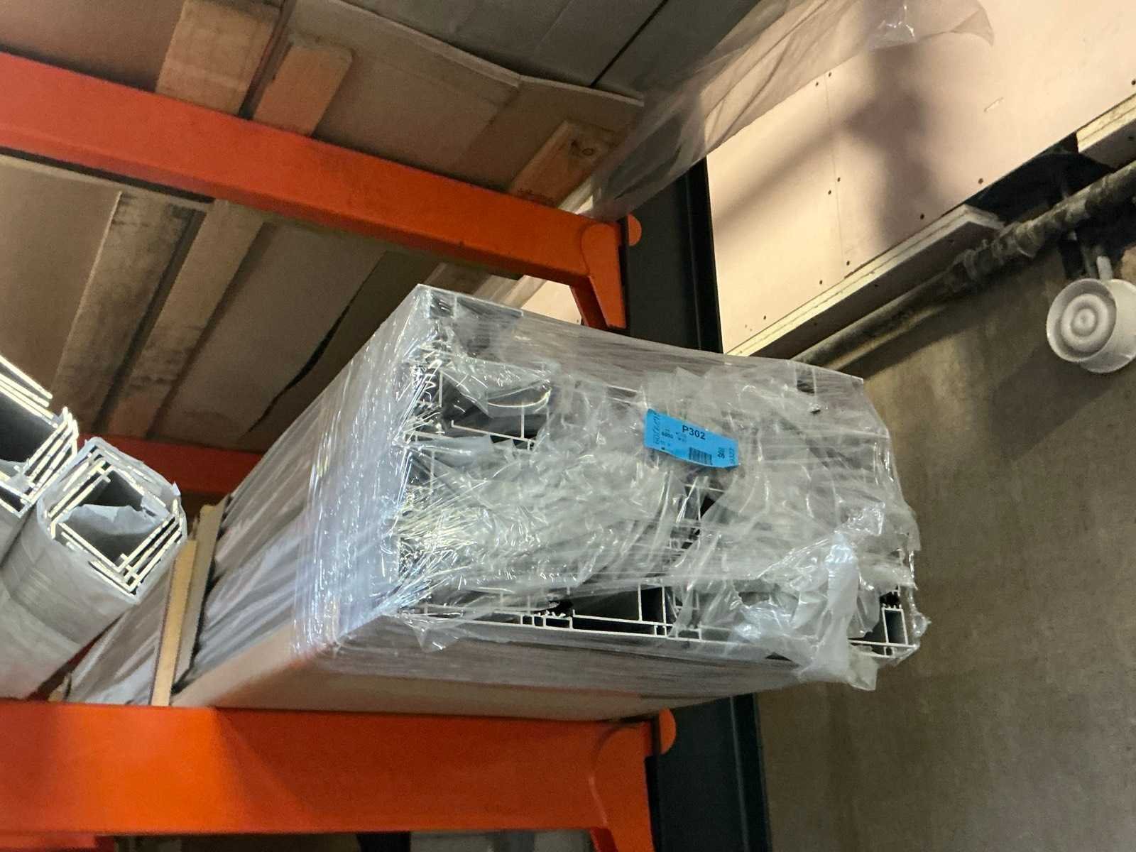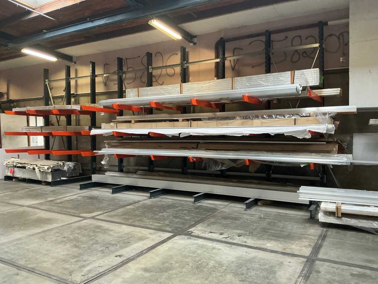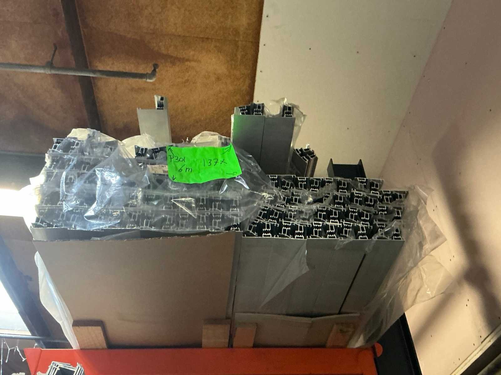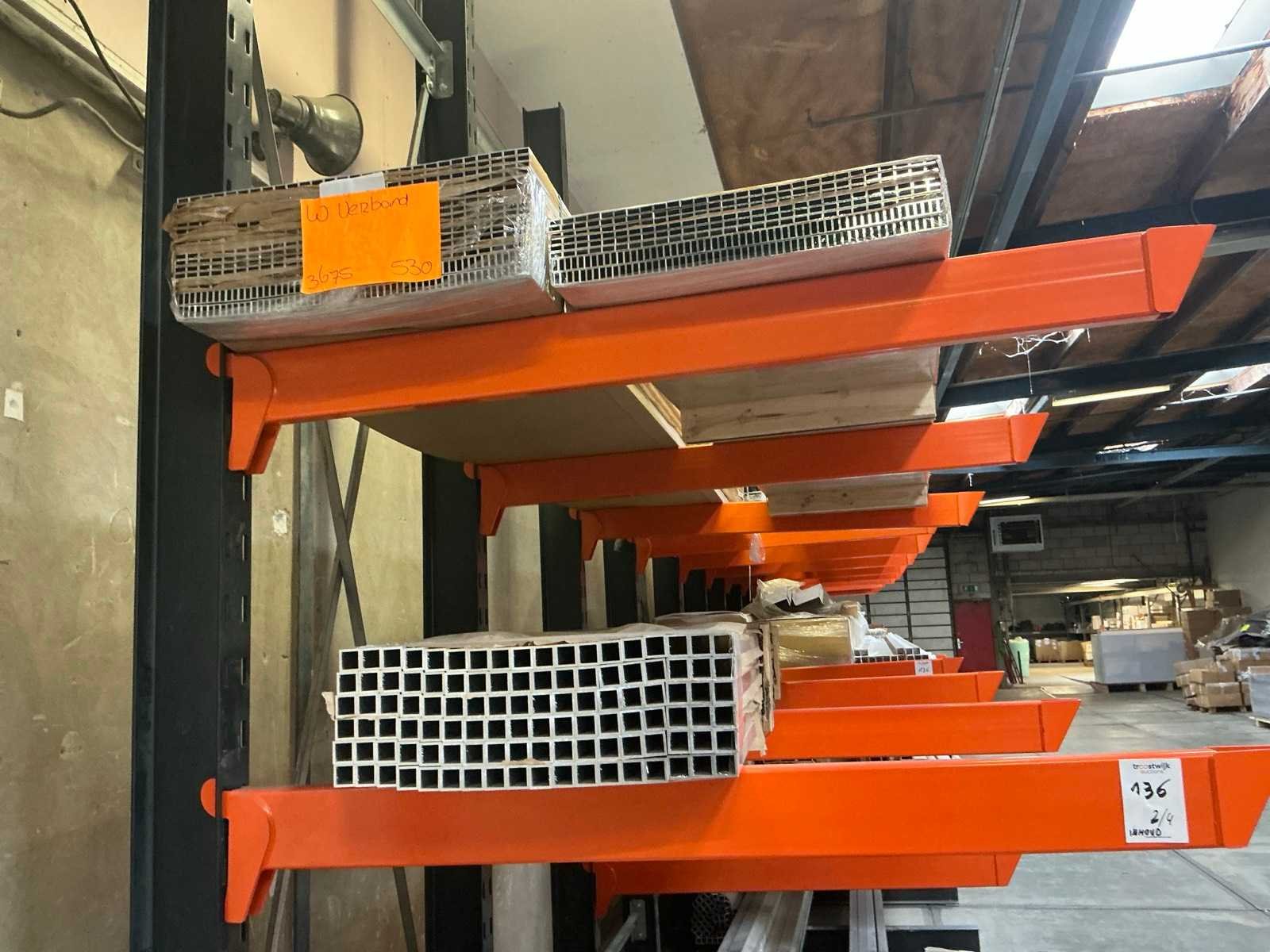 Inhoud van 4 draagarmstellingen; diverse types profielen; waaronder o.a. strip 20x3 mm; koker 30x30 mm; koker 35x35 mm; koker 60x25 mm; Lengtes variërend tussen 2000 - 6000 mm; ongebruikt materiaal