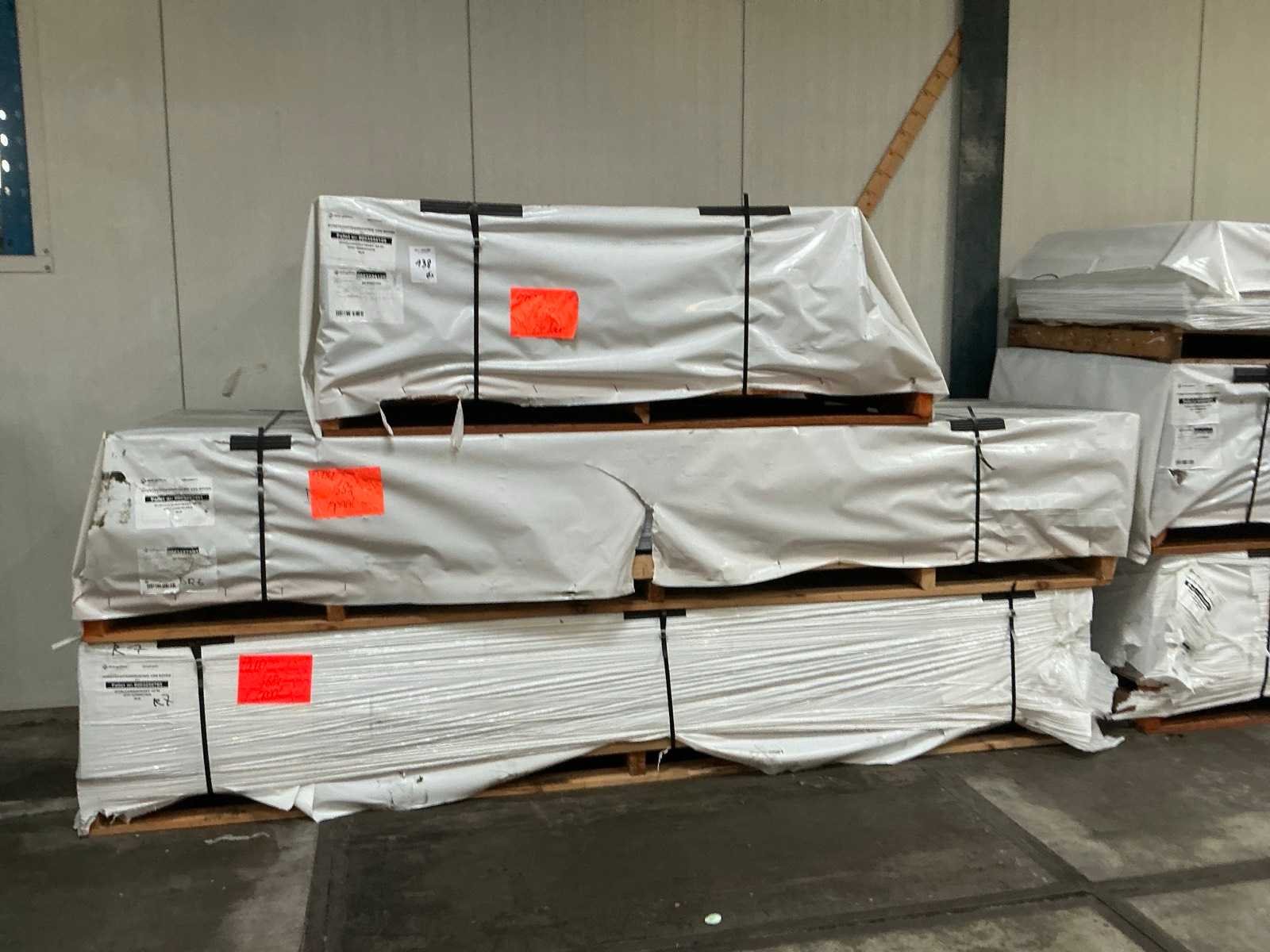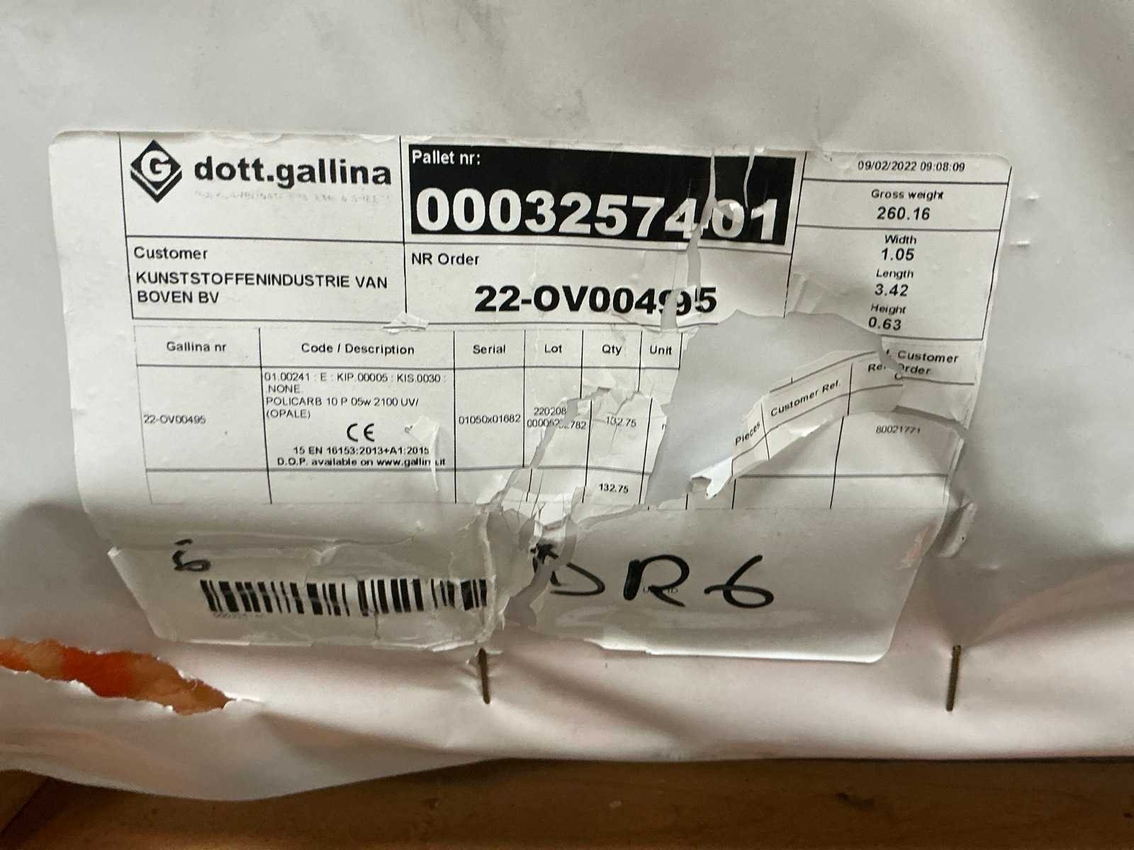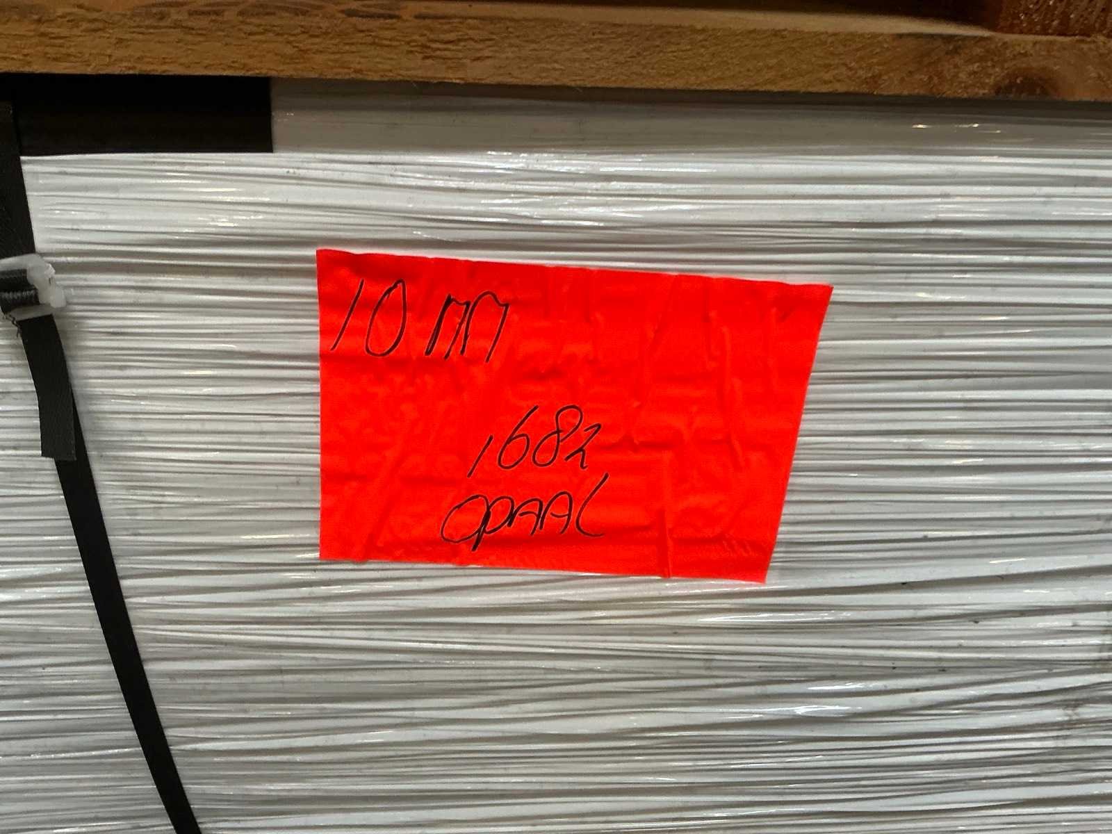 Dikte 10 mm; diverse types waaronder ca. 50x plaat 10 mm helder 1668 mm lengte; ca. 125x plaat 10 mm opaal 1682 mm lengte; ca. 100x plaat 10 mm helder 1668 mm lengte; ca. 45x plaat diverse lengtes; op 6 pallets Breedte: 105cm