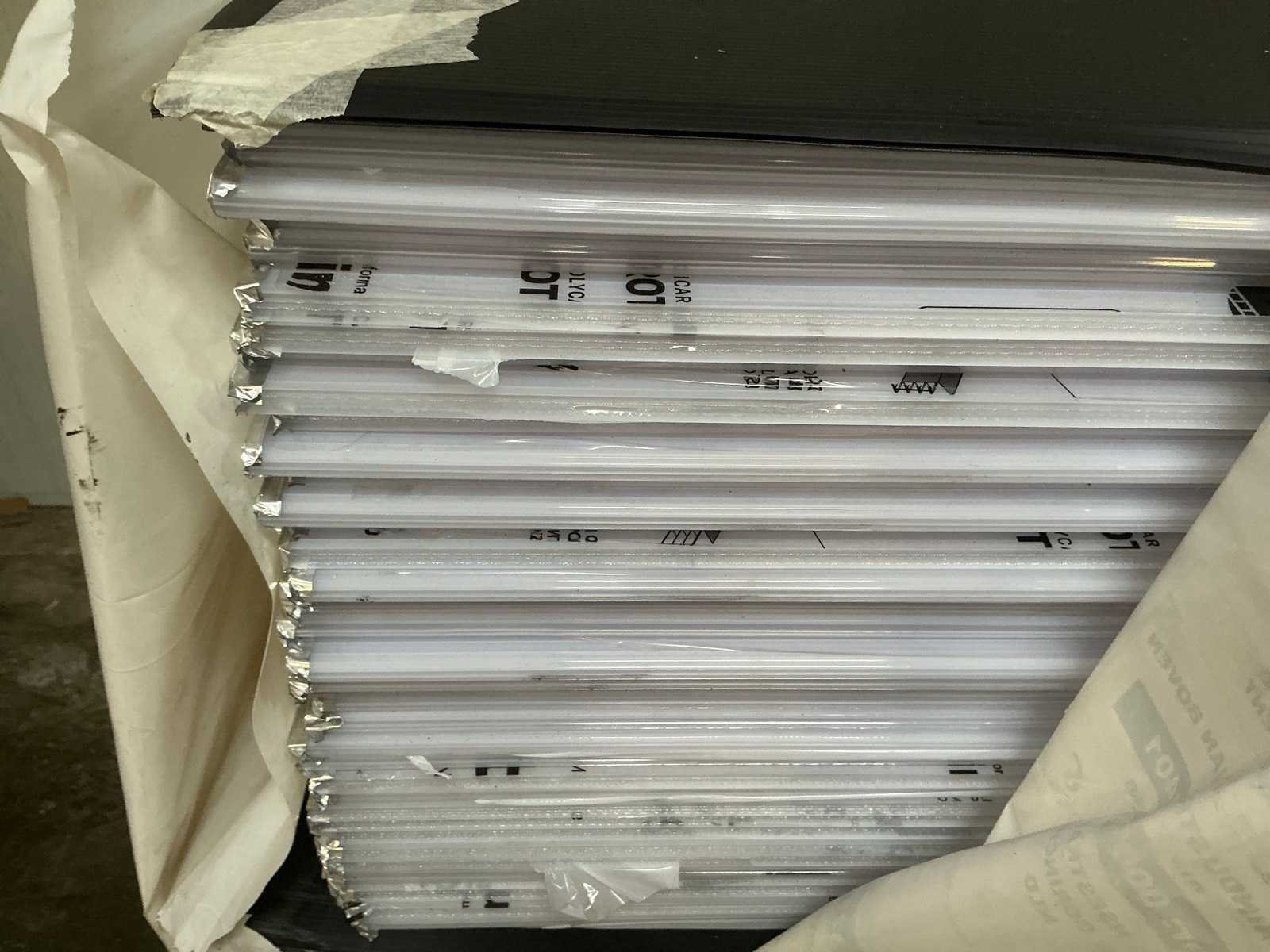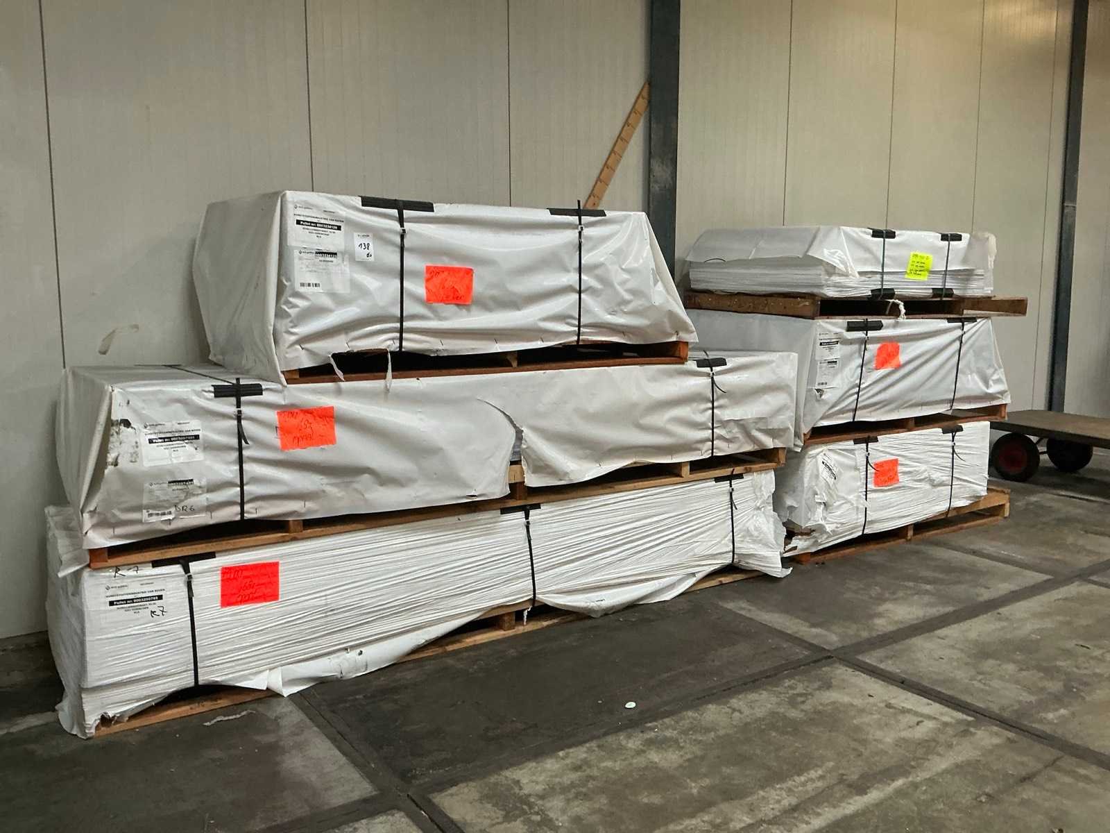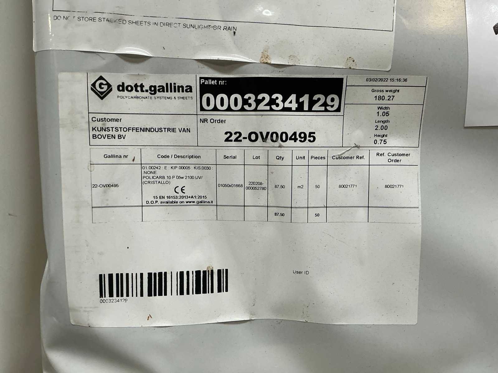 Dikte 10 mm; diverse types waaronder ca. 50x plaat 10 mm helder 1668 mm lengte; ca. 125x plaat 10 mm opaal 1682 mm lengte; ca. 100x plaat 10 mm helder 1668 mm lengte; ca. 45x plaat diverse lengtes; op 6 pallets Breedte: 105cm