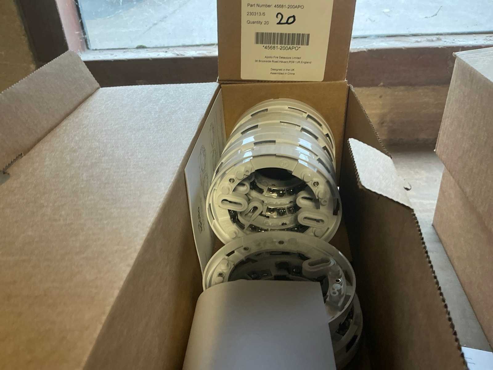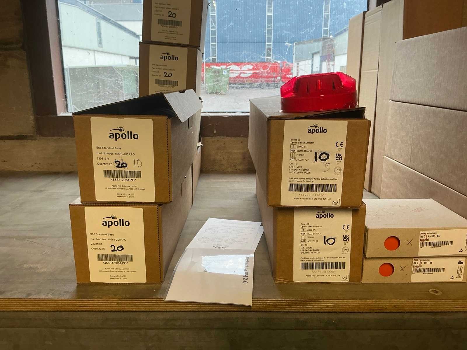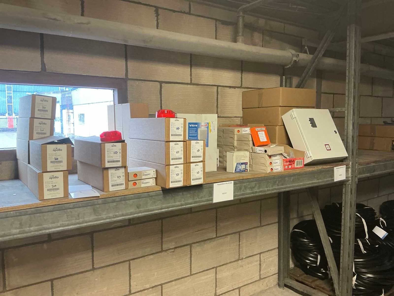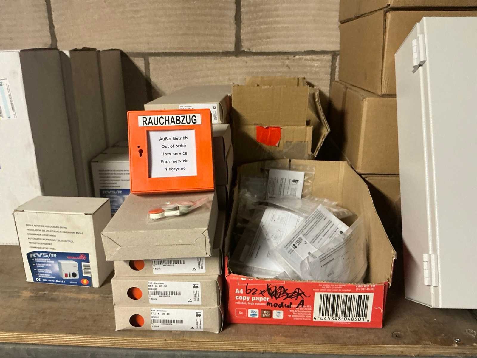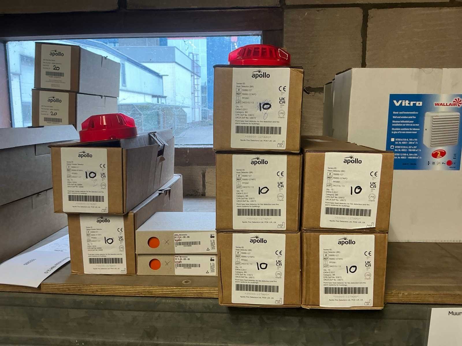 Diverse items waaronder ca. 80x Apollo rook detector; 4x brandcentrale; ca. 30x brand noodknop; ca. 3x Wallair Vitro ventilator met snelheidsregelaar