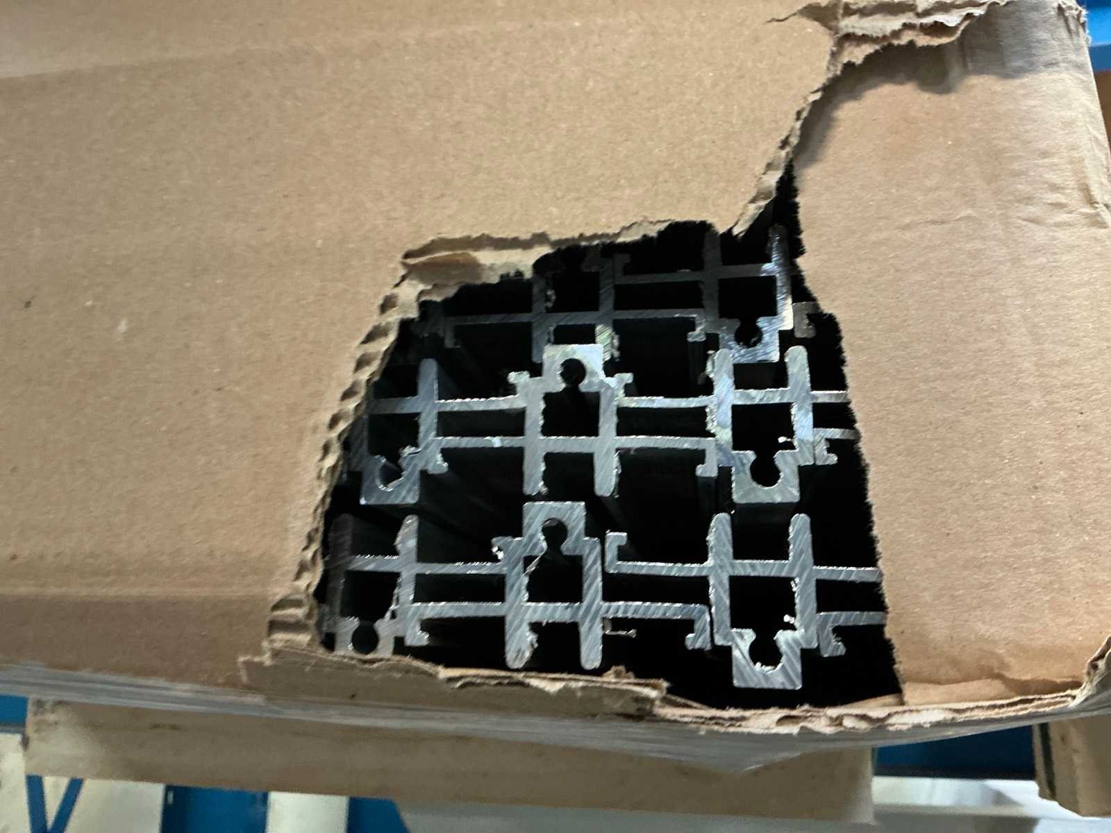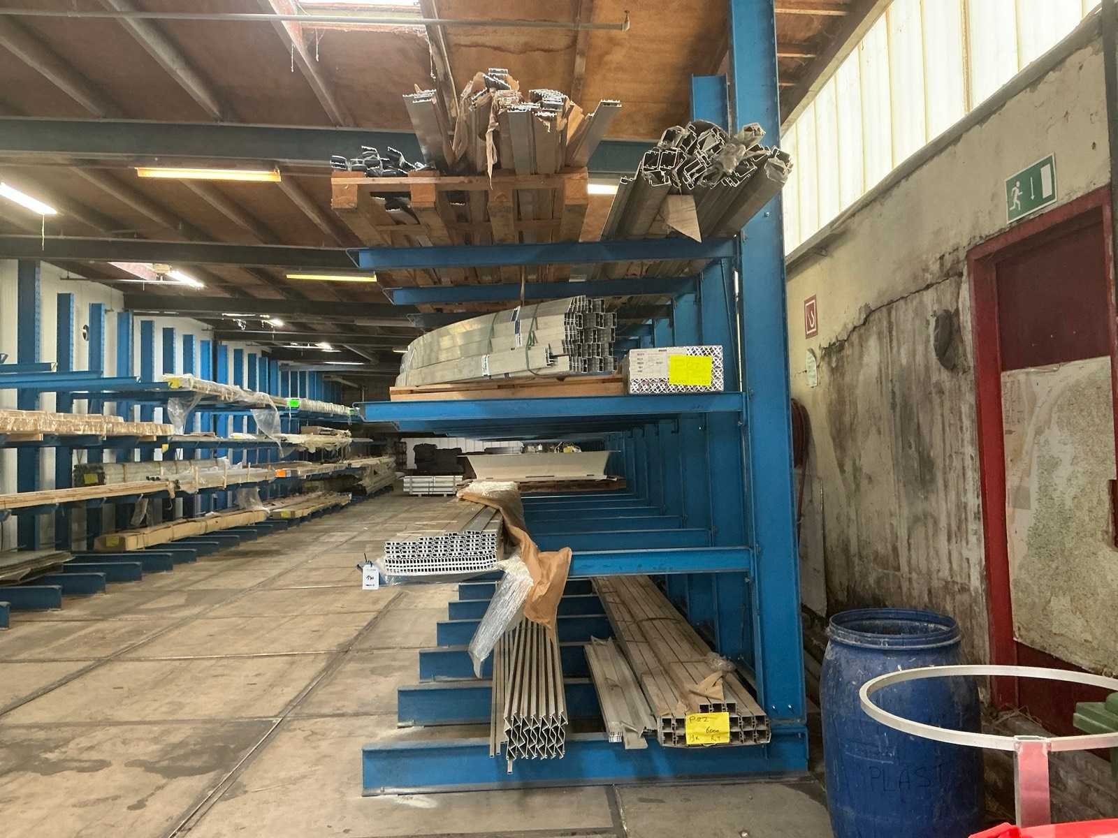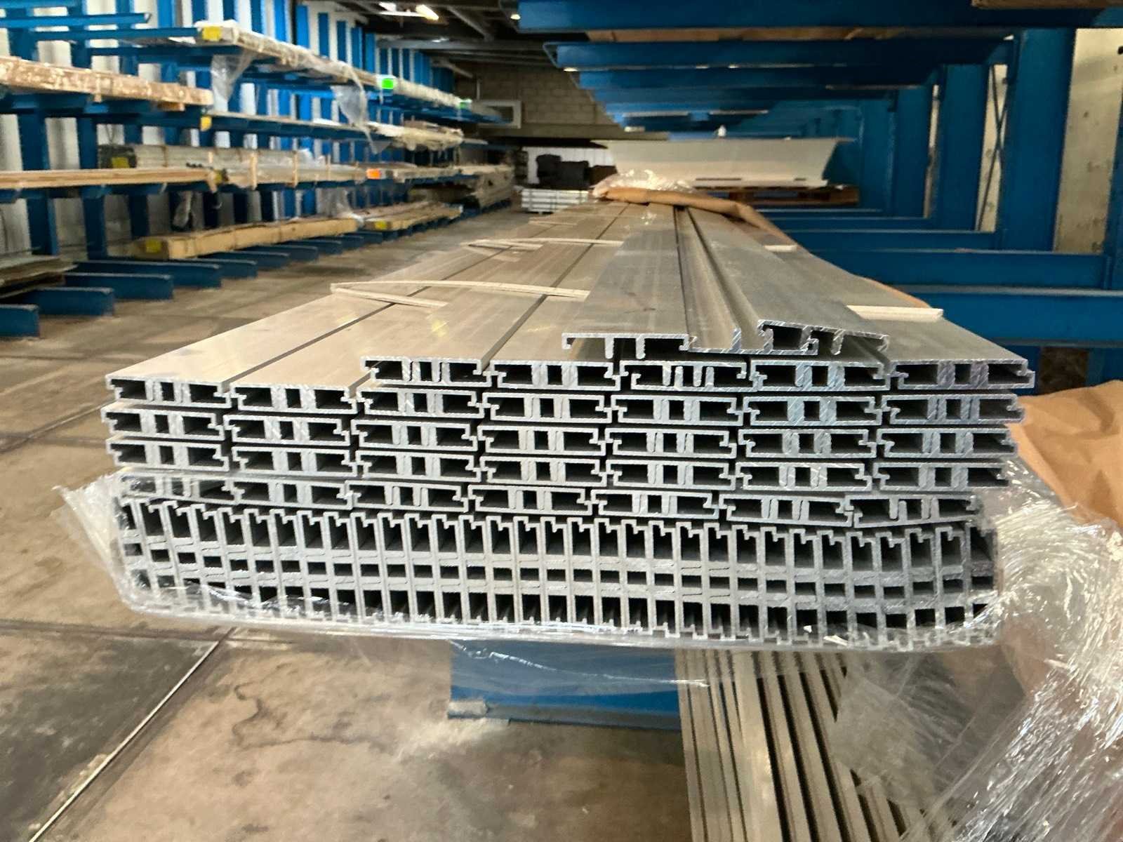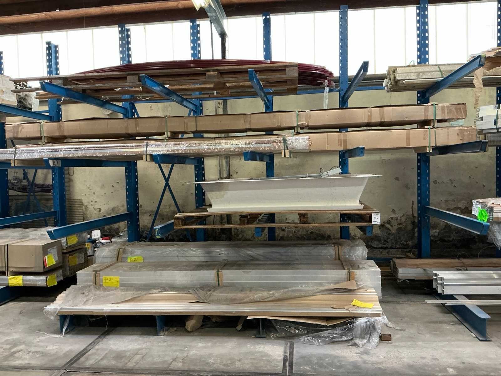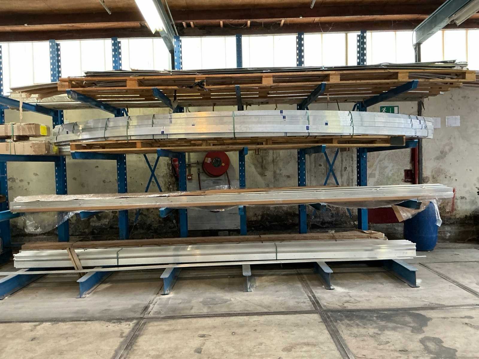 Inhoud van 2 draagarmstellingen waaronder: P 67, lengte: 5600mm à 80 stuks, P 22, lengte: 6000mm à 19 stuks, 1 pakket gebogen profielen, 1 dakluik, 1 pakket P 21, lengte: 3600mm à 90 stuks, 1 dito à 60 stuks, 1 pakket P 67, lengte: 5600mm à 66 stuks, 1 dito à 55 stuks, 1 pallet met rood gelakte gebogen profielen en diverse lengtes