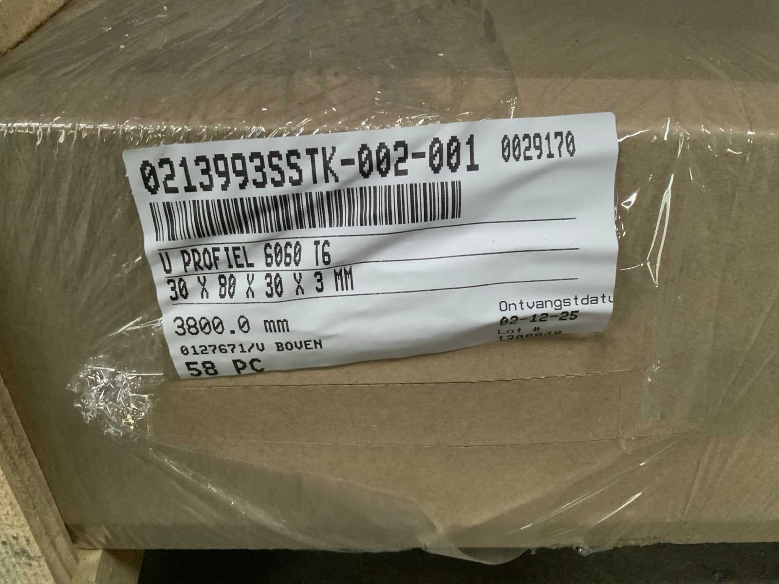 Waaronder: 1 pakket KP 16 aluminium profielen, lengte: 7000mm, 1 pakket aluminium U profiel, afmeting: 80 x30 x 3 x L 3800mm à 58 stuks, U-profiel, afmeting: 80 x 30 x 3 x L 3800mm à 50 stuks, 11 aluminium tranenplaten,. inclusief 3 chipwood platen
