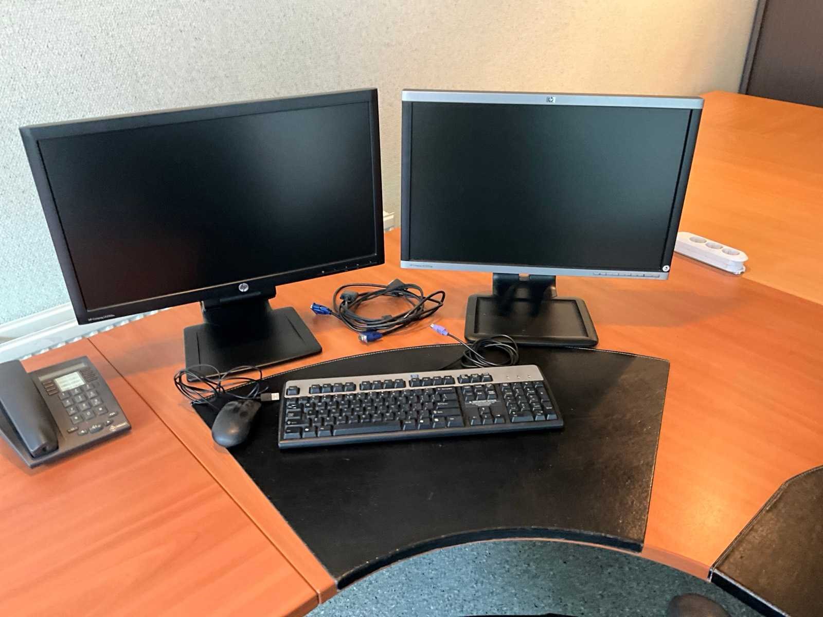 2 de hoekbureau afmetingen 180x180x75cm. Inclusief 3x archiefkast, 4x monitor diverse merken, 1x bureau met lade, vergadertafel met 7 stoelen , mobile airco Lengte: 220cm Breedte: 185cm Hoogte: 75cm