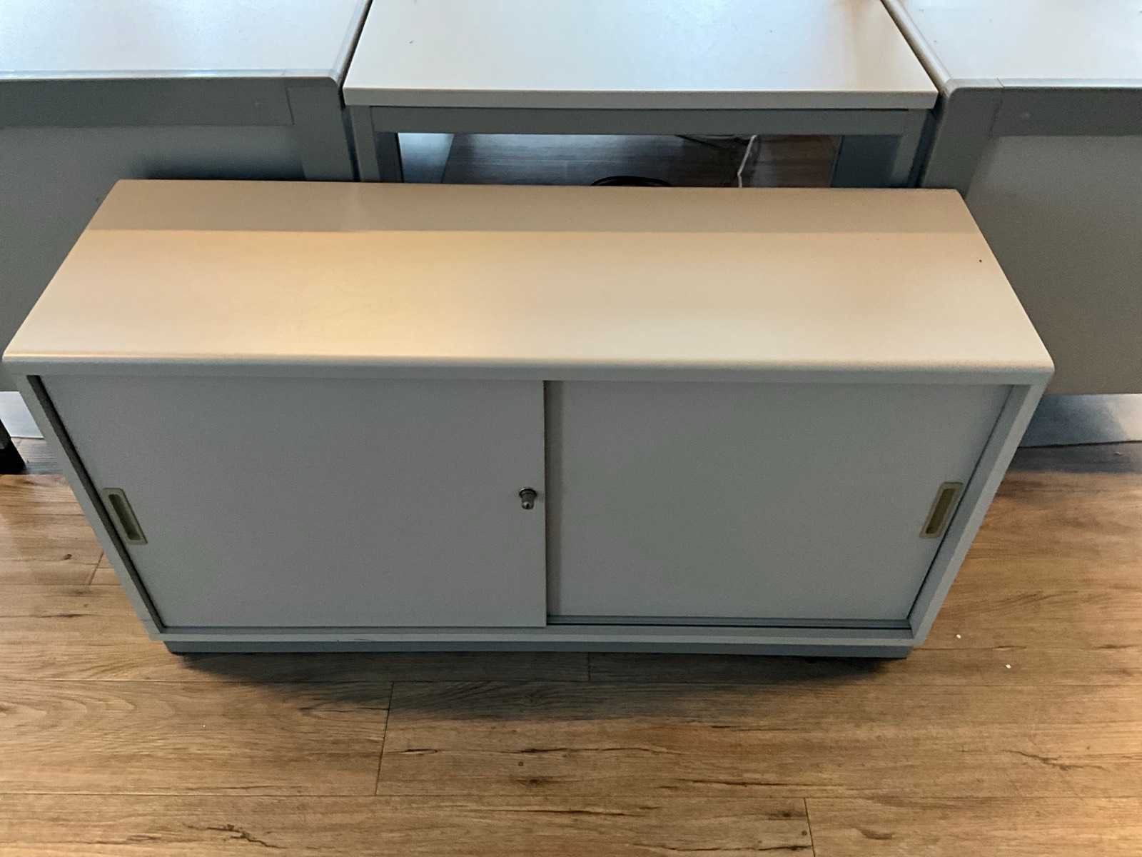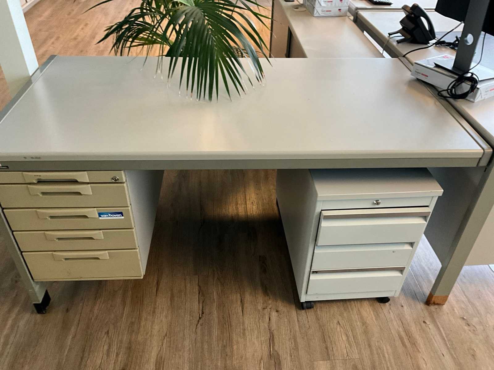 Inclusief 5x archiefkast met schuifdeur, 1x archiefkast met lade, diverse monitoren 2x Samsung , 3x HP , 1x Dell, 1x Philips. 3X bureaustoel, 3x bijzettafel bureau Merk: Assmann Kleur: Grijs Lengte: 80cm Breedte: 160cm Hoogte: 78cm Materiaal: Hout/metaal