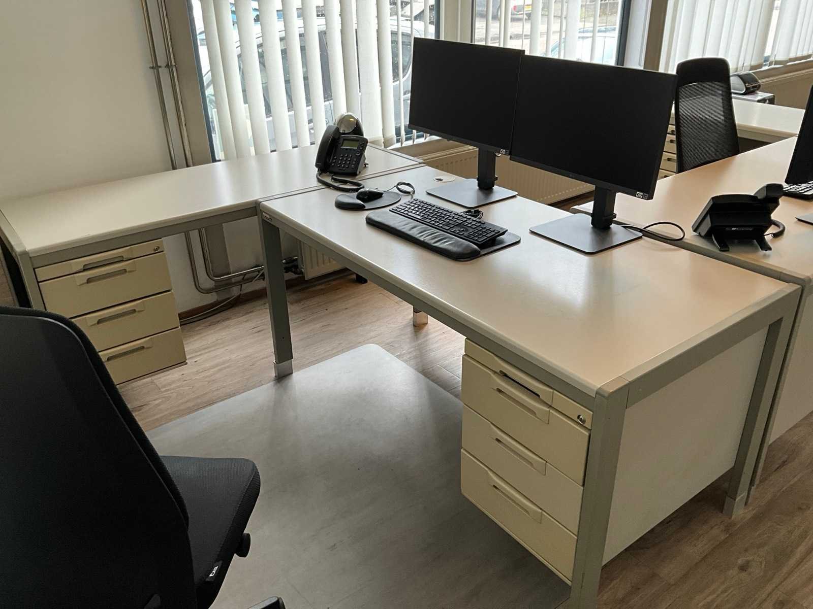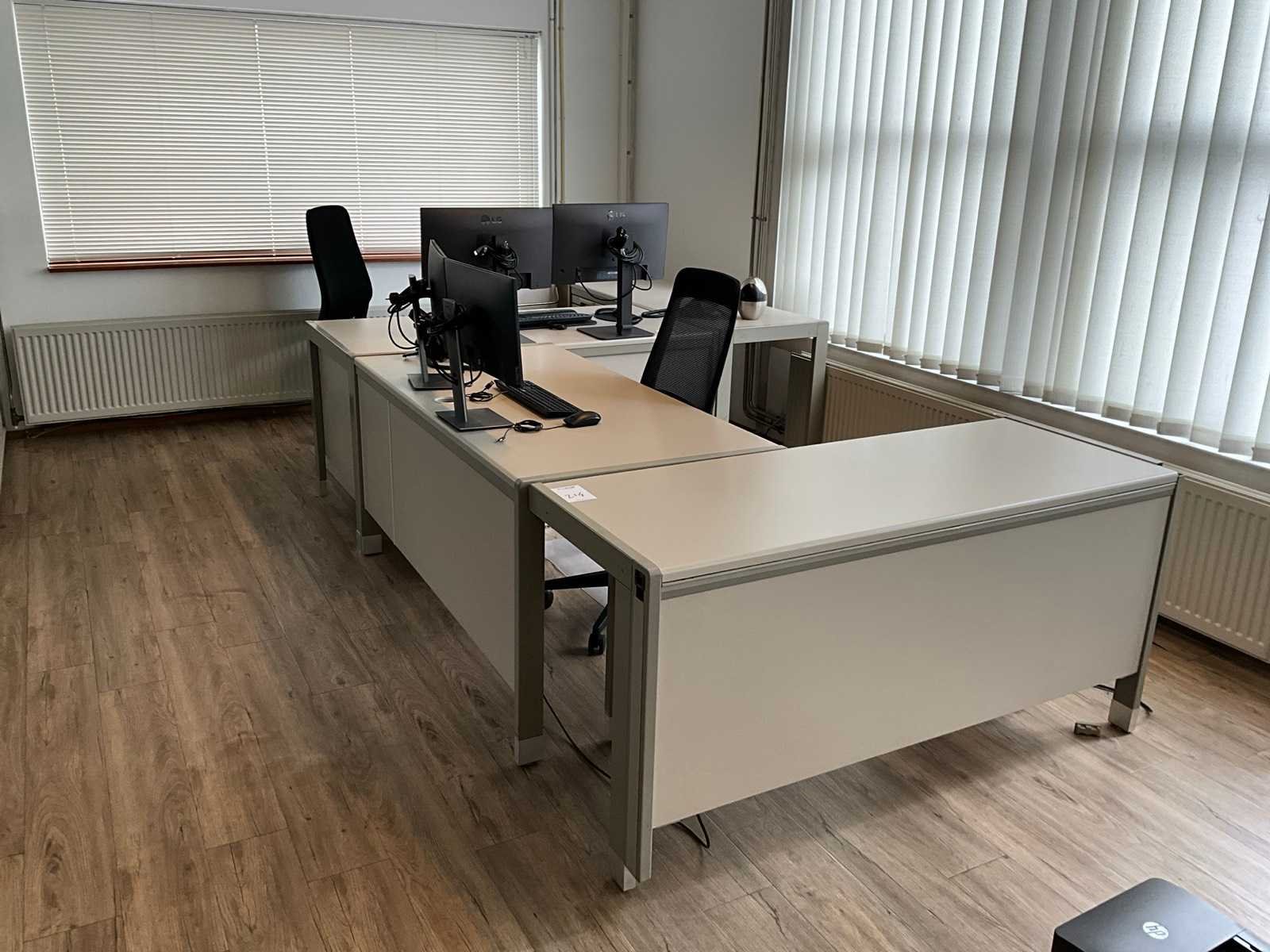 Inclusief 2x archiefkast met schuifdeur, 2x Dell monitor, 2x LG monitor, 3x bureaustoel, Merk: Assmann Kleur: Grijs Lengte: 160cm Breedte: 220cm Hoogte: 78cm