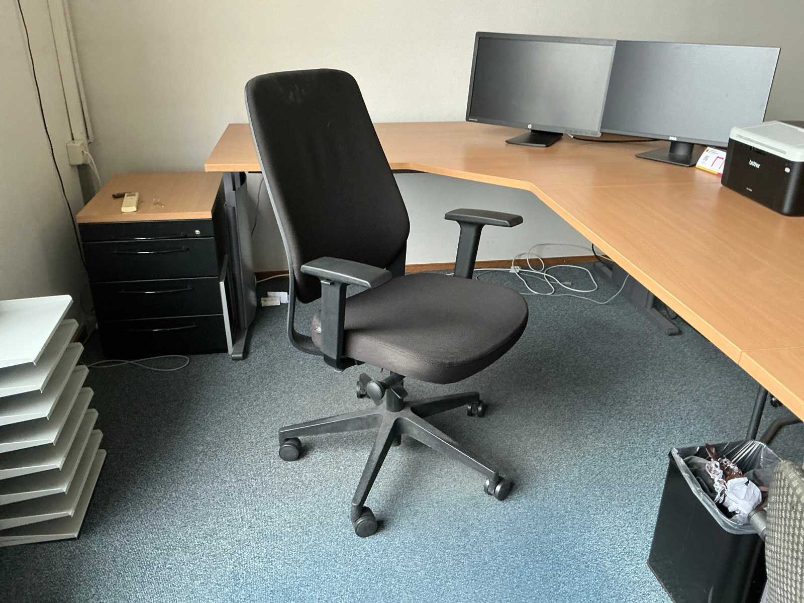 Inclusief archiefkast 271x46x133 cm; 2x monitor diverse merken, 4 diverse stoelen, ladenblok; Brother printer; Lengte: 335cm Breedte: 220cm Hoogte: 76cm