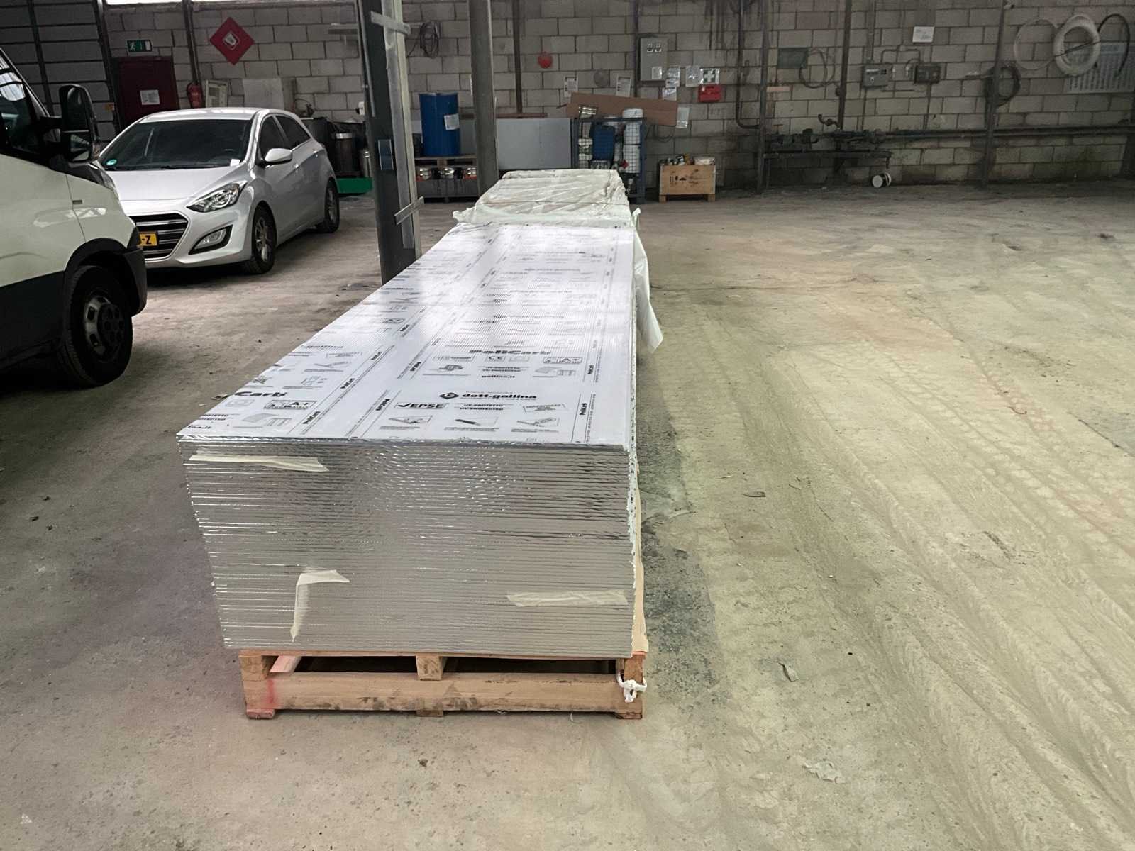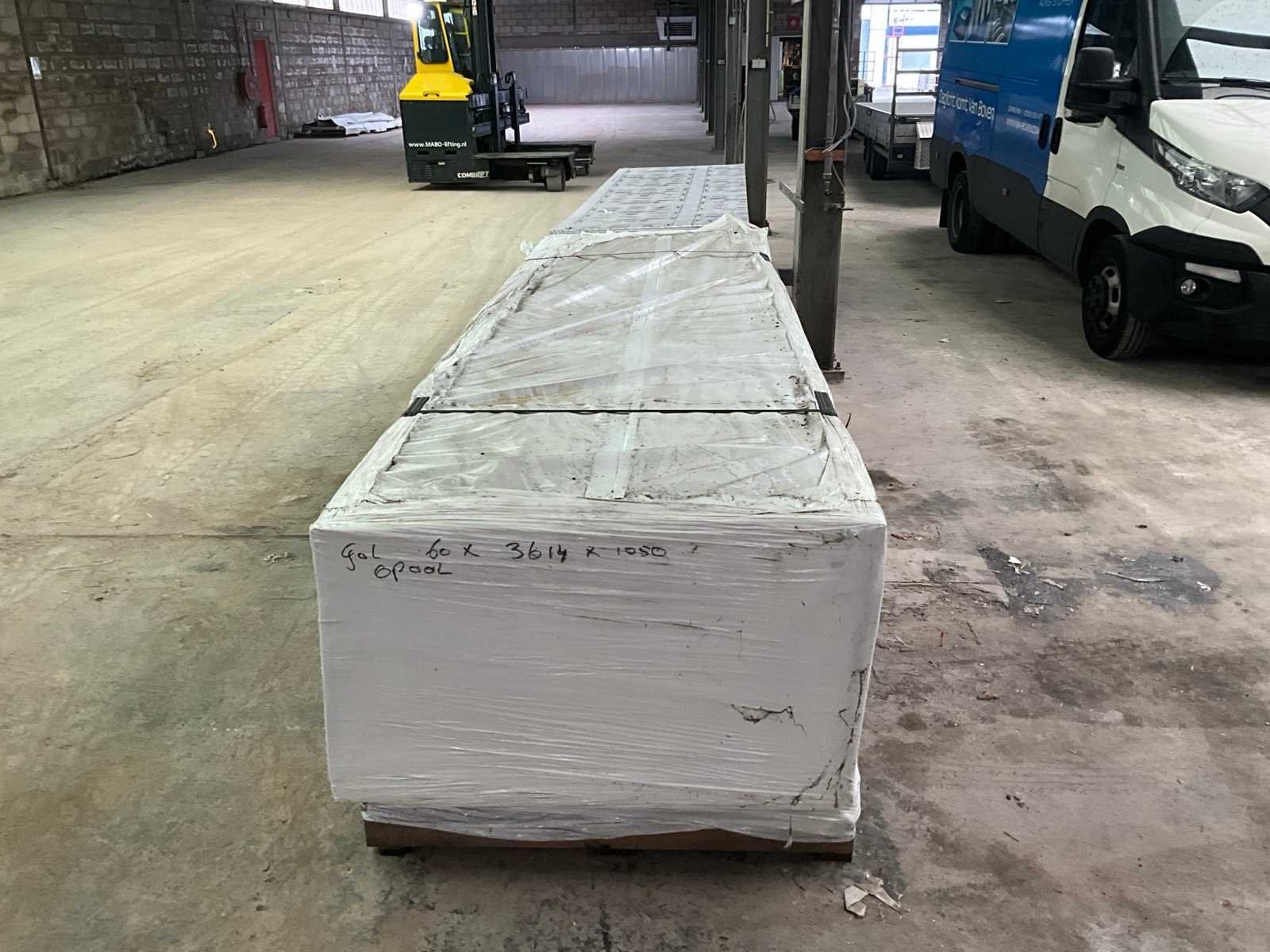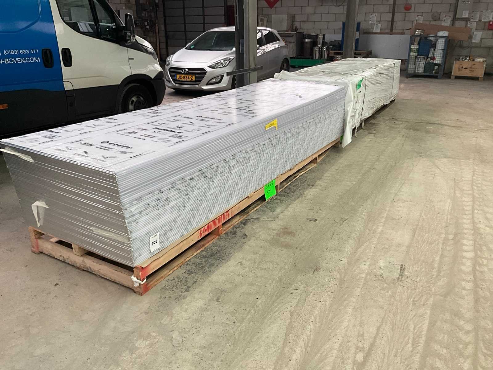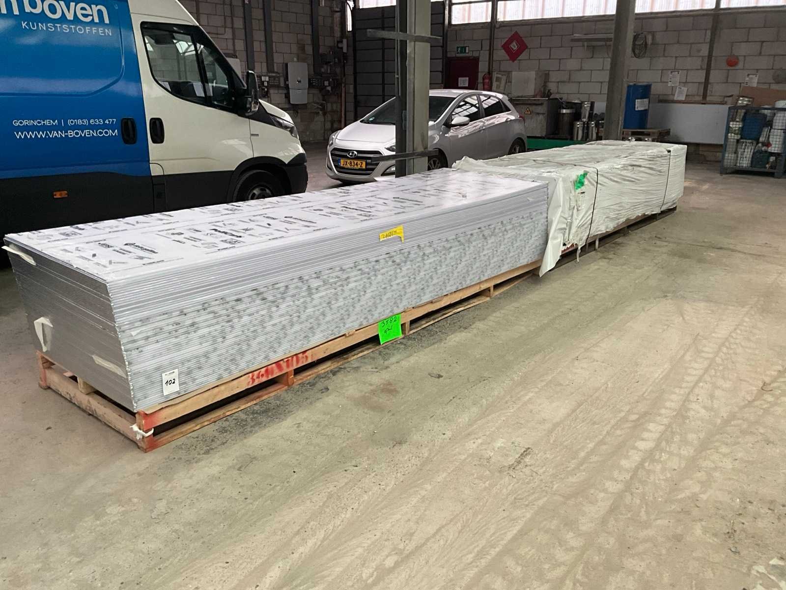 Ca. 58x plaat 1050x3582 mm; ca. 52x plaat 1050x3614 mm; Dikte ca. 16 mm; op 2 pallets Lengte: 358cm Breedte: 105cm