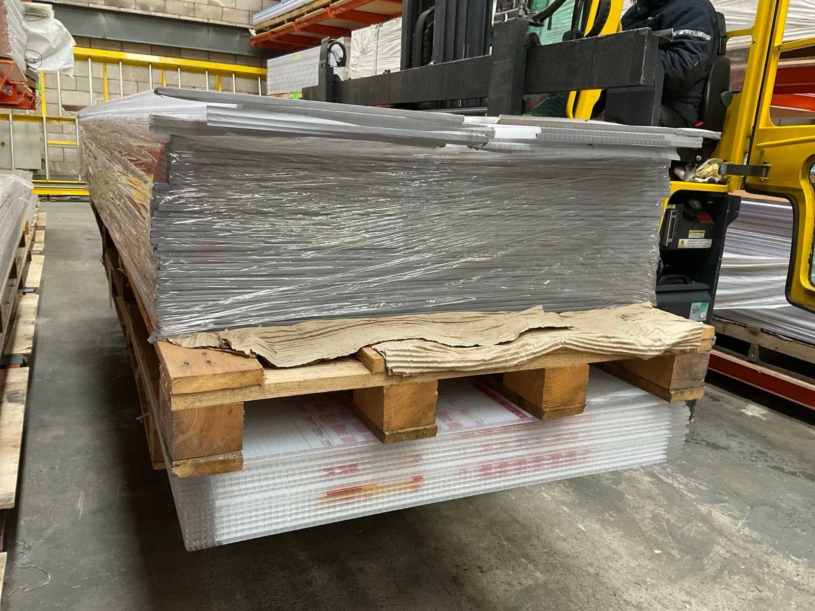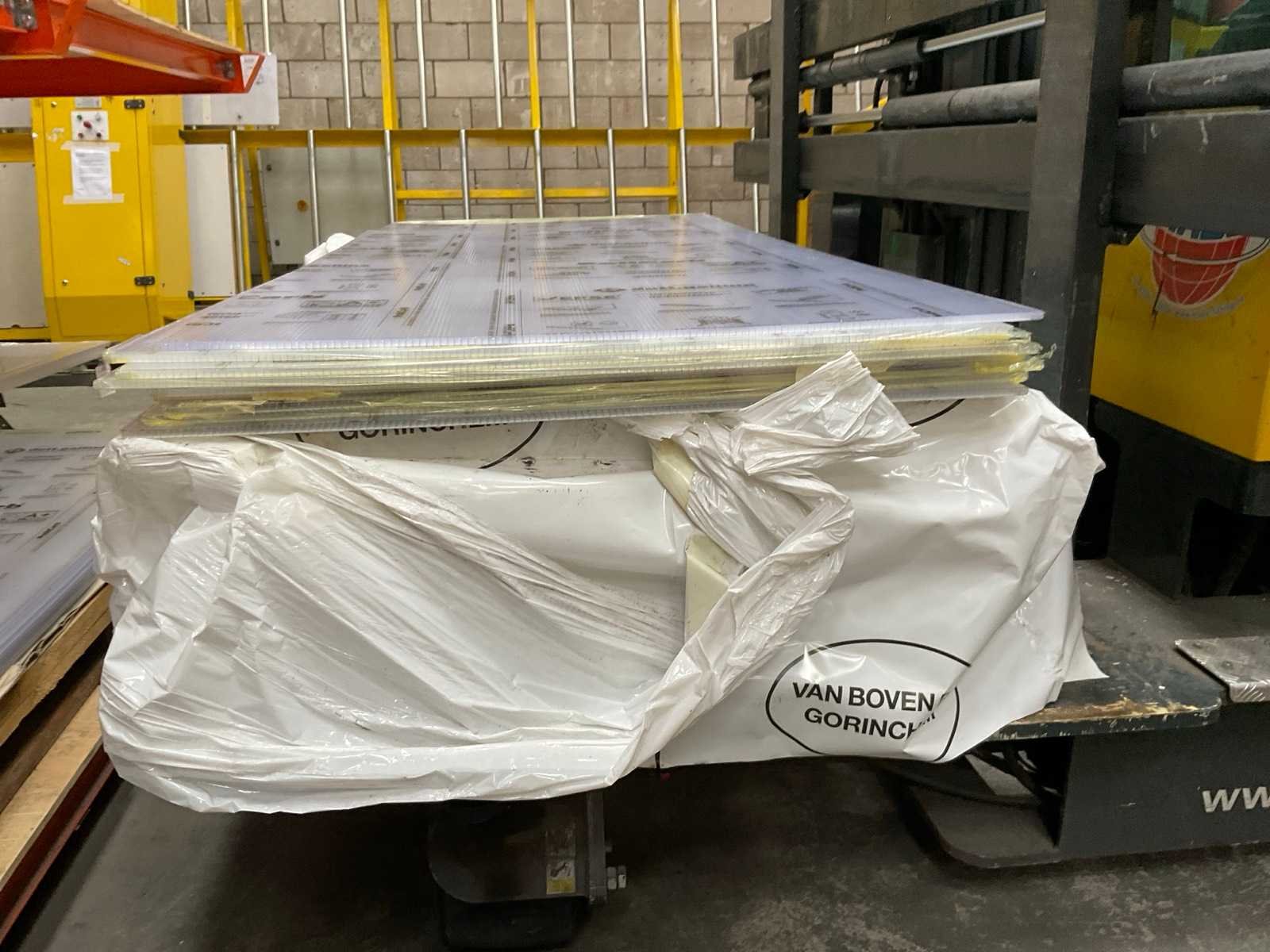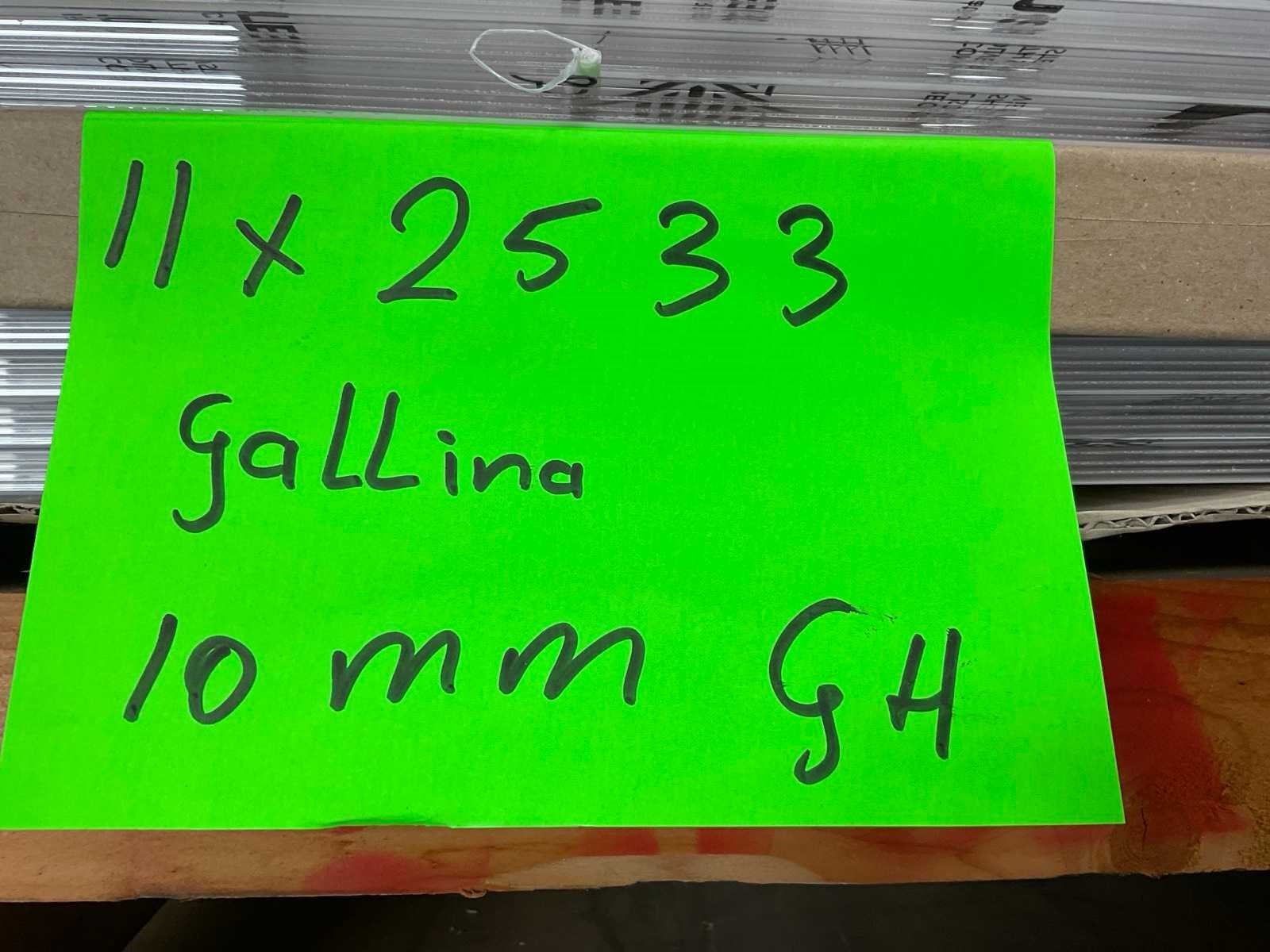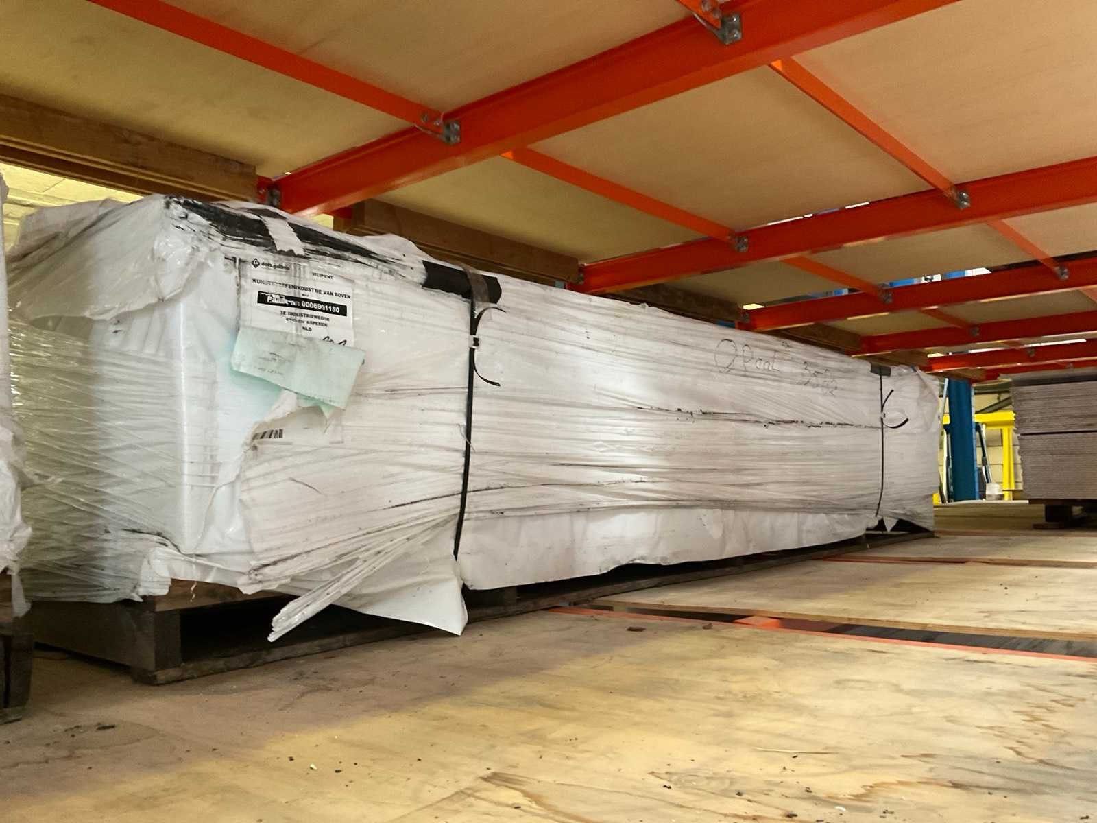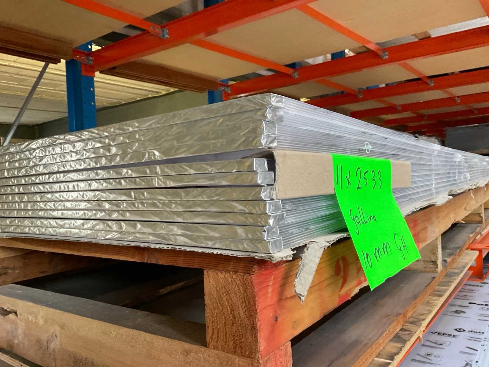 50x 1050x1590x10 mm; 17x 1050x2482; 10x 1050x2430x10 mm; 8x 1050x2680 mm; 15x 1050x4000x10 mm; 100x 1050x3582x10 mm; 32x 1050x3500x10 mm; 11x 1050x2533x10 mm. Inclusief 1x pallet half fabrikaat. Lengte: 1000cm Breedte: 105cm