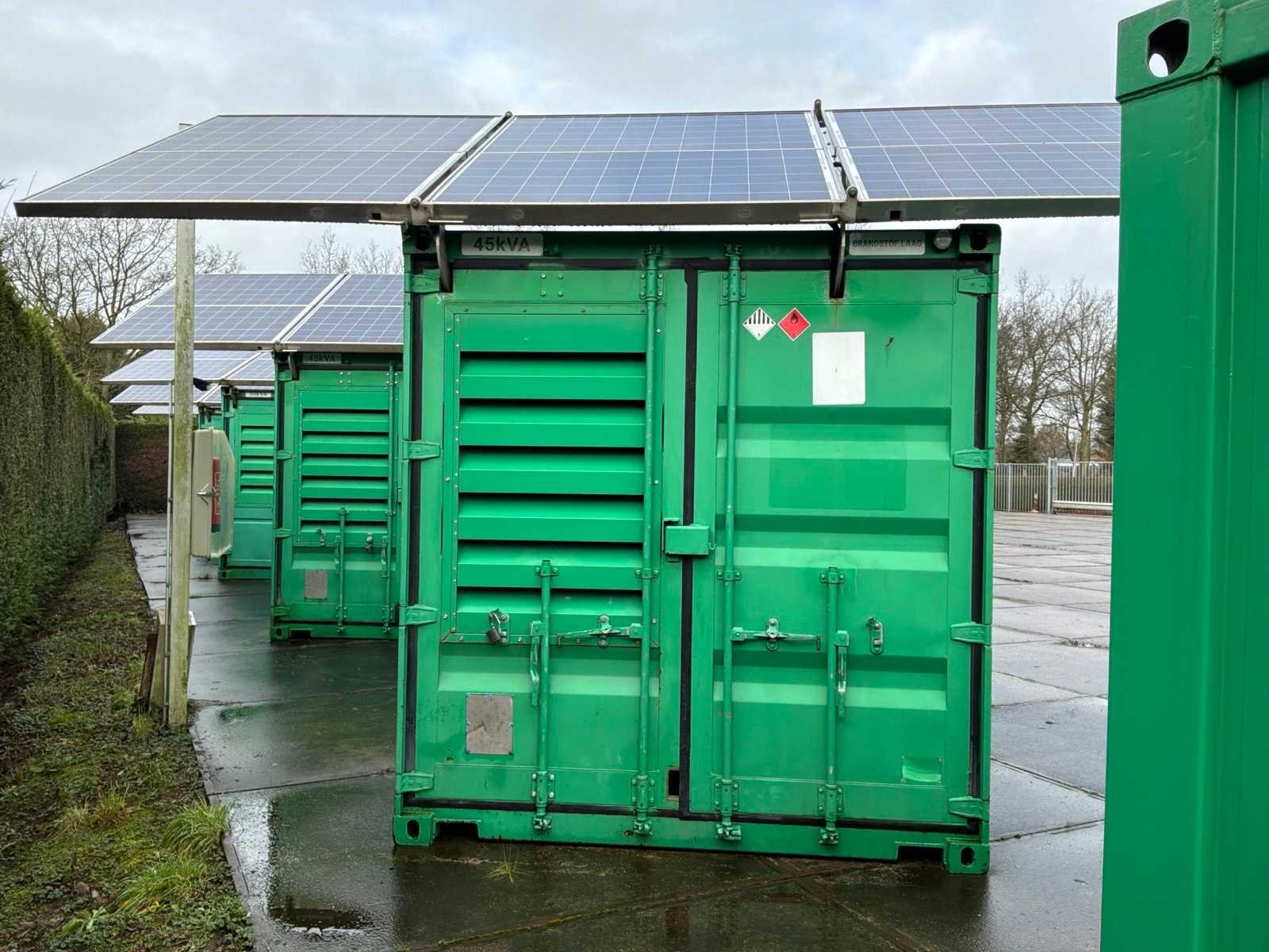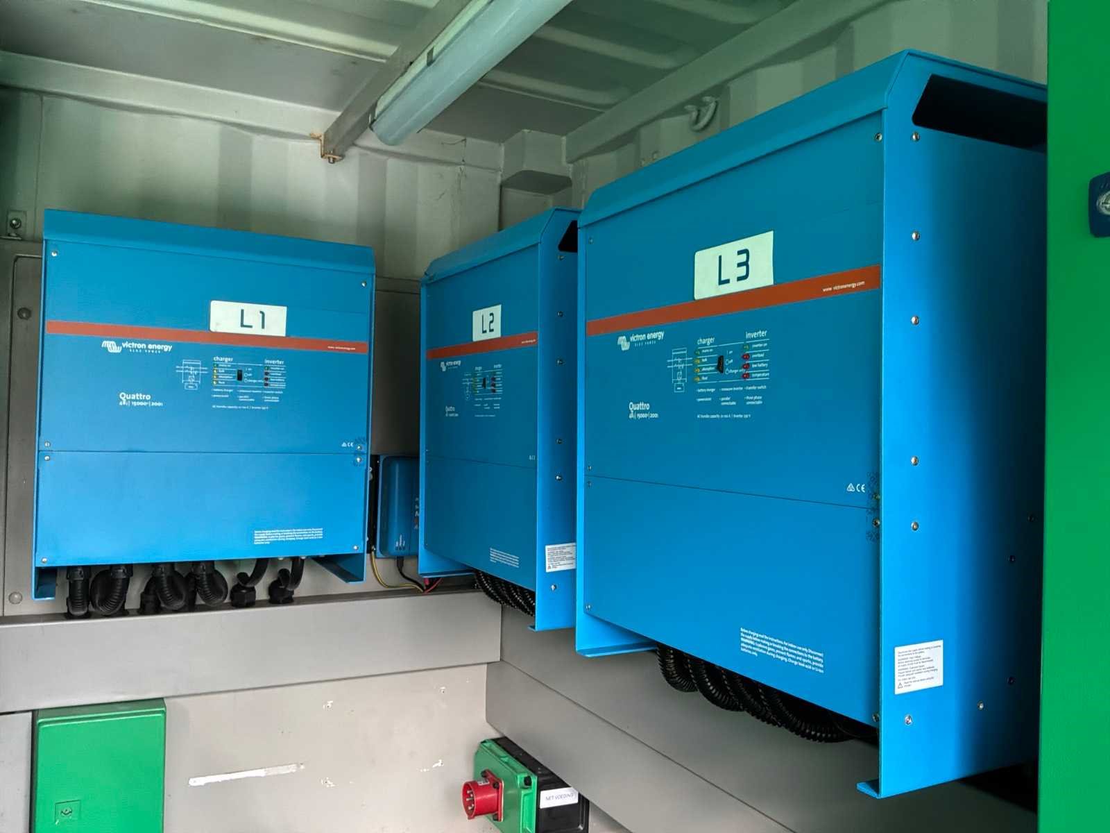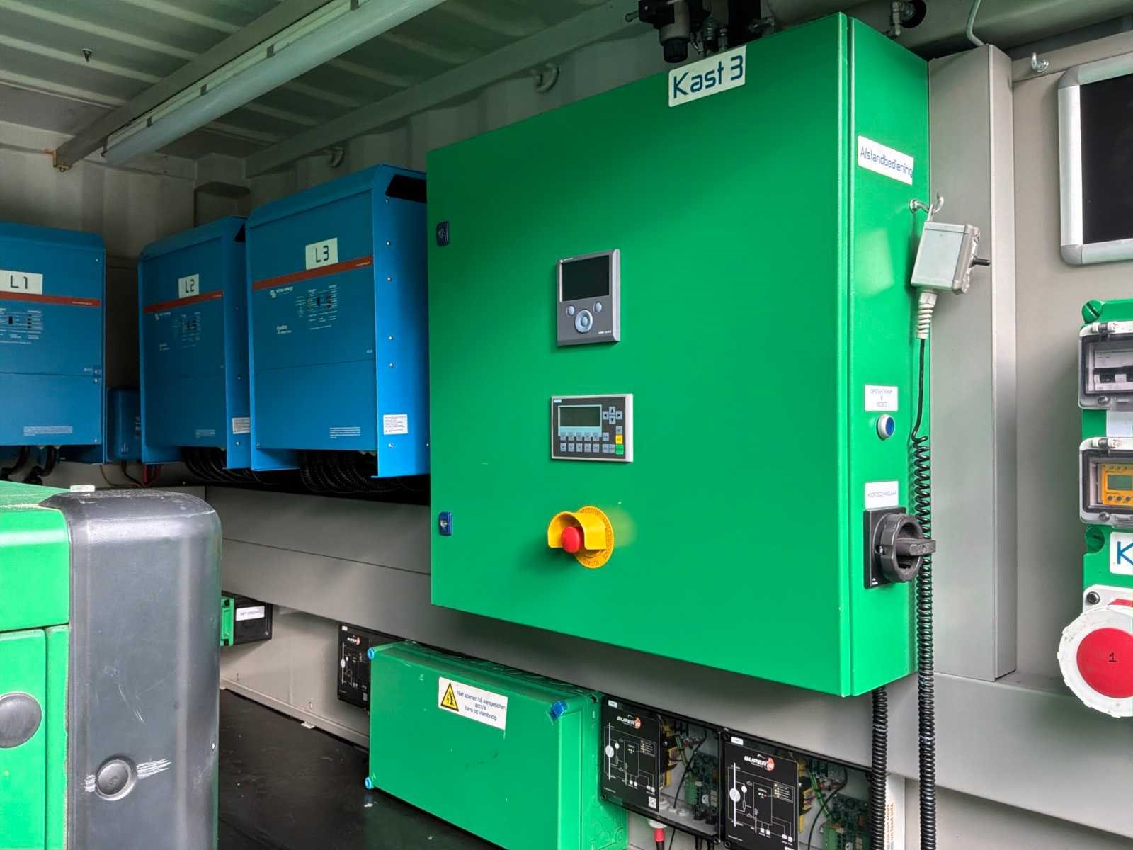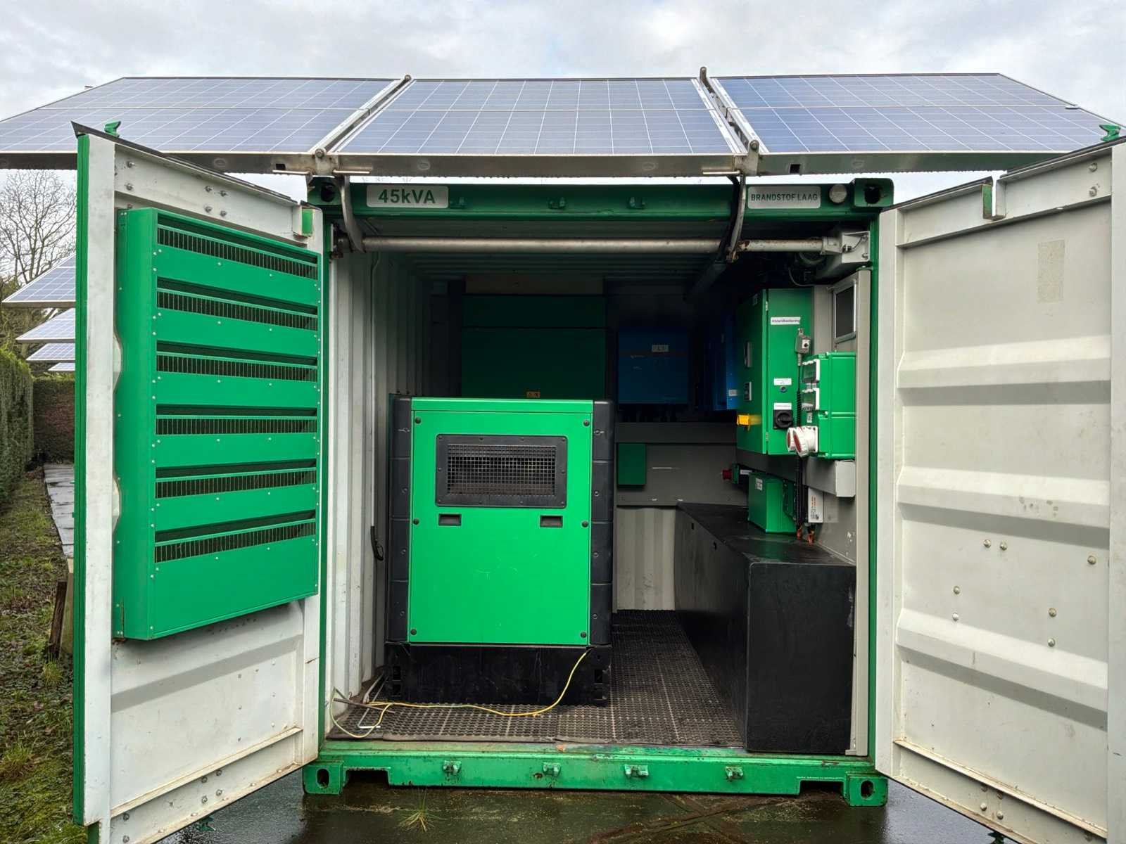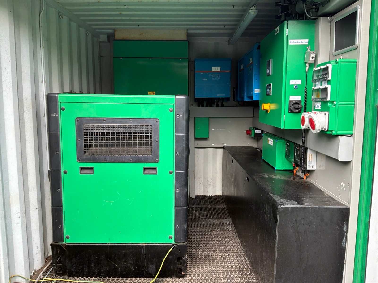 Gebouwd in container voorzien van opgebouwde zonnepanelen elektrisch uitklapbaar, 3x “Victron Energy” omvormer / lader type Quattro 48V/15000VA/200Amp 1x “Victron Energy” Smart solar charfe controller type MPPT150I85-Tr, centrale besturingskast met “Siemens” en “ Victron Energy” digitale controllers en 11x “Super B” lithium batterijen typeNomia 12V210Ah Merk: Caterpillar Type: DE65E3 Bouwjaar: 2019 Serienummer: CAT00C44PGT800500 Capaciteit.: 65kVA Motorcapaciteit: 52kW Generator capaciteit: 94A Totale afmeting L: 3000mm Totale afmeting Breedte: 2450mm Totale afmeting Hoogte: 3630mm